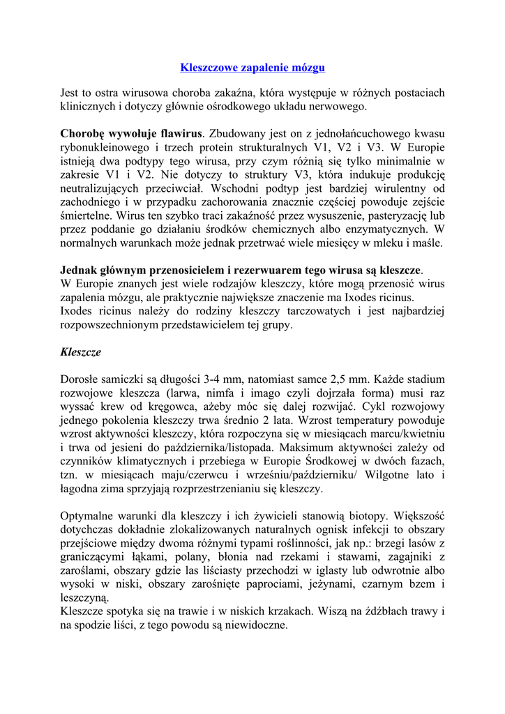 Kleszczowe zapalenie mózgu Jest to ostra wirusowa choroba zakaźna, która występuje w różnych postaciach klinicznych i dotyczy głównie ośrodkowego układu nerwowego. Chorobę wywołuje flawirus. Zbudowany jest on z jednołańcuchowego kwasu rybonukleinowego i trzech protein strukturalnych V1, V2 i V3. W Europie istnieją dwa podtypy tego wirusa, przy czym różnią się tylko minimalnie w zakresie V1 i V2. Nie dotyczy to struktury V3, która indukuje produkcję neutralizujących przeciwciał. Wschodni podtyp jest bardziej wirulentny od zachodniego i w przypadku zachorowania znacznie częściej powoduje zejście śmiertelne. Wirus ten szybko traci zakaźność przez wysuszenie, pasteryzację lub przez poddanie go działaniu środków chemicznych albo enzymatycznych. W normalnych warunkach może jednak przetrwać wiele miesięcy w mleku i maśle. Jednak głównym przenosicielem i rezerwuarem tego wirusa są kleszcze. W Europie znanych jest wiele rodzajów kleszczy, które mogą przenosić wirus zapalenia mózgu, ale praktycznie największe znaczenie ma Ixodes ricinus. Ixodes ricinus należy do rodziny kleszczy tarczowatych i jest najbardziej rozpowszechnionym przedstawicielem tej grupy. Kleszcze Dorosłe samiczki są długości 3-4 mm, natomiast samce 2,5 mm. Każde stadium rozwojowe kleszcza (larwa, nimfa i imago czyli dojrzała forma) musi raz wyssać krew od kręgowca, ażeby móc się dalej rozwijać. Cykl rozwojowy jednego pokolenia kleszczy trwa średnio 2 lata. Wzrost temperatury powoduje wzrost aktywności kleszczy, która rozpoczyna się w miesiącach marcu/kwietniu i trwa od jesieni do października/listopada. Maksimum aktywności zależy od czynników klimatycznych i przebiega w Europie Środkowej w dwóch fazach, tzn. w miesiącach maju/czerwcu i wrześniu/październiku/ Wilgotne lato i łagodna zima sprzyjają rozprzestrzenianiu się kleszczy. Optymalne warunki dla kleszczy i ich żywicieli stanowią biotopy. Większość dotychczas dokładnie zlokalizowanych naturalnych ognisk infekcji to obszary przejściowe między dwoma różnymi typami roślinności, jak np.: brzegi lasów z graniczącymi łąkami, polany, błonia nad rzekami i stawami, zagajniki z zaroślami, obszary gdzie las liściasty przechodzi w iglasty lub odwrotnie albo wysoki w niski, obszary zarośnięte paprociami, jeżynami, czarnym bzem i leszczyną. Kleszcze spotyka się na trawie i w niskich krzakach. Wiszą na źdźbłach trawy i na spodzie liści, z tego powodu są niewidoczne. Zachorowania są związane na ogół z ogniskami przyrodniczymi, w których wirus krąży między zwierzętami (gryzonie, zwierzyna leśna, ptaki wędrowne) i przenosicielami wirusa, którymi są kleszcze. Cykl ten zachodzi niezależnie od człowieka. Ukąszenia Typowymi miejscami ukąszenia u człowieka są głowa, uszy, miejsca zagięcia dużych stawów, ręce i nogi. Ponieważ ślina kleszczy posiada właściwości znieczulające, ukąszenie na ogół nie zostaje zauważone i dlatego też bardzo często osoby z zachorowaniem na kleszczowe zapalenie mózgu nie przypominają sobie momentu ukąszenia. Zachorowania Zachorowania na kleszczowe zapalenie mózgu i opon mózgowo-rdzeniowych wykazują dwa nasilenia z mniej więcej 4 tygodniowym opóźnieniem w stosunku do aktywności kleszczy, tzn jedno, maksimum zachorowań w miesiącach czerwcu/lipcu i drugie w październiku. Chorują dzieci i dorośli w wieku od 3 do 80 lat, najczęściej w wieku 15-50 lat. U części osób choroba może przebiegać łagodnie i tylko badanie krwi potwierdza zakażenie. W innych przypadkach przebieg jest dwufazowy. Pierwsza faza choroby pojawia się po 7-14 dniach od kontaktu z kleszczem i przebiega z gorączką oraz objawami podobnymi do grypy. Objawy te utrzymują się około tygodnia. Po kilku dniach lepszego samopoczucia występuje druga faza choroby z bólami głowy, gorączką, wymiotami, nudnościami, utratą przytomności i zespołem objawów neurologicznych. Leczenie i zapobieganie Nie ma leczenia przyczynowego kleszczowego zapalenia mózgu. Leczy się tylko wywołanie wirusem. Objawy zwykle ustępują po 2-3 tygodniach i pacjent zdrowieje. Choroba może przebiegać ciężko, gdy wystąpią objawy mózgowe, móżdżkowe lub rdzeniowe, rzadko ma przebieg śmiertelny, czasem stwierdza się następstwa pochorobowe pod postacią niedowładów, depresji, zaniku mięśni lub stałych bólów głowy. Jedynym sposobem uniknięcia przykrych skutków choroby jest zapobieganie. W tym celu konieczne jest stosowanie kilku prostych zasad. Należy: nosić odpowiednią odzież w lesie zakrywającą jak najwięcej części ciała; jak najszybciej usunąć kleszcza ze skóry, stosować środki odstraszające kleszcze, gotować mleko pochodzące od krów, kóz i owiec, unikać pobytu w rejonach zakażonych kleszczy, po wizycie w lesie dokładnie obejrzeć całe ciało. Jeżeli zauważysz ukąszenie, natychmiast delikatnie usuń kleszcza – uchwyć pęsetą za główkę i pociągnij. Miejsce ukłucia zdezynfekuj. Stosowanie wymienionych zasad zmniejsza prawdopodobieństwo ukąszenia i zakażenia. Jednak najpewniejszym sposobem zabezpieczenia się jest szczepienie ochronne. Szczepienia Szczepienia zaleca się osobom przebywającym na terenach endemicznych: zatrudnionym przy eksploatacji lasów, stacjonującemu w lasach wojsku, rolnikom, młodzieży odbywającej praktyki oraz turystom, uczestnikom obozów i kolonii. Szczepienia przeciw kzm jest zalecane przez Ministerstwo Zdrowia. Dla zapewnienia odpowiedniego zabezpieczenia niezbędne jest uodpornienie podstawowe przez podanie szczepionki. Żeby szczepionka działała pewnie i długoczasowo, pobudza się układ obronny organizmu do tworzenia ciał obronnych przez trzy etapowe szczepienie. Później podawane jest szczepienie przypominające. Co trzy lata wykonuje się jedno szczepienie przypominające. W ten sposób zapewnisz sobie właściwe zabezpieczenie. Na terenach zagrożonych powinno się szczepić d