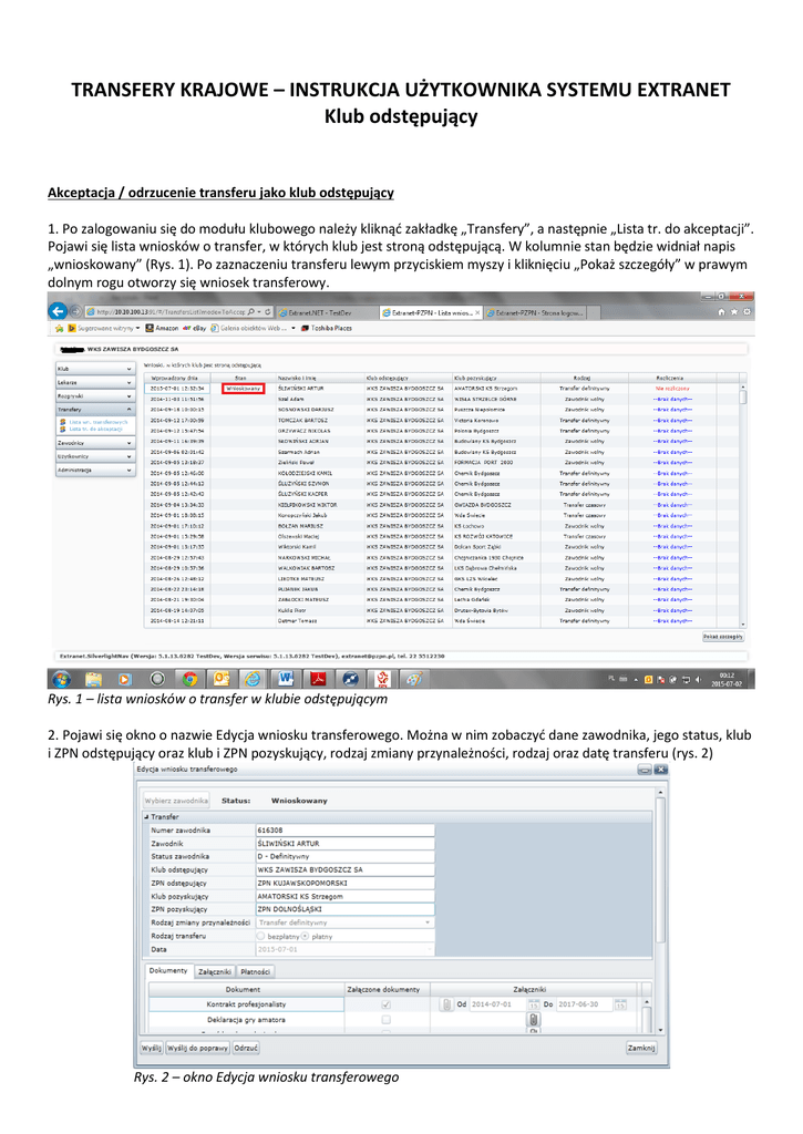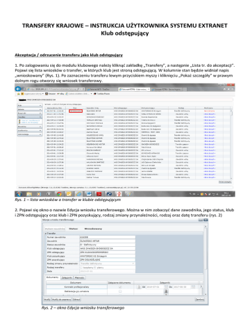 TRANSFERY KRAJOWE – INSTRUKCJA UŻYTKOWNIKA SYSTEMU EXTRANET Klub odstępujący Akceptacja / odrzucenie transferu jako klub odstępujący 1. Po zalogowaniu się do modułu klubowego należy kliknąć zakładkę „Transfery”, a następnie „Lista tr. do akceptacji”. Pojawi się lista wniosków o transfer, w których klub jest stroną odstępującą. W kolumnie stan będzie widniał napis „wnioskowany” (Rys. 1). Po zaznaczeniu transferu lewym przyciskiem myszy i kliknięciu „Pokaż szczegóły” w prawym dolnym rogu otworzy się wniosek transferowy. Rys. 1 – lista wniosków o transfer w klubie odstępującym 2. Pojawi się okno o nazwie Edycja wniosku transferowego. Można w nim zobaczyć dane zawodnika, jego status, klub i ZPN odstępujący oraz klub i ZPN pozyskujący, rodzaj zmiany przynależności, rodzaj oraz datę transferu (rys. 2) Rys. 2 – okno Edycja wniosku transferowego 3. W dolnej części wniosku znajduje się wykaz dokumentów załączonych przez klub pozyskujący (Rys. 3). Aby obejrzeć załączniki, należy przejść do zakładki Załączniki (Rys. 3 nr 1), a żeby obejrzeć szczegóły płatności w przypadku transferu płatnego należy kliknąć na zakładkę Płatności (Rys. 3 nr 2). Rys. 3 – szczegóły wniosku 4. Pobieranie załączników odbywa się za pomocą kliknięcia prawym przyciskiem myszy na danym załączniku, a następnie kliknięciu przycisku Pobierz (Rys. 4). To otworzy okno zapisu pliku na komputerze. Administratorzy klubu odstępującego nie mogą pobrać jedynego rodzaju załącznika, jakim jest kontrakt profesjonalisty. Rys. 4 – zakładka do pobierania dokumentów 5. Szczegóły płatności w trzeciej zakładce są dostępne jedynie do odczytu (Rys. 5). Rys. 5 – okno szczegółów płatności (pojawia się wyłącznie w przypadku transferu płatnego) 6. Po zapoznaniu się z widocznymi szczegółami transferu oraz pobranymi załącznikami, administrator klubu odstępującego za pomocą przycisków w lewym dolnym rogu wniosku może: a) zaakceptować wniosek i tym samym automatycznie przesłać go do dalszego postępowania w odstępującym ZPN (Rys. 5 nr 1) b) przesłać wniosek ponownie do klubu pozyskującego celem poprawy (Rys. 5 nr 2) To działanie otworzy okno służące do wpisania uwag o brakujących dokumentach lub błędach we wniosku (Rys. 6) Rys. 6 – okno uwag do wniosku transferowego wysyłanego do poprawy c) całkowicie odrzucić wniosek o transfer (Rys. 5 nr 3)