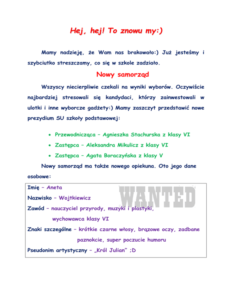Hej, hej! To znowu my:) Mamy nadzieję, że Wam nas brakowało:) Już jesteśmy i szybciutko streszczamy, co się w szkole zadziało. Nowy samorząd Wszyscy niecierpliwie czekali na wyniki wyborów. Oczywiście najbardziej stresowali się kandydaci, którzy zainwestowali w ulotki i inne wyborcze gadżety:) Mamy zaszczyt przedstawić nowe prezydium SU szkoły podstawowej: Przewodnicząca – Agnieszka Stachurska z klasy VI Zastępca – Aleksandra Mikulicz z klasy VI Zastępca – Agata Boraczyńska z klasy V Nowy samorząd ma także nowego opiekuna. Oto jego dane osobowe: Imię – Aneta Nazwisko – Wojtkiewicz Zawód – nauczyciel przyrody, muzyki i plastyki, wychowawca klasy VI Znaki szczególne – krótkie czarne włosy, brązowe oczy, zadbane paznokcie, super poczucie humoru Pseudonim artystyczny – „Król Julian” ;D Udało nam się przeprowadzić wywiad z panią Anetą: Redakcja „Szkoły pod lupą”: Jak się Pani współpracuje z nowym prezydium SU? Pani Aneta: Bardzo dobrze! Dziewczyny mają dużo pomysłów i są odpowiedzialne – jeśli je o coś proszę, mogę liczyć, że sprawa będzie załatwiona. Red.: Czy są już sprecyzowane plany działalności SU na ten rok szkolny? P. Aneta: SU bierze udział we wszystkich szkolnych apelach i uroczystościach. Ponadto: Zbieramy nakrętki na rehabilitację Szymona; Dokarmiamy szkolnego kota; Będziemy zbierać „Górę grosza”; Zorganizujemy zbiórkę żywności dla potrzebujących we współpracy z Bankiem Żywności w Olsztynie. Red.: Mamy jeszcze jedno pytanie, o sprawę, która budzi wśród uczniów duże emocje. Chodzi o strój galowy. Jak, Pani zdaniem, powinien on wyglądać? P. Aneta: Dziewczyny: biała koszula, czarna lub granatowa spódnica (tzw. długość królewska czyli przed kolano), białe rajstopy, a latem białe podkolanówki i odpowiednie buty – na pewno odpadają sportowe, doradzam baleriny:) Chłopcy: biała koszula, czarne lub granatowe spodnie, odpowiednie buty – mokasyny lub pantofle. Red.: A, jeśli możemy spytać, skąd wziął się pseudonim „Król Julian”? P. Aneta: Po Madagaskaru” używam prostu i jego umiem głosu bardzo lubię naśladować na lekcji, film króla wtedy „Pingwiny Juliana. z Czasem uczniowie lepiej zapamiętują nawet trudne wiadomości. Red.: Dziękujemy za rozmowę! Klasa VI też była w Teatrze Lalek 27 września byliśmy na spektaklu „Fałszywa księżniczka”. Niestety, nie byliśmy tak zachwyceni jak klasa V po „Chłopcach z Placu Broni”, chociaż niektórzy uważali, że sztuka była poruszająca i dała wiele do myślenia. Po przedstawieniu Adam i Mateusz na każde pytanie odpowiadali tak jak Fałszywa Księżniczka czyli „oczywiście”, czym – OCZYWIŚCIE – denerwowali wszystkich. Dzień Chłopaka Wszyscy chłopcy dostali prezenty – w klasie VI kubki z autografami dziewczyn, a w klasie V hantle, UWAGA, różowe!!! To jednak nie zniechęciło ich do treningu :-) I to by było na tyle;) – do zobaczenia za … jakiś czas… :)