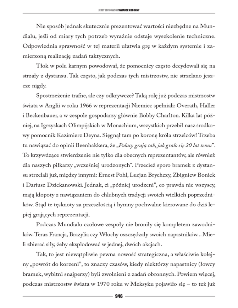 ´ JERZY LECHOWSKI SWIADEK KORONNY Nie sposób jednak skutecznie prezentować wartości niezbędne na Mundialu, jeśli od miary tych potrzeb wyraźnie odstaje wyszkolenie techniczne. Odpowiednia sprawność w tej materii ułatwia grę w każdym systemie i zamierzoną realizację zadań taktycznych. Tłok w polu karnym powodował, że pomocnicy często decydowali się na strzały z dystansu. Tak często, jak podczas tych mistrzostw, nie strzelano jeszcze nigdy. Spostrzeżenie trafne, ale czy odkrywcze? Taką rolę już podczas mistrzostw świata w Anglii w roku 1966 w reprezentacji Niemiec spełniali: Overath, Haller i Beckenbauer, a w zespole gospodarzy głównie Bobby Charlton. Kilka lat później, na Igrzyskach Olimpijskich w Monachium, wszystkich przebił nasz środkowy pomocnik Kazimierz Deyna. Sięgnął tam po koronę króla strzelców! Trzeba tu nawiązać do opinii Beenhakkera, że „Polacy grają tak, jak grało się 20 lat temu”. To krzywdzące stwierdzenie nie tylko dla obecnych reprezentantów, ale również dla naszych piłkarzy „wcześniej urodzonych”. Przecież sporo bramek z dystansu strzelali już, między innymi: Ernest Pohl, Lucjan Brychczy, Zbigniew Boniek i Dariusz Dziekanowski. Jednak, ci „później urodzeni”, co prawda nie wszyscy, mają kłopoty z nawiązaniem do chlubnych tradycji swoich wielkich poprzedników. Stąd te tęsknoty za przeszłością i hymny pochwalne kierowane do dziś lepiej grających reprezentacji. Podczas Mundialu czołowe zespoły nie broniły się kompletem zawodników. Teraz Francja, Brazylia czy Włochy oszczędzały swoich napastników... Mieli zbierać siły, żeby eksplodować w jednej, dwóch akcjach. Tak, to jest niewątpliwie pewna nowość strategiczna, a właściwie kolejny „powrót do korzeni”, to znaczy czasów, kiedy niektórzy napastnicy (łowcy bramek, wybitni snajperzy) byli zwolnieni z zadań obronnych. Powiem więcej, podczas mistrzostw świata w 1970 roku w Meksyku pojawiło się – to też już 946 ´ JERZY LECHOWSKI SWIADEK KORONNY wcześniej sygnalizowałem – pojęcie „uniwersalizmu ograniczonego”. Adresowano to określenie właśnie głównie do napastników i podkreślano ich absolutne mistrzostwo na jednej, konkretnej pozycji. Klasycznymi reprezentantami owego „uniwersalizmu ograniczonego” byli w latach sześćdziesiątych i siedemdziesiątych głównie: Brazylijczycy Garrincha i Jairzinho, Włoch Riva, Niemcy Seeler i Mueller, Czech Scherer, Anglik Hurst, Argentyńczyk Kempes, a u nas choć chciał grać tak, jak Johan Cruyff – przede wszystkim Włodzimierz Lubański i urodzony bombardier Andrzej Szarmach. Właśnie „Diabeł”, nie Lato – bo Grzegorz z Mielca był graczem bardziej wszechstronnym. Strzelił najwięcej bramek na Weltmeisterschaft 1974, był więc wybitnym snajperem, ale już wtedy Jacek Gmoch dopatrzył się u Laty sporo cech typowych dla nowocześnie grającego prawego obrońcy. Na Mundialu 1982 w Hiszpanii Grzegorz uzewnętrznił swój „pełny uniwersalizm” jako prawy pomocnik. Piłkarz kompletny! Ostatnio blisko tego pojęcia są Maciej Żurawski i Euzebiusz Smolarek. Mistrzostwo świata zdobyli Włosi. Zasłużenie! W różnych fazach turnieju zachłystywano się grą Argentyny, Brazylii i dość nieoczekiwanie podstarzałej Francji, mającej w swoich szeregach kilku zwycięzców sprzed ośmiu lat, natomiast do gry Włochów podchodzono z dużą rezerwą. Wypominano im „catenaccio”, zbytnią oschłość w grze, skąpą widowiskowość i nadmierne przywiązanie do kontrataku. Tymczasem „azzurri” w ładnym stylu pokonali – moim zdaniem – rewelacyjną Ghanę i po mistrzowsku wypunktowali reprezentację Czech. Włochów od początku, podobnie jak Holendrów, darzyłem największą sympatią. „Oranje” zawiedli, zresztą nie po raz pierwszy, zaś „azzurri” w każdym meczu prezentowali grę inteligentną, dobrą technicznie i elastyczną taktycznie. Wszystko to było wsparte doskonałym przygotowaniem fizycznym i godnymi podziwu cechami wolicjonalnymi. Nerwy mieli ze 947 ´ JERZY LECHOWSKI SWIADEK KORONNY stali, nie nadszarpnęła ich wiary w końcowy sukces nawet mocno nagłaśniana przez cały świat piłkarska afera korupcyjna. Konsekwentnie dążyli do celu, w czym szczególnie się wyróżniali: Buffon, Cannavaro, Pirlo i Toni – człowiek do zadań specjalnych. Mistrzowie świata perfekcyjnie wykonywali również stałe fragmenty gry. Wyraźnie podkreślił to w swoim raporcie dr Stępiński. Zauważył, że ze strzelonych w sumie 12 bramek, Włosi aż 7 zdobyli po rzutach wolnych i rożnych. Tu nie mogło być żadnego przypadku, wszystko grało, jak w zegarku. Można i trzeba było, choćby z tego powodu – Włochów polubić. Zaprezentowali walory, którymi wcześniej imponowali na kilku innych Mundialach i już czterokrotnie zagarnęli całą pulę. Zwycięzcy z lat 1934, 1938, 1982 i 2006 w zasadzie w całej swej bogatej historii grali podobnie. Zapewne niegdyś w grze Włochów, zresztą nie tylko ich, było nieco więcej boiskowego artyzmu, ale już od ponad pół wieku w dużo wyższej cenie jest pojęcie „techniki użytkowej”. Spełnia ona służebną rolę wobec przebogatej myśli taktycznej i niemal do granic możliwości rozwiniętych cech motorycznych i wolicjonalnych. Koneser futbolu właśnie w tych wartościach doszukuje się dziś piękna gry. Złośliwcy przebąkują, że to co teraz pokazują Włosi nadal jest „catenaccio”, no może tylko pod wpływem wymogów czasu nieco zmodyfikowane. A prawda jest taka, że samą „żelazną” obroną nigdy świata nie udało się zawojować. Anglicy ukuli nawet teorię, że „atak jest najlepszą obroną”. Gracze z półwyspu Apenińskiego, fakt to niezaprzeczalny, zawsze kładli duży nacisk na perfekcyjną grę w defensywie, ale też nigdy nie zapominali o ataku. Zatem, obrona tak, ale z myślą o zwycięstwie! To racjonalna alternatywa dla defensywnej sztampy. Gra Wło