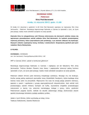 Kino Pod Baranami || Rynek Główny 27 || 31–010 Kraków DOJRZAŁE KINO - Paterson Kino Pod Baranami środa, 11 stycznia 2017, godz. 11.00 W środę (11 stycznia) o godzinie 11.00 Kino Pod Baranami zaprasza na najnowszy film Jima Jarmuscha – Paterson. Rewelacja tegorocznego festiwalu w Cannes to opowieść o tym, że życie jest poezją i każdy może odnaleźć szczęście na swój sposób. Dojrzałe Kino to cotygodniowy cykl filmowy skierowany do starszych widzów cieszy się ogromnym powodzeniem wśród widzów Kina Pod Baranami. Co tydzień prezentujemy wybraną premierę, która poprzedzona jest prelekcją, a po seansie odbywa się dyskusja. Naszych widzów częstujemy kawą, herbatą i ciasteczkami. Gospodynią spotkań jest pani redaktor Maria Malatyńska. O FILMIE: PATERSON | PATERSON reż. Jim Jarmusch, Francja/Niemcy/USA 2016, 118' MFF w Cannes 2016: udział w konkursie głównym Rewelacja tegorocznego festiwalu w Cannes i najlepszy od lat fabularny film Jima Jarmuscha. Twórca Broken Flowers oraz Kawy i papierosów stworzył pełną humoru opowieść o tym, że życie jest poezją i każdy może odnaleźć szczęście na swój sposób. Paterson (Adam Driver) jest kierowcą miejskiego autobusu. Niczego mu nie brakuje. Kocha swoją pełną szalonych pomysłów żonę (Golshifteh Farahani), która każdego dnia tworzy nowy plan na przyszłość. Mężczyzna ma czas na swoją pasję (pisanie wierszy), spacery z psem i spotkania z grupą zaprzyjaźnionych ekscentryków. Jest wśród nich przeżywający zawód miłosny kompan od kufla, wyzwolona singielka przesiadująca wieczorami w barze, czy wiecznie narzekający kolega z pracy, który zazdrości Patersonowi pogody ducha. Jednak na skutek zabawnego zbiegu okoliczności stoicki spokój tytułowego bohatera zostaje poddany próbie. Jeden z tych filmów, które wychodzą za tobą z kina. Tadeusz Sobolewski, Gazeta Wyborcza Kino Pod Baranami || Rynek Główny 27 || 31–010 Kraków Najnowszy film Jarmuscha ma w sobie tyle niewymuszonej czułości, że oglądając go, można złapać się na mimowolnym uśmiechu. Idealne dla: miłośników wierszy, które się nie rymują i buldogów angielskich. Oraz „Dymu” Paula Austera i Wayne’a Wanga. Marta Bałaga, Stopklatka.pl Paterson urzeka, mami, intryguje i wciąga do swojego świata. Reżyser, snując swoją opowieść, potrafi pokazać piękno najzwyklejszych codziennych czynności. Tak naprawdę jednak urok Patersona wynika z połączenia wszystkich tych elementów, a wypunktowanie ich na papierze nie oddaje w pełni magii, którą film za sobą niesie. Tak jak trudno określić dokładnie emocjonalny urok poezji, tak trudno określić ten urok w Patersonie. To po prostu trzeba zobaczyć i poczuć samemu. Michał Kaczoń, Wprost.pl Spotkania Dojrzałego Kina odbywają się co środę, w okolicach godziny 11.00. Uczestnicy cyklu prowadzą blog z recenzjami obejrzanych filmów: www.dojrzalekino.pl. Cykl zrealizowano przy wsparciu PISF. BILETY dla seniorów: 13 zł PARTNERZY: