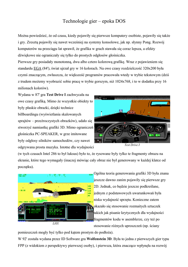 Technologie gier – epoka DOS Można powiedzieć, że od czasu, kiedy pojawiły się pierwsze komputery osobiste, pojawiły się także i gry. Zresztą pojawiły się nawet wcześniej na systemy konsolowe, jak np. słynny Pong. Rozwój komputerów na przeciągu lat sprawił, że grafika w grach stawała się coraz lepsza, a efekty dźwiękowe nie ograniczały się tylko do prostych odgłosów głośniczka. Pierwsze gry posiadały monotonną, dwu albo cztero kolorową grafikę. Wraz z pojawieniem się standardu EGA (84'), świat ujrzał gry w 16 kolorach. Na owe czasy rozdzielczość 320x200 była czymś znaczącym, zwłaszcza, że większość programów pracowała wtedy w trybie tekstowym (dziś z trudem możemy wyobrazić sobie pracę w trybie gorszym, niż 1024x768, i to w dodatku przy 16 milionach kolorów). Wydana w 87' gra Test Drive I zachwycała na owe czasy grafiką. Mimo że wszystkie obiekty to były płaskie obrazki, dzięki technice billboardingu (wyświetlania skalowanych sprajtów – przeźroczystych obrazków), udało się stworzyć namiastkę grafiki 3D. Mimo ograniczeń głośniczka PC-SPEAKER, w grze imitowane były odgłosy silników samochodów, czy nawet odgrywana prosta muzyka. Istotne dla wydajności Test Drive I (w tych czasach Intel 286 to był luksus) było to, że rysowane były tylko te fragmenty obrazu na ekranie, które tego wymagały (inaczej mówiąc cały obraz nie był generowany w każdej klatce od początku). Ogólna teoria generowania grafiki 3D była znana jeszcze dawno zanim pojawiły się pierwsze gry 2D. Jednak, co będzie jeszcze podkreślane, jednym z podstawowych uwarunkowań była niska wydajność sprzętu. Konieczne zatem okazało się stosowanie rozmaitych sztuczek takich jak pisanie krytycznych dla wydajności fragmentów kodu w asemblerze, czy też po LHX stosowanie różnych uproszczeń (np. ściany pomieszczeń mogły być tylko pod kątem prostym do podłoża). W 92' została wydana przez ID Software gra Wolfenstein 3D. Była to jedna z pierwszych gier typu FPP (z widokiem z perspektywy pierwszej osoby), i pierwsza, która znacząco wpłynęła na rozwój tego gatunku. Standard VGA, ustanowiony jeszcze w 87', umożliwił wykorzystanie aż 256 kolorów (nadal w rozdzielczości 320x200). Pozwoliło to na znaczący wzrost jakości grafiki m.in. dzięki użyciu techniki teksturowania (do tej pory 16 kolorów stawiało tutaj duże ograniczenia). To sprawiło, że gra napisana przez Johna Carmack'a (programista, współzałożyciel ID Software, jeden z czołowych twórców Wolfenstein 3D technologii gier w tym okresie), odniosła sławę i rozgłos. Także dźwięk uległ znaczącej poprawie. Posiadacze kart Sound Blaster mogli teraz cieszyć się realistycznymi odgłosami, a nie zwykłym piskiem z głośniczka systemowego. Gra wykorzystywała technikę raycastingu. Opierało się to na rzucaniu promieni na mapie wyznaczonych przez kolumny ekranu, aż ten napotkał na ścianę. W ten sposób komputer był zwolniony z przetwarzania dalszych fragmentów planszy, rysowana była tylko najbliższa widoczna ściana. Mimo, że gra nie toczyła się już po płaskich planszach, jak to miało miejsce w platformówkach 2D, nadal nie można było powiedzieć o pełnej trójwymiarowości. Tego typu gry określa się mianem 2.5D – nie mamy pełnej swobody w przemieszczaniu się w przestrzeni zaś obiekty to tylko zwykłe sprajty 2D. Kolejnym etapem rozwoju była napisana przez tych samych twórców gra Doom, wydana w 94'. Tym razem plansze nie składały się jedynie z kwadratowych bloków umieszczonych na jednej wysokości. Technologia BSP (Binary Space Partitioning) pozwoliła w wydajny sposób opis bardziej złożonych map składających się ze ścian Doom ustawionych pod dowolnym kątem (ale względem podłoża musiały być prostopadłe) i o dowolnej długości. Jednak nadal pozostały pewne ograniczenia, np. nie można było generować obiektów usytuowanych w pionie (jeden na drugim). Nadal więc mamy do czynienia z 2.5D. Z drugiej strony pojawiły się teksturowane powierzchnie horyzontalne (ich rendering wymagał większego nakładu pracy niż rysowanie pionowych ścian), efekty świetlne (ciemne, niedoświetlone pomieszczenia) czy też różne pomieszczenia mogły mieć różne poziomy wysokości. Poprawiła się jakość dźwięku (dźwięk 4-ro kanałowy), muzyka w formacie MIDI miała bardzo dobrą jakość (jak na owe czasy). Także nowością była możliwość gry przez sieć. To wszystko sprawnie działało na procesorach Intel 386. Jak sam Carmack wspomina, kod musiał być przed wydaniem odpowiednio dostosowany do procesora, który nie posiadał jednostki zmiennopozycyjnej (FPU). Równolegle inny amerykański programista: Ken Silvermann opracowywał swój Build Engine (również silnik 2.5D), który został potem wykorzystany m.in. w grze Duke Nukem 3D. Był on bardziej zaawansowany niż ten użyty w Build Engine grze Doom: umożliwiał np. tworzenie dynamicznych poziomów, rysowanie przeźroczystych powierzchni, czy też wykorzystanie bardziej zaawansowanych trybów graficznych SVGA. Standard SVGA w końcu pozwolił oderwanie się od rozdzielczości 320x200, która była jeszcze w pierwszej połowie lat 90' typowa (głównie za sprawą niskiej wydajności sprzętu). Tryb 640x480 oferował już przyzwoity wygląd, nie obciążając przy tym zanadto sprzętu. Jedną z pierwszych gier posiadających w pełni trójwymiarowy silnik graficzny była stworzona przez Parallax Software i wydana w lutym 95' gra Descent, w której gracz wcielał się w pilota kosmicznego myśliwca. Obiekty już nie były zwykłymi bitmapami 2D, ale prawdziwymi bryłami 3D. Mapy mogły mieć dowolną konstrukcję w przestrzeni. Gra wykorzystywała tzw. portale do ukrywania niewidocznych Descent powierzchni. Kolejną przełomową produkcją firmy ID Software był wydany w 96' Quake. Gra posiadała silnik umożliwiający generowanie w pełni trójwymiarowej gr