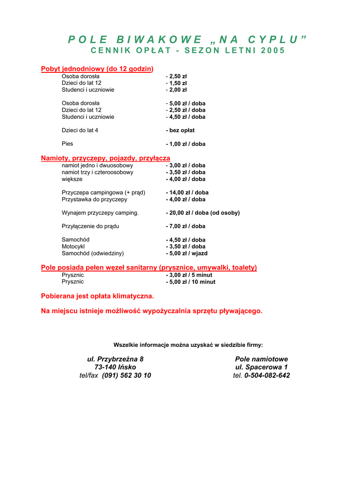 POLE BIWAKOWE „NA CYPLU” CENNIK OPŁAT - SEZON LETNI 2005 Pobyt jednodniowy (do 12 godzin) Osoba dorosła Dzieci do lat 12 Studenci i uczniowie - 2,50 zł - 1,50 zł - 2,00 zł Osoba dorosła Dzieci do lat 12 Studenci i uczniowie - 5,00 zł / doba - 2,50 zł / doba - 4,50 zł / doba Dzieci do lat 4 - bez opłat Pies - 1,00 zł / doba Namioty, przyczepy, pojazdy, przyłącza namiot jedno i dwuosobowy namiot trzy i czteroosobowy większe - 3,00 zł / doba - 3,50 zł / doba - 4,00 zł / doba Przyczepa campingowa (+ prąd) Przystawka do przyczepy - 14,00 zł / doba - 4,00 zł / doba Wynajem przyczepy camping. - 20,00 zł / doba (od osoby) Przyłączenie do prądu - 7,00 zł / doba Samochód Motocykl Samochód (odwiedziny) - 4,50 zł / doba - 3,50 zł / doba - 5,00 zł / wjazd Pole posiada pełen węzeł sanitarny (prysznice, umywalki, toalety) Prysznic Prysznic - 3,00 zł / 5 minut - 5,00 zł / 10 minut Pobierana jest opłata klimatyczna. Na miejscu istnieje możliwość wypożyczalnia sprzętu pływającego. Wszelkie informacje można uzyskać w siedzibie firmy: ul. Przybrzeżna 8 73-140 Ińsko tel/fax (091) 562 30 10 Pole namiotowe ul. Spacerowa 1 tel. 0-504-082-642