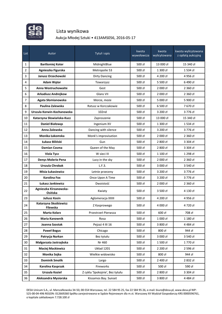 Lista wynikowa Aukcja Młodej Sztuki • 413AMS056, 2016-05-17 Lot Autor Tytuł i opis kwota wywoławcza kwota wylicytowana kwota wylicytowana z opłatą aukcyjną 1 Bartłomiej Koter MidnightBlue 500 zł 13 000 zł 15 340 zł 2 Agnieszka Figurska Metropolie 53 500 zł 1 300 zł 1 534 zł 3 Janusz Orzechowski Dirty Dancing 500 zł 4 200 zł 4 956 zł 4 Adam Wątor Towarzysz 500 zł 5 500 zł 6 490 zł 5 Anna Wostruchowaite Gest 500 zł 2 000 zł 2 360 zł 6 Arkadiusz Andrejkow Glans VII 500 zł 2 000 zł 2 360 zł 7 Agata Słomianowska Morze, może 500 zł 5 000 zł 5 900 zł 8 Paulina Zalewska Ratusz w Korczakowie 500 zł 6 500 zł 7 670 zł 9 Urszula Korwin-Kochanowska 102nd 500 zł 3 200 zł 3 776 zł 10 Katarzyna Słowiańska-Kucz Zaproszenie 500 zł 13 000 zł 15 340 zł 11 Daniel Białowąs Ingenium XV 500 zł 1 300 zł 1 534 zł 12 Anna Zalewska Dancing with silence 500 zł 3 200 zł 3 776 zł 13 Monika Łakomska Monk's improvisation 500 zł 2 000 zł 2 360 zł 14 Łukasz Biliński Gun 500 zł 2 800 zł 3 304 zł 15 Damian Cosma Queen of the May 500 zł 2 800 zł 3 304 zł 16 Viola Tycz W sieci III 500 zł 1 100 zł 1 298 zł 17 Denys Molerio Pena Lucy in the sky 500 zł 2 000 zł 2 360 zł 18 Urszula Chrobak L.F.3. 500 zł 3 000 zł 3 540 zł 19 Misia Łukasiewicz Letnie przeceny 500 zł 3 200 zł 3 776 zł 20 Karolina Fox Once Upon A Time 500 zł 3 200 zł 3 776 zł 21 Łukasz Jankiewicz Dwoistość 500 zł 2 000 zł 2 360 zł 22 Agnieszka KirzanowskaOsińska Kwiaty 500 zł 3 500 zł 4 130 zł 23 Juliusz Kosin Aglomeracja XXIII 500 zł 4 200 zł 4 956 zł 24 Katarzyna Skośkiewicz Filewska Z Kasprowego 500 zł 4 000 zł 4 720 zł 25 Marta Kolarz Przestrzeń Pierwsza 500 zł 600 zł 708 zł 26 Maria Kanownik Rosa 500 zł 1 000 zł 1 180 zł 27 Joanna Szostak Pejzaż 4 III 16 500 zł 3 800 zł 4 484 zł 28 Paweł Bogus Chicago 500 zł 800 zł 944 zł 29 Patrycja Nurkan Bez tytułu 500 zł 3 000 zł 3 540 zł 30 Małgorzata Jastrzębska Nr 460 500 zł 1 500 zł 1 770 zł 31 Maciej Mackiewicz Układ 1201 500 zł 2 200 zł 2 596 zł 32 Monika Sojka Wielkie widowisko 500 zł 800 zł 944 zł 33 Dominik Smolik Largo 500 zł 2 400 zł 2 832 zł 34 Karolina Kasprzak Fireworks 500 zł 500 zł 590 zł 35 Urszula Kozieł Z cyklu 'Spokojnie', Bez tytułu 500 zł 2 800 zł 3 304 zł 36 Aleksandra Mysiorska Kissamos Bay. Sunset 500 zł 3 800 zł 4 484 zł DESA Unicum S.A., ul. Marszałkowska 34-50, 00-554 Warszawa, tel. 22 584 95 25, fax 22 584 95 26, e-mail: [email protected], www.desa.pl NIP: 525-00-04-496 REGON: 012669260 Spółka zarejestrowana w Sądzie Rejonowym dla m.st. Warszawy XII Wydział Gospodarczy KRS 0000596761, o kapitale zakładowym 7.728.100 zł Lista wynikowa Aukcja Młodej Sztuki • 413AMS056, 2016-05-17 37 Ewelina Ulanecka Madagaskar 500 zł 2 400 zł 2 832 zł 38 Aneta Nowak Bez tytułu 500 zł 900 zł 1 062 zł 39 Sebastian Skoczylas Podczerwień 02 500 zł 2 800 zł 3 304 zł 40 Mirella Stern Czas jednorożca 500 zł 6 000 zł 7 080 zł 41 Robert Romanowicz Jeremiasz 500 zł 900 zł 1 062 zł 42 Danuta Wójcik Mechaniczna pomarańcza 500 zł 600 zł 708 zł 43 Edyta Mądzelewska Śmierć żołnierzyka 500 zł 1 300 zł 1 534 zł 44 Łukasz Czernicki Lot 36 500 zł 4 200 zł 4 956 zł 45 Karol A. Wilk W pogoni 500 zł 800 zł 944 zł 46 Marzena Bis Fog 500 zł 1 800 zł 2 124 zł 47 Anna Warenik-Gabbiani Flora 3 500 zł 1 200 zł 1 416 zł 48 Paweł Fil Wiosna-Wilga 500 zł 2 400 zł 2 832 zł 49 Agnieszka Pawłowska Radość życia 500 zł 2 000 zł 2 360 zł 50 Monika Mrowiec ROAR for life 500 zł 4 200 zł 4 956 zł 51 Janina Zaborowska Zebra II 500 zł 2 200 zł 2 596 zł 52 Katarzyna Misiórska Papugi, dyptyk 500 zł 900 zł 1 062 zł 53 Olga Pelipas Przed karnawałem 500 zł 2 800 zł 3 304 zł 54 Malwina de Brade Wilcze serce 500 zł 1 400 zł 1 652 zł 55 Michał Makara Kozy 500 zł 1 300 zł 1 534 zł 56 Ewa Dybek Drzewo życia 500 zł 3 800 zł 4 484 zł 57 Katarzyna Pieczyńska Alexander, I missed You in New York 500 zł 2 400 zł 2 832 zł 58 Agata Strzelecka Lady in waiting 500 zł 2 600 zł 3 068 zł 59 Michał Łapczyński Powrót do dzieciństwa 500 zł 900 zł 1 062 zł 61 Renata Magda Pink bird 500 zł 3 200 zł 3 776 zł 62 Paulina Korwin-Kochanowska Pomarańczowa łódka 500 zł 2 000 zł 2 360 zł 63 Magdalena Szilke Krowy na Marsie 500 zł 600 zł 708 zł 64 Angelika Milaniuk-Mitruk Z cyklu 'Śniło mi się', Jesienne zbiory 500 zł 800 zł 944 zł 65 Jacek Malinowski Toskania LXV 500 zł 1 800 zł 2 124 zł 66 Franciszek Ledóchowski Dziadek, ojciec i Mario Bross 500 zł 600 zł 708 zł 67 Aneta Sznura Przystanek 500 zł 500 zł 590 zł 68 Piotr Urbanek Dni otwarte nieba 500 zł 1 400 zł 1 652 zł 69 Katarzyna Gołębiowska Ławeczka 500 zł 2 200 zł 2 596 zł 70 Piotr Majewski Pejzaż morski XXX 500 zł 1 000 zł 1 180 zł 71 Stanisław Tomalak Z cyklu 'Niebo i ziemia', Fragment 310 500 zł 1 100 zł 1 298 zł 72 Patrycja Kruszyńska-Mikulska Dzikie kaczki 500 zł 3 200 zł 3 776 zł 73 Zofia Lelek Alpy po zachodzie 500 zł 1 300 zł 1 534 zł 74 Łukasz Lepiorz Susza III 500 zł 800 zł 944 zł 75 Ewa Herniczek XX1, dyptyk 500 zł 500 zł 590 zł 78 Paweł Porada Bliźnięta (Gemini), dyptyk 500 zł 2 800 zł 3 304 zł 79 Piotr Woroniec Jr Kolanko 500 zł 600 zł 708 zł DESA Unicum S.A., ul. Marszałkowska 34-50, 00-554 Warszawa, tel. 22 584 95 25, fax 22 584 95 26, e-mail: [email protected], www.desa.pl NIP: 525-00-04-496 REGON: 012669260 Spółka zarejestrowana w Sądzie Rejonowym dla m.st. Warszawy XII Wydział Gospodarczy KRS 0000596761, o kapitale zakładowym 7.728.100 zł Lista wynikowa Aukcja Młodej Sztuki • 413AMS056, 2016-05-17 80 Mateusz Rybka SPATiF trzecia trzydzieści 500 zł 2 400 zł 2 832 zł 81 Bartosz Stępiński IMP 4 500 zł 1 800 zł 2 124 zł 82 Beata Nowak-Majewska Obrazy mobilne Ultramaryna 500 zł 900 zł 1 062 zł 83 Jakub Szymański Pegazy 500 zł 1 600 zł 1 888 zł 84 Grzegorz Klimek Pięć kobiet II 500 zł 4 2