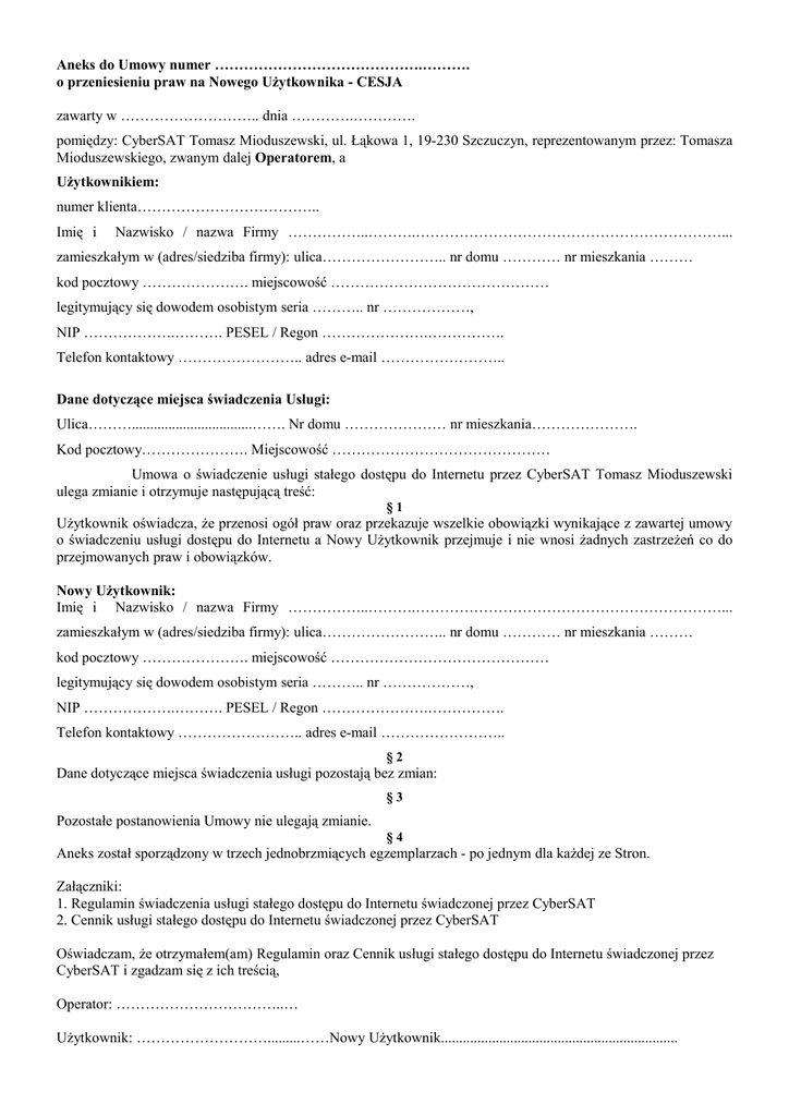 Aneks do Umowy numer …………………………………….………. o przeniesieniu praw na Nowego Użytkownika - CESJA zawarty w ……………………….. dnia ………….…………. pomiędzy: CyberSAT Tomasz Mioduszewski, ul. Łąkowa 1, 19-230 Szczuczyn, reprezentowanym przez: Tomasza Mioduszewskiego, zwanym dalej Operatorem, a Użytkownikiem: numer klienta……………………………….. Imię i Nazwisko / nazwa Firmy ……………..……….………………………………………………………... zamieszkałym w (adres/siedziba firmy): ulica…………………….. nr domu ………… nr mieszkania ……… kod pocztowy …………………. miejscowość ……………………………………… legitymujący się dowodem osobistym seria ……….. nr ………………, NIP ……………….………. PESEL / Regon ………………….……………. Telefon kontaktowy …………………….. adres e-mail …………………….. Dane dotyczące miejsca świadczenia Usługi: Ulica……….................................……. Nr domu ………………… nr mieszkania…………………. Kod pocztowy…………………. Miejscowość ……………………………………… Umowa o świadczenie usługi stałego dostępu do Internetu przez CyberSAT Tomasz Mioduszewski ulega zmianie i otrzymuje następującą treść: §1 Użytkownik oświadcza, że przenosi ogół praw oraz przekazuje wszelkie obowiązki wynikające z zawartej umowy o świadczeniu usługi dostępu do Internetu a Nowy Użytkownik przejmuje i nie wnosi żadnych zastrzeżeń co do przejmowanych praw i obowiązków. Nowy Użytkownik: Imię i Nazwisko / nazwa Firmy ……………..……….………………………………………………………... zamieszkałym w (adres/siedziba firmy): ulica…………………….. nr domu ………… nr mieszkania ……… kod pocztowy …………………. miejscowość ……………………………………… legitymujący się dowodem osobistym seria ……….. nr ………………, NIP ……………….………. PESEL / Regon ………………….……………. Telefon kontaktowy …………………….. adres e-mail …………………….. §2 Dane dotyczące miejsca świadczenia usługi pozostają bez zmian: §3 Pozostałe postanowienia Umowy nie ulegają zmianie. §4 Aneks został sporządzony w trzech jednobrzmiących egzemplarzach - po jednym dla każdej ze Stron. Załączniki: 1. Regulamin świadczenia usługi stałego dostępu do Internetu świadczonej przez CyberSAT 2. Cennik usługi stałego dostępu do Internetu świadczonej przez CyberSAT Oświadczam, że otrzymałem(am) Regulamin oraz Cennik usługi stałego dostępu do Internetu świadczonej przez CyberSAT i zgadzam się z ich treścią, Operator: ……………………………..… Użytkownik: ……………………….........……Nowy Użytkownik.................................................................