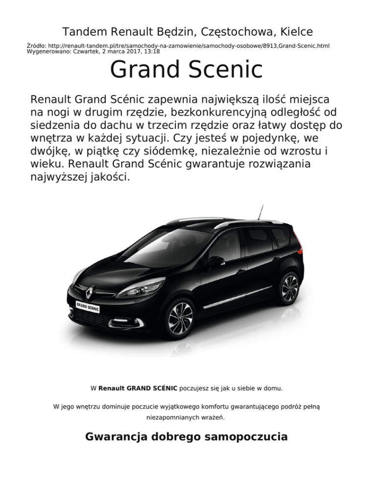 Tandem Renault Będzin, Częstochowa, Kielce Źródło: http://renault-tandem.pl/tre/samochody-na-zamowienie/samochody-osobowe/8913,Grand-Scenic.html Wygenerowano: Czwartek, 2 marca 2017, 13:18 Grand Scenic Renault Grand Scénic zapewnia największą ilość miejsca na nogi w drugim rzędzie, bezkonkurencyjną odległość od siedzenia do dachu w trzecim rzędzie oraz łatwy dostęp do wnętrza w każdej sytuacji. Czy jesteś w pojedynkę, we dwójkę, w piątkę czy siódemkę, niezależnie od wzrostu i wieku. Renault Grand Scénic gwarantuje rozwiązania najwyższej jakości. W Renault GRAND SCÉNIC poczujesz się jak u siebie w domu. W jego wnętrzu dominuje poczucie wyjątkowego komfortu gwarantującego podróż pełną niezapomnianych wrażeń. Gwarancja dobrego samopoczucia System wspomagania przy ruszaniu pod górę Czujnik światła i deszczu Skorzystaj z cennego rozwiązania, jakim Renault GRAND SCÉNIC sam się tym jest system wspomagania przy ruszaniu zajmie! Wycieraczki przedniej szyby o pod górę (Hill Start Assist). Inteligentny automatycznej regulacji częstotliwości system, który utrzymuje działanie pracy są uruchamiane przez czujnik hamulca przez około 2 sekundy po jego deszczu i dostosowują szybkość swojej zwolnieniu, aby dać ci czas na spokojne pracy do natężenia opadu. Dzięki ruszenie z miejsca. czujnikowi światła reflektory uruchomiają Zaczyna padać albo robi się ciemno? się automatycznie, kiedy wjedziesz do tunelu lub kiedy zaczyna się ściemniać. Ochrona pasażerów Visio System System Renault Protection (SRP) Visio System to Twój „anioł stróż” nowej obejmuje kompletny zestaw poduszek generacji. Sprawi, że Twoje podróże powietrznych oraz czujniki zderzenia Renault SCÉNIC będą jeszcze bocznego. Opracowana przez Renault, bezpieczniejsze. Kamera zainstalowana z innowacyjna technologia Fix4sure przodu pojazdu skanuje drogę przed zapobiega zjawisku tzw. nurkowania samochodem, rozpoznając poziome (polegającego na zsuwaniu się pasażera oznakowania drogi i położenie pojazdu. W spod pasa bezpieczeństwa podczas nocy, przy prędkości powyżej 45 km/h, zderzenia czołowego), skutecznie kamera steruje ustawieniem świateł chroniąc wszystkich pasażerów. Specjalne przednich zmieniając automatycznie wybrzuszenie tylnej części siedziska oraz światła drogowe na światła mijania w niskie usytuowanie pasów momencie, kiedy wjeżdżasz w obszar bezpieczeństwa pozwalają podróżować oświetlony lub zbliżasz się do pojazdów z komfortowo przy zachowaniu naprzeciwka. Gdy podróżujesz z optymalnych standardów bezpieczeństwa. prędkością powyżej 70 km/h i przekroczysz linię ciągłą lub przerywaną bez włączenia kierunkowskazu, system natychmiast ostrzeże Cię o tym za pomocą sygnałów dźwiękowych i świetlnych. Pobierz katalog Potrzebujesz więcej informacji? Skontaktuj się z nami Będzin Częstochowa Kielce ul. Czeladzka 67 (DK 68 ul. Krótka 16 ul. Transportowców 16 Katowice – Warszawa) 34 366 91 66 41 34 35 700 32 267 27 67 czestochowa@renault-tandem. [email protected] [email protected] pl