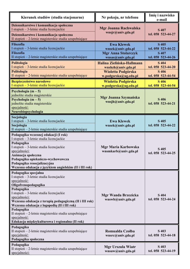 Kierunek studiów (studia stacjonarne) Dziennikarstwo i komunikacja społeczna I stopień – 3-letnie studia licencjackie Dziennikarstwo i komunikacja społeczna II stopień – 2-letnie magisterskie studia uzupełniające Filozofia I stopień – 3-letnie studia licencjackie Filozofia II stopień – 2-letnie magisterskie studia uzupełniające Politologia I stopień – 3-letnie studia licencjackie Politologia II stopień – 2-letnie magisterskie studia uzupełniające Bezpieczeństwo narodowe I stopień – 3-letnie studia licencjackie Psychologia (m – 5) jednolite studia magisterskie Psychologia (m – 5) jednolite studia magisterskie specjalność: Neurobiopsychologia Socjologia I stopień – 3-letnie studia licencjackie Socjologia II stopień – 2-letnie magisterskie studia uzupełniające Pedagogika wczesnej edukacji (I rok) I stopień – 3-letnie studia licencjackie Pedagogika I stopień – 3-letnie studia licencjackie specjalności: Animacja społeczna Pedagogika opiekuńczo-wychowawcza Pedagogika resocjalizacyjna Wczesna edukacja z językiem angielskim (II i III rok) Pedagogika specjalna I stopień – 3-letnie studia licencjackie specjalność: Oligofrenopedagogika Pedagogika I stopień – 3-letnie studia licencjackie specjalności: Wczesna edukacja z terapią pedagogiczną (II i III rok) Wczesna edukacja z logopedią (II i III rok) Pedagogika II stopień – 2-letnie magisterskie studia uzupełniające specjalność: Edukacja międzykulturowa i regionalna (II rok) Pedagogika II stopień – 2-letnie magisterskie studia uzupełniające specjalność: Pedagogika społeczna Pedagogika II stopień – 2-letnie magisterskie studia uzupełniające specjalności: Nr pokoju, nr telefonu Mgr Joanna Rachwalska [email protected] Ewa Klewek [email protected] Mgr Anna Stolarczyk [email protected] Halina Zielińska-Hallmann [email protected] Wioletta Podgórska [email protected] Wioletta Podgórska [email protected] Mgr Joanna Szymańska [email protected] Ewa Klewek [email protected] Mgr Maria Karbowska [email protected] Mgr Wanda Brzezicka [email protected] Romualda Czołba [email protected] Mgr Urszula Wiatr [email protected] Imię i nazwisko e-mail S 407 tel. 058 523-44-27 S 405 tel. 058 523-44-22 S 407 tel. 058 523-44-26 S 404 tel. 058 523-44-20 S 406 tel. 058 523-44-54 S 406 tel. 058 523-44-54 S 406 tel. 058 523-44-21 S 405 tel. 058 523-44-22 S 405 tel. 058 523-44-25 S 404 tel. 058 523-44-24 S 403 tel. 058 523-44-18 S 403 tel. 058 523-44-19 Pedagogika resocjalizacyjna Pedagogika szkolna Pedagogika wczesnoszkolna Pedagogika specjalna II stopień – 2-letnie magisterskie studia uzupełniające specjalności: Rehabilitacja społeczna i zawodowa z doradztwem Wczesne wspomaganie dzieci z niepełnosprawnością Wioletta Podgórska Praca socjalna I stopień – 3-letnie studia licencjackie S 406 tel. 058 523-44-54 [email protected] Sprawy studenckie Imię i nazwisko e-mail Nr pokoju, nr telefonu Windykacja Dr Alicja Szulc-Boczek [email protected] S 306 tel. 058 523-44-31 Joanna Walczyk [email protected] tel. 058 523-44-28 S 408 Stypendia, akademiki Mgr Małgorzata Opora [email protected] Struktura organizacyjna Imię i nazwisko e-mail Kierownik Dziekanatu Mgr Beata Sztander [email protected] Asystentka Dziekana Mgr Anna Zawadzka [email protected] [email protected] tel. 058 523-44-29 Nr pokoju, nr telefonu S 303 tel. 058 523-44-01 Mgr Renata Czyżycka [email protected] Sekretariat Dziekana S 307 tel. 058 523-44-03 fax 058 523-44-15 Mgr Maria Danuta Wnuk [email protected] Mgr Magdalena Dośla [email protected] Godziny przyjęć w Dziekanacie Wtorek Piątek 10.00 – 14.00 Środa 11.00 – 15.00 Poniedziałek Czwartek Dziekanat nieczynny ZESPÓŁ DZIEKAŃSKI WYDZIAŁU NAUK SPOŁECZNYCH Dziekan Godziny przyjęć Nr pokoju Prof. UG, dr hab. Wtorek 11.30 – 13.30 S 302 Beata Pastwa-Wojciechowska Środa 11.00 – 13.00 2 i 4 środa miesiąca dla studentów 12.00 – 13.00 Przyjęcia interesantów, po wcześniejszym umówieniu się pod nr tel. 058 523-44-01 Imię i nazwisko Godziny przyjęć Nr pokoju, nr telefonu ds. kształcenia i studiów stacjonarnych Dr Anna Kalinowska-Żeleźnik Wtorki 10.00 – 12.00 S 304 tel. 058 523-44-16 ds. nauki i studiów niestacjonarnych Prof. dr hab. Bogdan Chrzanowski Środa 11.00 – 16.00 (W wyznaczone Soboty 8:30 – 9:30 pracy Dziekanatu) ds. studenckich i współpracy międzynarodowej Dr Adam Jagiełło-Rusiłowski Prodziekani Wtorki 10.00 – 12.00 S 305 tel. 058 523-44-02