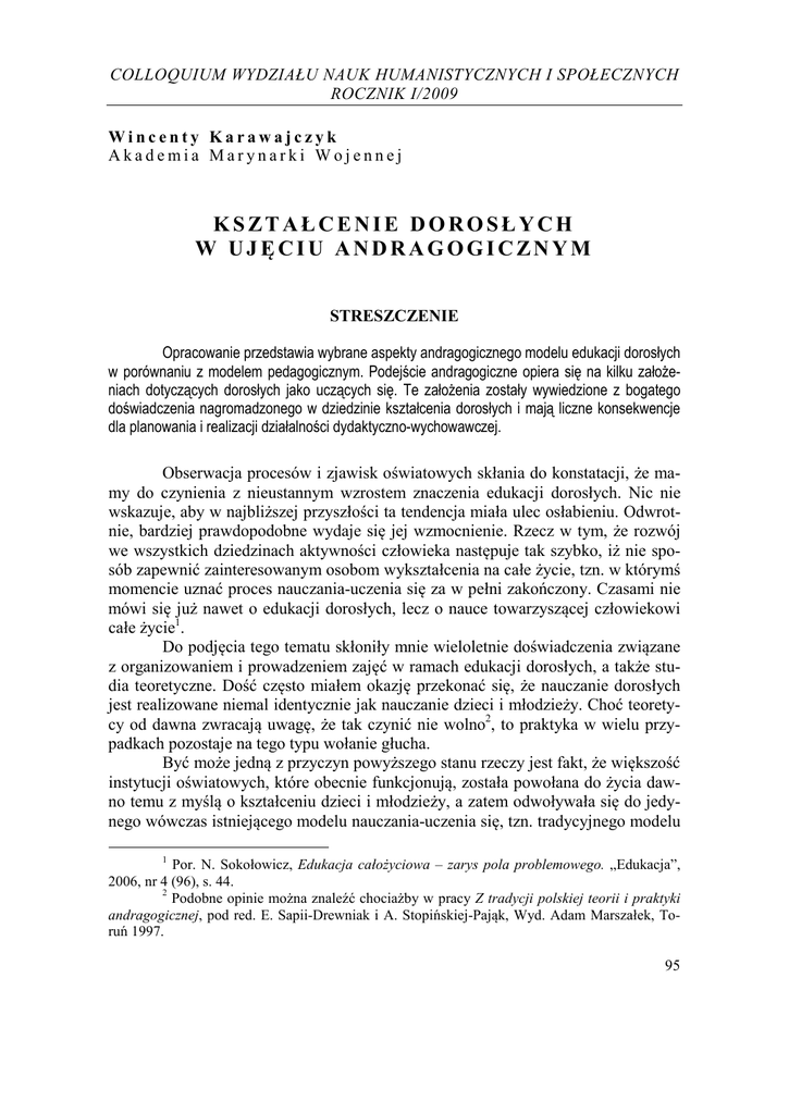 COLLOQUIUM WYDZIAŁU NAUK HUMANISTYCZNYCH I SPOŁECZNYCH ROCZNIK I/2009 Wincenty Karawajczyk Akademia Marynarki Wojennej KSZTAŁCENIE DOROSŁYCH W UJĘCIU ANDRAGOGICZNYM STRESZCZENIE Opracowanie przedstawia wybrane aspekty andragogicznego modelu edukacji dorosłych w porównaniu z modelem pedagogicznym. Podejście andragogiczne opiera się na kilku założeniach dotyczących dorosłych jako uczących się. Te założenia zostały wywiedzione z bogatego doświadczenia nagromadzonego w dziedzinie kształcenia dorosłych i mają liczne konsekwencje dla planowania i realizacji działalności dydaktyczno-wychowawczej. Obserwacja procesów i zjawisk oświatowych skłania do konstatacji, że mamy do czynienia z nieustannym wzrostem znaczenia edukacji dorosłych. Nic nie wskazuje, aby w najbliższej przyszłości ta tendencja miała ulec osłabieniu. Odwrotnie, bardziej prawdopodobne wydaje się jej wzmocnienie. Rzecz w tym, że rozwój we wszystkich dziedzinach aktywności człowieka następuje tak szybko, iż nie sposób zapewnić zainteresowanym osobom wykształcenia na całe życie, tzn. w którymś momencie uznać proces nauczania-uczenia się za w pełni zakończony. Czasami nie mówi się już nawet o edukacji dorosłych, lecz o nauce towarzyszącej człowiekowi całe życie1. Do podjęcia tego tematu skłoniły mnie wieloletnie doświadczenia związane z organizowaniem i prowadzeniem zajęć w ramach edukacji dorosłych, a także studia teoretyczne. Dość często miałem okazję przekonać się, że nauczanie dorosłych jest realizowane niemal identycznie jak nauczanie dzieci i młodzieży. Choć teoretycy od dawna zwracają uwagę, że tak czynić nie wolno2, to praktyka w wielu przypadkach pozostaje na tego typu wołanie głucha. Być może jedną z przyczyn powyższego stanu rzeczy jest fakt, że większość instytucji oświatowych, które obecnie funkcjonują, została powołana do życia dawno temu z myślą o kształceniu dzieci i młodzieży, a zatem odwoływała się do jedynego wówczas istniejącego modelu nauczania-uczenia się, tzn. tradycyjnego modelu 1 Por. N. Sokołowicz, Edukacja całożyciowa – zarys pola problemowego. „Edukacja”, 2006, nr 4 (96), s. 44. 2 Podobne opinie można znaleźć chociażby w pracy Z tradycji polskiej teorii i praktyki andragogicznej, pod red. E. Sapii-Drewniak i A. Stopińskiej-Pająk, Wyd. Adam Marszałek, Toruń 1997. 95 Wincenty Karawajczyk pedagogicznego. Tymczasem bardziej uzasadnione wydaje się podejście andragogiczne3. Dlatego celem niniejszego opracowania jest próba przedstawienia specyfiki kształcenia dorosłych z perspektywy andragogicznej, w odróżnieniu od perspektywy pedagogicznej. DWA SPOJRZENIA NA EDUKACJĘ Wielu autorów zachodnich, głosi tezę o zasadniczej odmienności podejścia pedagogicznego i andragogicznego do procesu kształcenia4. M. Knowles (zwany apostołem andragogiki) ujmuje rzecz lapidarnie: pedagogika to sztuka i nauka o nauczaniu dzieci i młodzieży, zaś andragogika to sztuka i nauka o pomaganiu dorosłym w procesie uczenia się5. Nawiązujący do niego P. Jarvis uważa, że pedagogika zajmuje się edukacją prowadzoną „z góry”, natomiast andragogika – edukacją „równych sobie”6. W modelu pedagogicznym podejmowanie wszelkich decyzji o tym, czego należy się uczyć, jak należy się uczyć, kiedy należy się uczyć, dlaczego należy się uczyć itp. należy do nauczycieli. Uczniom przypada rola posłusznych odbiorców treści oraz wskazówek przekazywanych przez pedagogów. U podstaw omawianego rozwiązania leży założenie, że dzieci i młodzież nie są osobami samodzielnymi, mają zbyt małe doświadczenie w uczeniu się, zatem powinni przyswajać te treści, które zalecają nauczyciele, głównie po to, aby uzyskać promocję do następnego etapu kształcenia. W procesie edukacji uczniowie są zorientowani na przedmioty nauczania, a podstawowe źródło motywacji w ich przypadku stanowią oddziaływania zewnętrzne, głównie nagrody i kary. Rdzeniem tak pojmowanej koncepcji kształcenia są metody podające. Kiedy w XIX w. zaczęto coraz szerzej zajmować się edukacją dorosłych, pedagogika oferowała tylko ten jeden model kształcenia, który skłaniał do traktowaniu dorosłych jak dzieci. Wydaje się, że takie podejście zakorzeniło się bardzo mocno i wciąż zachowuje znaczną odporność na zmiany. Nie sądzę, aby jego przyczyną był wyłącznie konserwatyzm osób odpowiedzialnych za organizację edukacji dorosłych. Na ogół nauczyciele zdają sobie sprawę z tego, że dorosłych trzeba uczyć inaczej niż dzieci i młodzież, ale nie zawsze uzmysławiają, na czym ta różnica mia3 Pojęcia „andragogika” jako pierwszy użył niemiecki nauczyciel Aleksander Kapp w 1833 r. do opisu teorii wychowania Platona. Dziś jest ono nierozerwalnie związane z amerykańskim pedagogiem M. S. Knowlesem. Por. Towards a Developmental Theory of Andragogy, University of Nottingham Department of Adult Education, Nottingham 1983, s. V i nast. 4 Por. M. Thorpe, R. Edwards, A. Hanson (red.), Culture and Processes of Adult Learning, Routledge, London 1993, s. 114. 5 Por. M. S. Knowles, The Modern Practice of Adult Education: From Pedagogy to Andragogy, Prentice Hall, Englewood Cliffs 1988, s. 41-42. 6 Por. P. Jarvis, The Sociology of Adult and Continuing Education, Croom Helm, Beckenham 1985, s. 50-51. 96 COLLOQUIUM WNHiS Kształcenie dorosłych w ujęciu andragogicznym łaby polegać. Wciąż zatem musimy poszukiwać andragogicznego modelu (a może teorii) kształcenia, choć pojawiają się wątpliwości, czy to jest możliwe7. Celem niniejszego opracowania jest próba określenia przynajmniej niektórych założeń tego modelu. Wydaje się, że odmienność kształcenia dorosłych wynika przede wszystkim ze szczególnych cech tej kategorii osób występujących w roli uczniów. Do tego odwołuje się też dominująca dziś teoria kształcenia dorosłych8. DOROŚLI JAKO UCZĄCY S