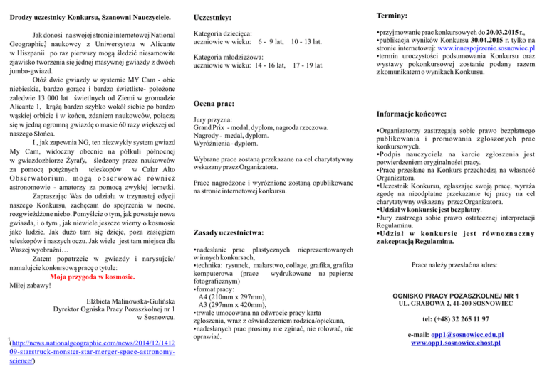 Drodzy uczestnicy Konkursu, Szanowni Nauczyciele. Uczestnicy: Jak donosi na swojej stronie internetowej National Geographic,1 naukowcy z Uniwersytetu w Alicante w Hiszpanii po raz pierwszy mogą śledzić niesamowite zjawisko tworzenia się jednej masywnej gwiazdy z dwóch jumbo-gwiazd. Otóż dwie gwiazdy w systemie MY Cam - obie niebieskie, bardzo gorące i bardzo świetliste- położone zaledwie 13 000 lat świetlnych od Ziemi w gromadzie Alicante 1, krążą bardzo szybko wokół siebie po bardzo wąskiej orbicie i w końcu, zdaniem naukowców, połączą się w jedną ogromną gwiazdę o masie 60 razy większej od naszego Słońca. I , jak zapewnia NG, ten niezwykły system gwiazd My Cam, widoczny obecnie na półkuli północnej w gwiazdozbiorze Żyrafy, śledzony przez naukowców za pomocą potężnych teleskopów w Calar Alto Obserwatorium, mogą obserwować również astronomowie - amatorzy za pomocą zwykłej lornetki. Zapraszając Was do udziału w trzynastej edycji naszego Konkursu, zachęcam do spojrzenia w nocne, rozgwieżdżone niebo. Pomyślcie o tym, jak powstaje nowa gwiazda, i o tym , jak niewiele jeszcze wiemy o kosmosie jako ludzie. Jak dużo tam się dzieje, poza zasięgiem teleskopów i naszych oczu. Jak wiele jest tam miejsca dla Waszej wyobraźni… Zatem popatrzcie w gwiazdy i narysujcie/ namalujcie konkursową pracę o tytule: Moja przygoda w kosmosie. Miłej zabawy! Kategoria dziecięca: uczniowie w wieku: 6 - 9 lat, Elżbieta Malinowska-Gulińska Dyrektor Ogniska Pracy Pozaszkolnej nr 1 w Sosnowcu. 1 (http://news.nationalgeographic.com/news/2014/12/1412 1 09-starstruck-monster-star-merger-space-astronomyscience/) Kategoria młodzieżowa: uczniowie w wieku: 14 - 16 lat, Terminy: ź przyjmowanie prac konkursowych do 20.03.2015 r., 10 - 13 lat. 17 - 19 lat. ź publikacja wyników Konkursu 30.04.2015 r. tylko na stronie internetowej: www.innespojrzenie.sosnowiec.pl ź termin uroczystości podsumowania Konkursu oraz wystawy pokonkursowej zostanie podany razem z komunikatem o wynikach Konkursu. Ocena prac: Jury przyzna: Grand Prix - medal, dyplom, nagroda rzeczowa. Nagrody - medal, dyplom. Wyróżnienia - dyplom. Wybrane prace zostaną przekazane na cel charytatywny wskazany przez Organizatora. Prace nagrodzone i wyróżnione zostaną opublikowane na stronie internetowej konkursu. Zasady uczestnictwa: Informacje końcowe: ź Organizatorzy zastrzegają sobie prawo bezpłatnego publikowania i promowania zgłoszonych prac konkursowych. ź Podpis nauczyciela na karcie zgłoszenia jest potwierdzeniem oryginalności pracy. ź Prace przesłane na Konkurs przechodzą na własność Organizatora. ź Uczestnik Konkursu, zgłaszając swoją pracę, wyraża zgodę na nieodpłatne przekazanie tej pracy na cel charytatywny wskazany przez Organizatora. ź Udział w konkursie jest bezpłatny. ź Jury zastrzega sobie prawo ostatecznej interpretacji Regulaminu. ź Udział w konkursie jest równoznaczny z akceptacją Regulaminu. ź nadesłanie prac plastycznych nieprezentowanych w innych konkursach, Prace należy przesłać na adres: ź technika: rysunek, malarstwo, collage, grafika, grafika komputerowa (prace wydrukowane na papierze fotograficznym) ź format pracy: OGNISKO PRACY POZASZKOLNEJ NR 1 A4 (210mm x 297mm), UL. GRABOWA 2, 41-200 SOSNOWIEC A3 (297mm x 420mm), ź trwale umocowana na odwrocie pracy karta tel: (+48) 32 265 11 97 zgłoszenia, wraz z oświadczeniem rodzica/opiekuna, ź nadesłanych prac prosimy nie zginać, nie rolować, nie e-mail: [email protected] oprawiać. www.opp1.sosnowiec.ehost.pl DANE UCZESTNIKA: IMIĘ: NAZWISKO: WIEK: DANE OPIEKUNA/NAUCZYCIELA: IMIĘ: NAZWISKO: E-MAIL: DANE SZKOŁY/PLACÓWKI: NAZWA SZKOŁY: PAŃSTWO: MIASTO: ADRES: E-MAIL: PODPIS NAUCZYCIELA/OPIEKUNA: PIECZĘĆ SZKOŁY/PLACÓWKI: OŚWIADCZENIE RODZICA LUB PEŁNOLETNIEGO UCZESTNIKA: Wyrażam zgodę na przetwarzanie danych osobowych ORGANIZATOR KONKURSU: Ognisko Pracy Pozaszkolnej nr1 w Sosnowcu ........................................................................ (imię i nazwisko uczestnika konkursu) przez Organizatorów dla celów organizacyjnych i promocyjnych XIII Międzynarodowego Konkursu Plastycznego “Inne Spojrzenie” ...................................... ul. Grabowa 2 41-200 Sosnowiec (+48) 32 265 11 97 (data i podpis) . Karta zgłoszenia dostępna na stronie internetowej Konkursu: www.innespojrzenie.sosnowiec.pl [email protected] www.opp1.sosnowiec.ehost.pl SOSNOWIEC, 2015 Kartę prosimy wypełnić czytelnie: komputerowo lub pismem drukowanym. XIII Międzynarodowy Konkurs Plastyczny WZÓR KARTY ZGŁOSZENIA UCZESTNIKA KONKURSU: