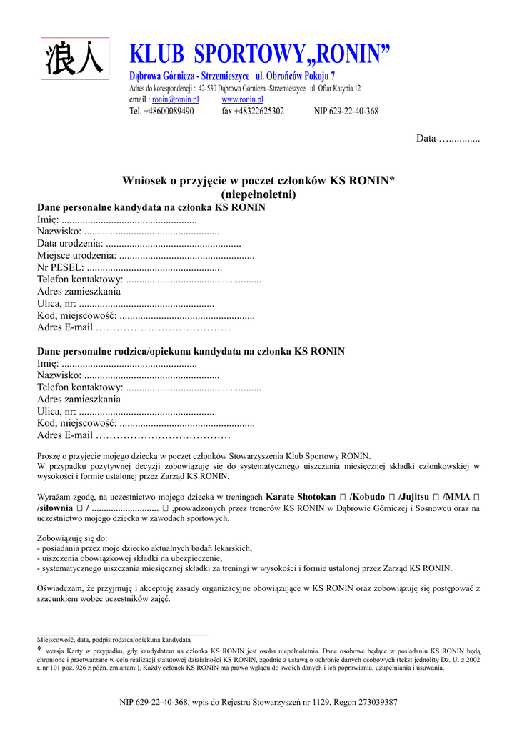 KLUB SPORTOWY„RONIN” Dąbrowa Górnicza - Strzemieszyce ul. Obrońców Pokoju 7 Adres do korespondencji : 42-530 Dąbrowa Górnicza -Strzemieszyce ul. Ofiar Katynia 12 email : [email protected] www.ronin.pl Tel. +48600089490 fax +48322625302 NIP 629-22-40-368 Data …............ Wniosek o przyjęcie w poczet członków KS RONIN* (niepełnoletni) Dane personalne kandydata na członka KS RONIN Imię: .................................................... Nazwisko: .................................................... Data urodzenia: .................................................... Miejsce urodzenia: .................................................... Nr PESEL: .................................................... Telefon kontaktowy: .................................................... Adres zamieszkania Ulica, nr: .................................................... Kod, miejscowość: .................................................... Adres E-mail ………………………………… Dane personalne rodzica/opiekuna kandydata na członka KS RONIN Imię: .................................................... Nazwisko: .................................................... Telefon kontaktowy: .................................................... Adres zamieszkania Ulica, nr: .................................................... Kod, miejscowość: .................................................... Adres E-mail ………………………………… Proszę o przyjęcie mojego dziecka w poczet członków Stowarzyszenia Klub Sportowy RONIN. W przypadku pozytywnej decyzji zobowiązuję się do systematycznego uiszczania miesięcznej składki członkowskiej w wysokości i formie ustalonej przez Zarząd KS RONIN. Wyrażam zgodę, na uczestnictwo mojego dziecka w treningach Karate Shotokan /Kobudo /Jujitsu /MMA /siłownia / ............................ ,prowadzonych przez trenerów KS RONIN w Dąbrowie Górniczej i Sosnowcu oraz na uczestnictwo mojego dziecka w zawodach sportowych. Zobowiązuję się do: - posiadania przez moje dziecko aktualnych badań lekarskich, - uiszczenia obowiązkowej składki na ubezpieczenie, - systematycznego uiszczania miesięcznej składki za treningi w wysokości i formie ustalonej przez Zarząd KS RONIN. Oświadczam, że przyjmuję i akceptuję zasady organizacyjne obowiązujące w KS RONIN oraz zobowiązuję się postępować z szacunkiem wobec uczestników zajęć. _________________________________ Miejscowość, data, podpis rodzica/opiekuna kandydata * wersja Karty w przypadku, gdy kandydatem na członka KS RONIN jest osoba niepełnoletnia. Dane osobowe będące w posiadaniu KS RONIN będą chronione i przetwarzane w celu realizacji statutowej działalności KS RONIN, zgodnie z ustawą o ochronie danych osobowych (tekst jednolity Dz. U. z 2002 r. nr 101 poz. 926 z późn. zmianami). Każdy członek KS RONIN ma prawo wglądu do swoich danych i ich poprawiania, uzupełniania i usuwania. NIP 629-22-40-368, wpis do Rejestru Stowarzyszeń nr 1129, Regon 273039387 KLUB SPORTOWY„RONIN” Dąbrowa Górnicza - Strzemieszyce ul. Obrońców Pokoju 7 Adres do korespondencji : 42-530 Dąbrowa Górnicza -Strzemieszyce ul. Ofiar Katynia 12 email : [email protected] www.ronin.pl Tel. +48600089490 fax +48322625302 NIP 629-22-40-368 Data …......…......... Wniosek o przyjęcie w poczet członków KS RONIN* (pełnoletni) Dane personalne kandydata na członka KS RONIN Imię: .................................................... Nazwisko: .................................................... Data urodzenia: .................................................... Miejsce urodzenia: .................................................... Nr PESEL: .................................................... Telefon kontaktowy: .................................................... Adres zamieszkania Ulica, nr: .................................................... Kod, miejscowość: .................................................... Adres E-mail ………………………………… Proszę o przyjęcie mnie w poczet członków Stowarzyszenia Klub Sportowy RONIN. W przypadku pozytywnej decyzji zobowiązuję się do systematycznego uiszczania miesięcznej składki członkowskiej w wysokości i formie ustalonej przez Zarząd KS RONIN. W przypadku mojego uczestnictwa w treningach Karate Shotokan /Kobudo /Jujitsu /MMA /siłownia / ............................ , prowadzonych przez trenerów KS RONIN oraz udziału w zawodach sportowych zobowiązuję się do: - posiadania aktualnych badań lekarskich, - uiszczenia obowiązkowej składki na ubezpieczenie, - systematycznego uiszczania miesięcznej składki za treningi w wysokości i formie ustalonej przez Zarząd KS RONIN. Oświadczam, że przyjmuję i akceptuję zasady organizacyjne obowiązujące w KS RONIN oraz zobowiązuję się postępować z szacunkiem wobec uczestników zajęć. _________________________________ Miejscowość, data, podpis kandydata * wersja Karty w przypadku, gdy kandydatem na członka KS RONIN jest osoba pełnoletnia. Dane osobowe będące w posiadaniu KS RONIN będą chronione i przetwarzane w celu realizacji statutowej działalności KS RONIN, zgodnie z ustawą o ochronie danych osobowych (tekst jednolity Dz. U. z 2002 r. nr 101 poz. 926 z późn. zmianami). Każdy członek KS RONIN ma prawo wglądu do swoich danych i ich poprawiania, uzupełniania i usuwania. NIP 629-22-40-368, wpis do Rejestru Stowarzyszeń nr 1129, Regon 273039387