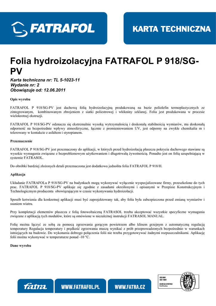 Folia hydroizolacyjna FATRAFOL P 918/SGPV Karta techniczna nr: TL 5-1023-11 Wydanie nr: 2 Obowiązuje od: 12.06.2011 Opis wyrobu FATRAFOL P 918/SG-PV jest dachową folią hydroizolacyjną produkowaną na bazie poliolefin termoplastycznych ze zintegrowanym, kombinowanym zbrojeniem z siatki poliestrowej i włókniny szklanej. Folia jest produkowana w procesie wielokrotnej ekstruzji. FATRAFOL P 918/SG-PV odznacza się ekstremalnie wysoką wytrzymałością i doskonałą stabilnością wymiarów, ma doskonałą odporność na bezpośrednie wpływy atmosferyczne, łącznie z promieniowaniem UV, jest odporny na zwykłe chemikalia m i tolerowany w kontakcie z asfaltem i styropianem. Przeznaczenie FATRAFOL P 918/SG-PV jest przeznaczony do aplikacji, w których przed hydroizolacją płaszcza pokrycia dachowego stawiane są wysokie wymagania związane z bezproblemowym użytkowaniem i długotrwałą żywotnością. Ponadto jest on folią uzupełniającą w systemie FATRASOL. Do obróbki bardziej złożonych detali przeznaczona jest dodatkowa jednolita folia FATRAFOL P 918/H. Aplikacja Układanie FATRAFOLu P 918/SG-PV na budynkach mogą wykonywać wyłącznie wyspecjalizowane firmy, przeszkolone do tych prac. FATRAFOL P 918/SG-PV aplikuje się zgodnie z zasadami określonymi i opisanymi w Przepisie Konstrukcyjnym i Technologicznym producenta obowiązującym w czasie wykonywania hydroizolacji. Sposób kotwienia dla konkretnej aplikacji musi być zaprojektowany tak, aby folia była zabezpieczona przed zmianą wymiarów i ssaniem wiatru. Przy kompletacji elementów płaszcza z folią fotowoltaiczną FATRASOL trzeba akceptować wszystkie specyficzne wymagania związane z aplikacją tych modułów, które są omówione w niezależnej instrukcji FATRASOL MANUAL. Folię można łączyć ze sobą za pomocą zgrzewania gorącym powietrzem albo klinem grzejnym z automatyczną regulacją temperatury Regulacja temperatury i prędkość zgrzewania muszą wynikać z prób przeprowadzonych bezpośrednio w warunkach istniejących na budowie. Do wykonania dobrego połączenia folii nie trzeba przygotowywać żadnymi rozpuszczalnikami. Aplikację folii można wykonywać w temperaturze ponad -10 °C. Dane wyrobu FATRAFOL P 918/SG-PV spełnia wymagania normy ČSN EN 13956:2006/AC 2006-06. Wymiary: Grubość [mm] (ČSN EN 1849-2) 1,50 (-0,07; +0,15) 2,00 (-0,10; +0,20) Szerokość [mm] (ČSN EN 1848-2) 2050 (-10; +20) 2050 (-10; +20) Długość [m] (ČSN EN 1848-2) 20 (-0, +1) 15 (-0, +0,75) Ilość [m2] 41 30,75 Kolor: FATRAFOL P 918/SG-PV produkuje się z szaro – białym kolorem warstwy wierzchniej zgodnie z RAL 7035. Warstwa spodnia jest w kolorze szarym zgodnie z RAL 7037. Opakowanie, transport, przechowywanie: FATRAFOL P 918/SG-PV jest pakowany w rolki, rolki są ułożone na drewnianych paletach i umocowane folią do pakowania PE. FATRAFOL P 918/SG-PV musi być przewożony w krytych środkach transportu i magazynowany w oryginalnych zamkniętych opakowaniach. Zalecana temperatura magazynowania wynosi -5 °C do +30 °C. Na placu budowy wyrób należy chronić przed zanieczyszczeniem, a do czasu aplikacji folię zaleca się chronić przed wpływem warunków atmosferycznych. Parametry techniczne: Własność Wady widoczne Prostość Płaskość Stabilność wymiarów Wytrzymałość na rozciąganie Rozciągliwość Odporność na rozdzieranie Norma badawcza P N P N P N Zginanie w niskiej temperaturze Odporność na rozwarstwianie zgrzewów P N Wytrzymałość zgrzewów na ścinanie P N Wodoszczelność, 10 kPa Odporność na obciążenie statyczne Reakcja na ogień Odporność na uderzenie ČSN EN 1850-2 ČSN EN 1848-2 ČSN EN 1848-2 ČSN EN 1107-2 ČSN EN 12311-2 metoda A ČSN EN 12310-2 ČSN EN 495-5 ČSN EN 12316-2 ČSN EN 12317-2 Wartości dla poszczególnych grubości 1,50 mm 2,00 mm spełnia wymagania spełnia wymagania ≤ 30 mm ≤ 30 mm ≤ 10 mm ≤ 10 mm maks. ± 0,3 % maks. ± 0,3 % ≥ 1100 N/50 mm ≥ 1250 N/50 mm ≥ 1100 N/50 mm ≥ 1250 N/50 mm ≥ 15 % ≥ 20 % ≥ 15 % ≥ 20 % ≥ 350 N ≥ 400 N ≥ 350 N ≥ 400 N ≤ -40 °C ≤ -40 °C ≥ 300 N/50 mm ≥ 300 N/50 mm ≥ 300 N/50 mm ≥ 300 N/50 mm ≥ 1000 N/50 mm ≥ 1125 N/50 mm ≥ 1000 N/50 mm ≥ 1125 N/50 mm spełnia wymagania spełnia wymagania ČSN EN 1928 metoda B ČSN EN 12730 spełnia wymagania przy 20 kg spełnia wymagania przy 20 kg metoda B ČSN EN 13501-1 klasa E klasa E ČSN EN 12691 spełnia wymagania przy 1500 spełnia wymagania przy 2000 mm mm metoda A ČSN EN 12691 spełnia wymagania przy 2000 spełnia wymagania przy 2000 mm metoda B mm Ekspozycja na promieniowanie UV, podwyższoną temperaturę i wodę Przepuszczalność dla pary wodnej współczynnik oporu dyfuzyjnego µ Zachowanie przy pożarze zewnętrznym ČSN EN 1297 spełnia wymagania, stopień 0 spełnia wymagania, stopień 0 ČSN EN 1931 95000 ± 15000 95000 ± 15000 BROOF (t1) BROOF (t1) ČSN P ENV 1187 Objaśnienia: P - wzdłuż, N – w poprzek Przepisy bezpieczeństwa FATRAFOL P 918/SG nie jest klasyfikowany, jako substancja niebezpieczna w znaczeniu ustawy o substancjach chemicznych. Usuwanie odpadów FATRAFOL P 918/SG-PV należy likwidować zgodnie z obowiązującymi przepisami prawnymi. Czyste odpady można wykorzystać do recyklingu, odpady nieprzydatne do recyklingu należy przekazać na wysypisko. Odpady zanieczyszczone substancjami niebezpiecznymi należy unieszkodliwić przez spalenie w spalarni odpadów niebezpiecznych. Bezpieczeństwo i ochrona zdrowia przy pracy Przy układaniu i łączeniu folii należy przestrzegać wszystkich obowiązujących w danym czasie przepisów bezpieczeństwa, przepisów higienicznych i przeciwpożarowych Dokumentacja związana • • Przepis Konstrukcyjny i Technologiczny dachowego systemu hydroizolacyjnego FATRAFOL-S Certyfikat systemu zarządzania jakością produkcji nr 1390-CPD-0129/11/Z dla folii hydroizolacyjnej FATRAFOL P 918/SG i FATRAFOL P 918/SG-PV zgodnie z ČSN EN 13956:2006/AC 2006-06 wydany przez CSI, a.
