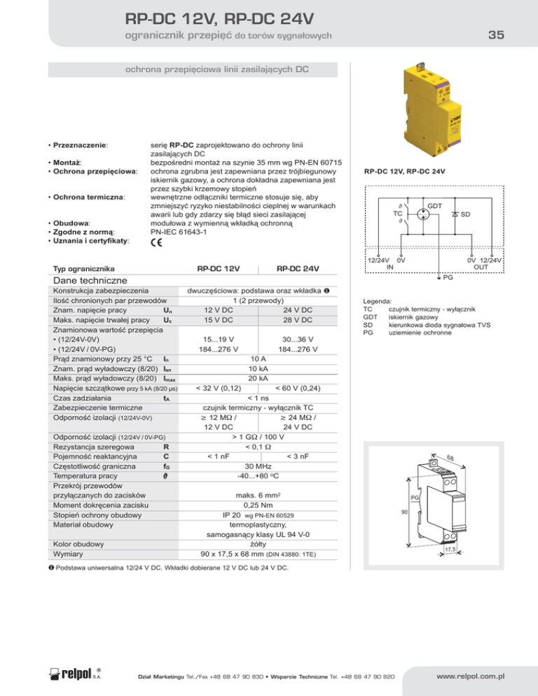 RP-DC 12V, RP-DC 24V 35 ogranicznik przepiêæ do torów sygna³owych ochrona przepiêciowa linii zasilaj¹cych DC • Przeznaczenie: • Monta¿: • Ochrona przepiêciowa: • Ochrona termiczna: • Obudowa: • Zgodne z norm¹: • Uznania i certyfikaty: seriê RP-DC zaprojektowano do ochrony linii zasilaj¹cych DC bezpoœredni monta¿ na szynie 35 mm wg PN-EN 60715 ochrona zgrubna jest zapewniana przez trójbiegunowy iskiernik gazowy, a ochrona dok³adna zapewniana jest przez szybki krzemowy stopieñ wewnêtrzne od³¹czniki termiczne stosuje siê, aby zmniejszyæ ryzyko niestabilnoœci cieplnej w warunkach awarii lub gdy zdarzy siê b³¹d sieci zasilaj¹cej modu³owa z wymienn¹ wk³adk¹ ochronn¹ PN-IEC 61643-1 Typ ogranicznika RP-DC 12V RP-DC 24V RP-DC 12V, RP-DC 24V J GDT TC SD J 12/24V 0V IN 0V 12/24V OUT Dane techniczne PG Konstrukcja zabezpieczenia Iloœæ chronionych par przewodów Znam. napiêcie pracy Un Maks. napiêcie trwa³ej pracy Uc Znamionowa wartoœæ przepiêcia • (12/24V-0V) • (12/24V / 0V-PG) Pr¹d znamionowy przy 25 °C In Znam. pr¹d wy³adowczy (8/20) Isn Maks. pr¹d wy³adowczy (8/20) Imax Napiêcie szcz¹tkowe przy 5 kA (8/20 µs) Czas zadzia³ania tA Zabezpieczenie termiczne Odpornoœæ izolacji (12/24V-0V) Odpornoœæ izolacji (12/24V / 0V-PG) Rezystancja szeregowa R Pojemnoœæ reaktancyjna C Czêstotliwoœæ graniczna fG ϑ Temperatura pracy Przekrój przewodów przy³¹czanych do zacisków Moment dokrêcenia zacisku Stopieñ ochrony obudowy Materia³ obudowy Kolor obudowy Wymiary dwuczêœciowa: podstawa oraz wk³adka ❶ 1 (2 przewody) 12 V DC 24 V DC 15 V DC 28 V DC 15...19 V 184...276 V 30...36 V 184...276 V Legenda: TC czujnik termiczny - wy³¹cznik GDT iskiernik gazowy SD kierunkowa dioda sygna³owa TVS PG uziemienie ochronne 10 A 10 kA 20 kA < 32 V (0,12) < 60 V (0,24) < 1 ns czujnik termiczny - wy³¹cznik TC ≥ 12 MΩ / ≥ 24 MΩ / 12 V DC 24 V DC > 1 GΩ / 100 V < 0,1 Ω < 1 nF < 3 nF 30 MHz -40...+80 oC maks. 6 mm2 0,25 Nm IP 20 wg PN-EN 60529 termoplastyczny, samogasn¹cy klasy UL 94 V-0 ¿ó³ty 90 x 17,5 x 68 mm (DIN 43880: 1TE) 68 PG 90 17,5 ❶ Podstawa uniwersalna 12/24 V DC. Wk³adki dobierane 12 V DC lub 24 V DC. Dzia³ Marketingu Tel./Fax +48 68 47 90 830 • Wsparcie Techniczne Tel. +48 68 47 90 820 www.relpol.com.pl