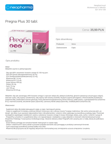 Neopharma.pl Mickiewicza 5, Mikstat 531-470-109 Pregna Plus 30 tabl. Cena: 35,99 PLN Opis słownikowy Producent Verco Zastosowanie Ciąża Opis produktu Skład Składniki czynne w jednej kapsułce: Olej rybi (65% zawartości kwasów omega 3) 100 mg tym: 33% EPA (kwas eikozapentaenowy) 33 mg 22% DHA(kwasdokozaheksaenowy) 22 mg Witamina B6 1,4 mg Witamina B12 2,5 µg Kwas foliowy 400 µg Żelazo 26 mg Cynk 10 mg Jod 150 µg Witamina D3 20 µg Składniki: olej rybi zawierający 65% kwasów omega-3, siarczan żelaza (II), żelatyna (osłonka), glicerol substancja utrzymująca wilgoć), siarczan cynku, olej sojowy uwodorniony, olej sojowy rafi nowany (nośniki), lecytyna sojowa (emulgator), chlorowodorek pirydoksyny (witamina B6), średniołańcuchowe glicerydy, kwas pteroilomonoglutaminowy (kwas foliowy), jodek potasu, cyjanokobalamina (witamina B12), mannitol (nośnik), dwutlenek tytanu (barwnik), czerwony tlenek żelaza (barwnik), cholekalcyferol (witamina D3). Właściwości Suplement diety dla kobiet planujących ciążę, w ciąży i karmiących piersią. Ciąża to wyjątkowe 9 miesięcy, podczas których troszczysz się o zdrowy rozwój Twojego maleństwa. Nie wolno wówczas jeść „za dwoje”, ale dieta musi zawierać odpowiednie ilości mikroelementów i witamin, które wpływają na prawidłowy przebieg ciąży. Powinnaś szczególnie zapobiegać niedoborom sześciu substancji: kwasów omega-3, kwasu foliowego, żelazu, jodu, cynku i witamin z grupy B. PregnaPlus umożliwi Ci uzupełnienie diety w te najważniejsze i niezbędne w ciąży składniki w ilościach rekomendowanych przez Ekspertów Polskiego Towarzystwa Ginekologicznego. Staranie dobrany skład PregnaPLUSA zawarty jest w małej, łatwej do połknięcia kapsułce. Kwas foliowy pomaga we wzroście tkanek matczynych w czasie ciąży. Żelazo i witamina B12 biorą udział w procesie podziału komórek oraz pomagają w produkcji czerwonych krwinek. Cynk wspomaga prawidłową syntezę białka oraz DNA. Witamina B6 przyczynia się do regulacji aktywności hormonalnej oraz zmniejszenia uczucia zmęczenia i znużenia. Plik wygenerowano: 02-03-2017 Oprogramowanie sklepu: AptusShop Neopharma.pl Mickiewicza 5, Mikstat 531-470-109 Kwasy omega – 3 DHA i EPA to budulec komórek nerwowych. Jod - niezbędny do syntezy hormonów tarczycy, które odgrywają znaczącą rolę w rozwoju ośrodkowego układu nerwowego. Witamina D3 pomaga w prawidłowym wykorzystywaniu wapnia i fosforu przez organizm kobiety. Przeciwwskazania Nadwrażliwość na którykolwiek ze składników preparatu. Stosowanie 1 kapsułka dziennie, najlepiej rano podczas posiłku. Plik wygenerowano: 02-03-2017 Powered by TCPDF (www.tcpdf.org) Oprogramowanie sklepu: AptusShop