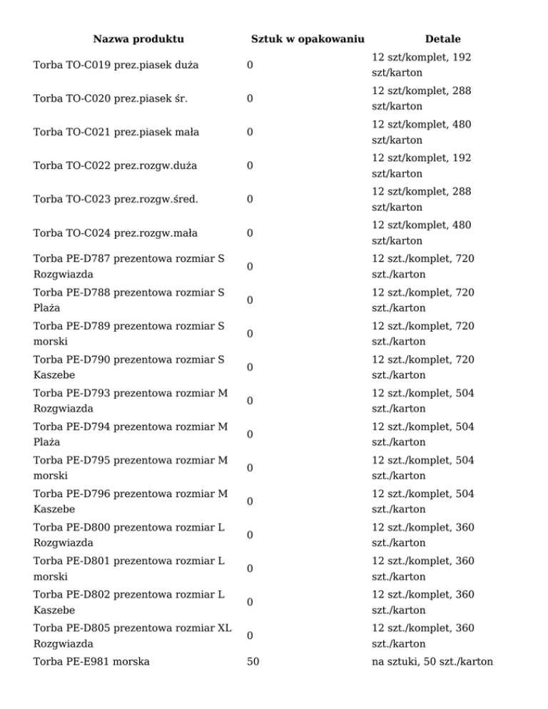 Nazwa produktu Sztuk w opakowaniu Torba TO-C019 prez.piasek duża 0 Torba TO-C020 prez.piasek śr. 0 Torba TO-C021 prez.piasek mała 0 Torba TO-C022 prez.rozgw.duża 0 Torba TO-C023 prez.rozgw.śred. 0 Torba TO-C024 prez.rozgw.mała 0 Torba PE-D787 prezentowa rozmiar S Rozgwiazda Torba PE-D788 prezentowa rozmiar S Plaża Torba PE-D789 prezentowa rozmiar S morski Torba PE-D790 prezentowa rozmiar S Kaszebe Torba PE-D793 prezentowa rozmiar M Rozgwiazda Torba PE-D794 prezentowa rozmiar M Plaża Torba PE-D795 prezentowa rozmiar M morski Torba PE-D796 prezentowa rozmiar M Kaszebe Torba PE-D800 prezentowa rozmiar L Rozgwiazda Torba PE-D801 prezentowa rozmiar L morski Torba PE-D802 prezentowa rozmiar L Kaszebe Torba PE-D805 prezentowa rozmiar XL Rozgwiazda Torba PE-E981 morska 0 0 0 0 0 0 0 0 0 0 0 0 50 Detale 12 szt/komplet, 192 szt/karton 12 szt/komplet, 288 szt/karton 12 szt/komplet, 480 szt/karton 12 szt/komplet, 192 szt/karton 12 szt/komplet, 288 szt/karton 12 szt/komplet, 480 szt/karton 12 szt./komplet, 720 szt./karton 12 szt./komplet, 720 szt./karton 12 szt./komplet, 720 szt./karton 12 szt./komplet, 720 szt./karton 12 szt./komplet, 504 szt./karton 12 szt./komplet, 504 szt./karton 12 szt./komplet, 504 szt./karton 12 szt./komplet, 504 szt./karton 12 szt./komplet, 360 szt./karton 12 szt./komplet, 360 szt./karton 12 szt./komplet, 360 szt./karton 12 szt./komplet, 360 szt./karton na sztuki, 50 szt./karton Nazwa produktu Sztuk w opakowaniu Detale Torba PE-E983 morska 50 na sztuki, 50 szt./karton Torba PE-E985 morska 50 na sztuki, 50 szt./karton Torba PE-E986 morska 50 na sztuki, 50 szt./karton Torba PE-E988 morska 50 na sztuki, 50 szt./karton