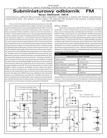 PRESS-POLSKA Nowy Elektronik, ul. Junaków 2, 82-300 Elbl¹g, tel./fax 055 236-22-63, e-mail: [email protected] Subminiaturowy odbiornik FM Nowy Elektronik 165-K Subminiaturowy odbiornik FM umo¿liwia odbiór programów nadawanych w pamie UKF. Posiada automatyczne wyszukiwanie stacji. Jest zasilany z dwóch baterii 1,5V (paluszki). Ma niezwykle ma³e wymiary, a przede wszystkim dobr¹ jakoæ odbioru. Pisz¹c ten artyku³ mia³em pewien problem, jak nazwaæ prezentowany w nim projekt. Pierwotny tytu³ to "Mój pierwszy odbiornik radiowy", jednak tu rozmin¹³bym siê z prawd¹, gdy¿ mój pierwszy odbiornik powsta³ w czasach, gdy niepodzielnie królowa³y "Kolibry" i konstrukcje rodem z "Eltry" na obudowach, których dumnie widnia³y napisy w stylu "7 tranzystorów". Tu nale¿y siê wyjanienie m³odszym czytelnikom, ¿e napis ten oznacza³ iloæ tranzystorów na "pok³adzie" w danej konstrukcji. Zmieni³y siê czasy i nikt ju¿ nie buduje odbiorników radiowych we w³asnym zakresie, gdy za rogiem, za przys³owiow¹ z³otówk¹ mo¿na nabyæ prosty radioodbiornik. Opisy budowy urz¹dzeñ w.cz. w tych odbiornikach radiowych nie pojawiaj¹ siê zbyt czêsto na ³amach prasy elektronicznej. Przyczyn jest wiele. Jedn¹ z nich jest niechêæ do wszelkich cewek i strojonych obwodów wielkiej czêstotliwoci, które s¹ nieodzown¹ czêci¹ typowego radioodbiornika oraz fakt, ¿e samodzielne zbudowanie i poprawne zestrojenie odbiornika radiowego jest pewnym rodzajem wyzwania dla elektronika amatora, od którego wymagana jest odpowiednia wiedza i dowiadczenie. Tymczasem na ³amach wspomnianych pism, w tym tak¿e NE niepodzielnie panuj¹ projekty, których opisy koñcz¹ siê sakramentalnym stwierdzeniem "poprawnie zmontowany uk³ad dzia³a od pierwszego w³¹czenia i nie wymaga uruchomienia". Wychodz¹c naprzeciw licznym probom, jednoczenie nie podnosz¹c poprzeczki i wymaganej wiedzy dla szanownych czytelników prezentujemy opis prostego odbiornika FM, odbiornika radiowego FM, którego opis monta¿u mo¿na zakoñczyæ "nie wymaga uruchomienia". Tu nale¿y siê wszystkim informacja, ¿e to nie ¿art ani konstrukcja prima-aprilisowa. Ta niezwyk³a konstrukcja to efekt zastosowania uk³adu TDA7088 f-my Philips, który nie nale¿y do nowoci na rynku komponentów elektronicznych, jednak jak na razie nie zosta³ dostrze¿ony i nie pojawi³a siê stosowna publikacja na ³amach NE. Przyczyn tego nale¿y siê dopatrywaæ w fakcie, ¿e uk³ad TDA7088 to odbiornik monofoniczny, nie posiadaj¹cy mo¿liwoci do³¹czenia doñ dekodera STEREO. Tu mo¿na by sobie zadaæ pytanie - do kogo kierowany jest niniejszy artyku³? Kto na pocz¹tku XXI wieku buduje odbiornik radiowy monofoniczny, gdy wszystkie stacje pracuj¹ce na zakresie FM nadaj¹ program STEREO? Prezentowany radioodbiornik nale¿y traktowaæ jako zabawkê, choæ jest pe³nozakresowym odbiornikiem FM, o niezwyk³ych mo¿liwociach i wymiarach zewnêtrznych równych pude³ku zapa³ek. Jednym z ciekawszych zastosowañ opisywanego radioodbiornika bêdzie zapewne wykorzystanie go w roli s³uchawek bezprzewodowych, pod warunkiem ¿e posiadany telewizor wyposa¿ymy w odpowiedni mininadajnik FM. Budowa i dzia³anie Schemat ideowy miniaturowego odbiornika FM przedstawia rys.1. Ju¿ na pierwszy rzut oka widaæ, ¿e "sercem" radioodbiornika jest scalony tuner-mikrokontroler TDA7088 f-my Philips, który jest kontynuacj¹ rodziny zapocz¹tkowanej wprowadzeniem na rynek uk³adu TDA7000. Tu nale¿y siê kilka wyjanieñ, i¿ w tunerach FM rodziny TDA78XX zastosowano niecodzienn¹ technologiê pêtli synchronizacji czêstotliwoci FLL, a poprzez obni¿enie czêstotliwoci poredniej do 70kHz mo¿liwe sta³o siê zast¹pienie niewygodnych i trudnych do strojenia indukcyjnych filtrów p.cz. aktywnymi filtrami RC. Nowum w uk³adzie TDA7088 to wprowadzenie elektronicznego strojenia sterowanego tylko dwoma przyciskami RUN i RESET. Uk³ad w swojej strukturze zawiera wszystkie niezbêdne podzespo³y do budowy superheterodynowego odbiornika FM. Jest stosunkowo skomplikowany, dlatego nie bêdzie dok³adnie opisywany, a jego podstawowe dane przedstawiono w tabeli 1. Wszystkich dociekliwych odsy³am do kart katalogowych f-my Philips, gdzie znajdziemy wyczerpuj¹ce kompendium wiedzy na temat wspomnianego uk³adu oraz wiele ciekawych aplikacji. Tabela 1 Podsta wowe dane uk³adu T DA70 88T Nap iê cie zasilania 3V (1,8 -5 V) Pr¹d zasilania 5 ,2mA (4,2-6,6) Zakre s o dbieranych czêstotliwoci 0,5 - 110MHz Sygna³ w yjcio wy audio 85 mV(60 -1 20) Czu³oæ w ejciowa 6µV Szybkoæ strojenia 2,8M Hz/sek. Prezentowane rozwi¹zanie to w zasadzie najprostsza z mo¿liwych aplikacji firmowych, wzbogacona jedynie o prosty wzmacniacz m.cz. Nie strojony obwód wejciowy tworzy cewka powietrzna L1, która wraz z kondensatorami C1,C2 dostrojona jest na czêstotliwoæ rodkow¹ odbieranego pasma 88-108. Rolê anteny pe³ni¹ s³uchawki, które wpiête s¹ wprost w dzielnik C3 L1 70nH C2 12 5 D1 L2 78nH CLP1 VIRF VOIF OSC VIF CLP2 C4 IC1 R1 RESET CLIM TDA7088T MUTE1 P1 15 C6 CAP LOOP C7 OUT AF 6 S³uchawki Stereo C8 L3 7 8 L4 C9 1 Rys. 1 Schemat subminiaturowego odbiornika FM W1A 2 C10 9 R5 10 C11 13 C12 1 C13 3 C14 3 5 7 + BAT R3 C16 T1 C18 T2 R2 W1B 6 2 C15 14 RUN TUNE GND 16 C5 P2 IFFB 1 C1 VIRF C17 R4 B1 B2 - BAT 1,5V 1,5V 1 11 VCC L1 5 zwoi srednica 4mm DNe 0,5mm L2 6 zwoi rednica 2,5 mm DNe 0,4 mm 4 G1 PRESS-POLSKA Nowy Elektronik, ul. Junaków 2, 82-300 Elbl¹g, tel./fax 055 236-22-63, e-mail: [email protected] C1,C2, a separowane od wzmacniacza m.cz. za pomoc¹ d³awików L3,L4. Rolê oscylatora pe³ni cewka L2, która wraz z kondensatorem C4 i diod¹ pojemnociow¹ D1 tworzy obwód rezonansowy przestrajany za pomoc¹ napiêcia pobieranego z koñcówki 16 TUNE. Proces strojeniaprzeszukiwania pasma odbywa siê po naciniêciu i zwolnieniu przycisku RUN, z jednoczesnym wyciszeniem sygna³u - uk³ad posiada funkcjê MUTE. Po dostrojeniu siê uk³adu do najbli¿szej stacji UKF FM strojenie zostaje zat
