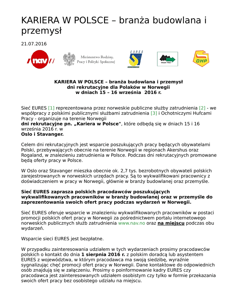 KARIERA W POLSCE – branża budowlana i przemysł 21.07.2016 KARIERA W POLSCE – branża budowlana i przemysł dni rekrutacyjne dla Polaków w Norwegii w dniach 15 – 16 września 2016 r. Sieć EURES [1] reprezentowana przez norweskie publiczne służby zatrudnienia [2] - we współpracy z polskimi publicznymi służbami zatrudnienia [3] i Ochotniczymi Hufcami Pracy - organizuje na terenie Norwegii dni rekrutacyjne pn. „Kariera w Polsce", które odbędą się w dniach 15 i 16 września 2016 r. w Oslo i Stavanger. Celem dni rekrutacyjnych jest wsparcie poszukujących pracy będących obywatelami Polski, przebywających obecnie na terenie Norwegii w regionach Akershus oraz Rogaland, w znalezieniu zatrudnienia w Polsce. Podczas dni rekrutacyjnych promowane będą oferty pracy w Polsce. W Oslo oraz Stavanger mieszka obecnie ok. 2,7 tys. bezrobotnych obywateli polskich zarejestrowanych w norweskich urzędach pracy. Są to wykwalifikowani pracownicy z doświadczeniem w pracy w Norwegii, głównie w branży budowlanej oraz przemyśle. Sieć EURES zaprasza polskich pracodawców poszukujących wykwalifikowanych pracowników w branży budowlanej oraz w przemyśle do zaprezentowania swoich ofert pracy podczas wydarzeń w Norwegii. Sieć EURES oferuje wsparcie w znalezieniu wykwalifikowanych pracowników w postaci promocji polskich ofert pracy w Norwegii za pośrednictwem portalu internetowego norweskich publicznych służb zatrudnienia www.nav.no oraz na miejscu podczas obu wydarzeń. Wsparcie sieci EURES jest bezpłatne. W przypadku zainteresowania udziałem w tych wydarzeniach prosimy pracodawców polskich o kontakt do dnia 1 sierpnia 2016 r. z polskim doradcą lub asystentem EURES z województwa, w którym pracodawca ma swoją siedzibę, wyraźnie sygnalizując chęć promocji ofert pracy w Norwegii. Dane kontaktowe do odpowiednich osób znajdują się w załączeniu. Prosimy o poinformowanie kadry EURES czy pracodawca jest zainteresowanych udziałem osobistym czy tylko w formie przekazania swoich ofert pracy bez osobistego udziału na miejscu. Doradca EURES wesprze pracodawcę w rejestracji oferty w powiatowym urzędzie pracy lub centrum edukacji i pracy młodzieży OHP. Oferty pracy powinny zostać przekazane do właściwego powiatowego urzędu pracy lub centrum edukacji i pracy młodzieży OHP najpóźniej do dnia 12 sierpnia br. Oferta pracy zostanie opublikowana w centralnej bazie ofert pracy www.oferty.praca.gov.pl. Prosimy pracodawców aby w ofertach pracy znalazły się dodatkowo informacje nt. rodzaju prowadzonej działalności firmy oraz czy pracodawca oferuje - obok wynagrodzenia - dodatkowe elementy uposażenia, wparcie przy przeniesieniu się do kraju lub integracji w miejscu pracy. Informacja te są niezbędne do zaprezentowania potencjalnym kandydatom. Zapraszamy do udziału w wydarzeniach. Departament Rynku Pracy Ministerstwa Rodziny, Pracy i Polityki Społecznej Zał. – lista osób do kontaktu. [1] Sieć EURES (Europejskie Służby Zatrudnienia) to sieć współpracy Komisji Europejskiej, administracji publicznych na szczeblu centralnym, publicznych służb zatrudnienia oraz innych wyznaczonych podmiotów krajowych, regionalnych i lokalnych z państw członkowskich UE/EOG. [2] Norweskie publiczne służby zatrudnienia reprezentuje organizacja pod nazwą NAV (Arbeids- og Velferdsforvaltningen). [3] Polskie publiczne służby zatrudnienia reprezentuje Ministerstwo Rodziny, Pracy i Polityki Społecznej wojewódzkie i powiatowe urzędy pracy Załączniki Dane kontaktowe (pdf)
