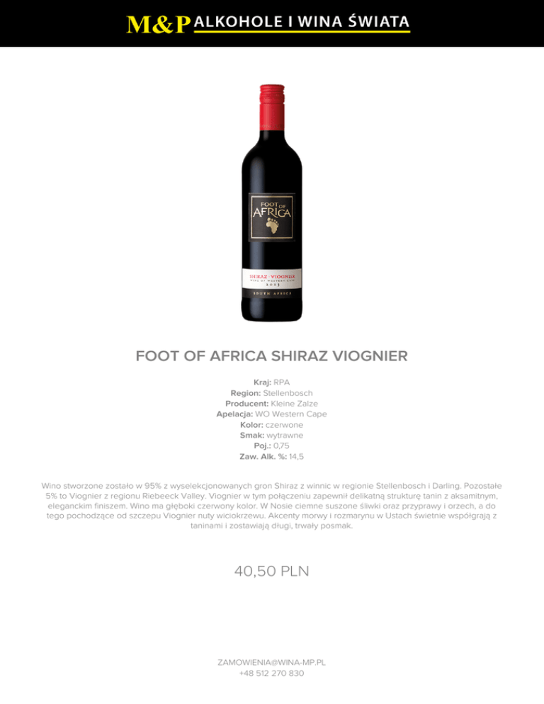FOOT OF AFRICA SHIRAZ VIOGNIER Kraj: RPA Region: Stellenbosch Producent: Kleine Zalze Apelacja: WO Western Cape Kolor: czerwone Smak: wytrawne Poj.: 0,75 Zaw. Alk. %: 14,5 Wino stworzone zostało w 95% z wyselekcjonowanych gron Shiraz z winnic w regionie Stellenbosch i Darling. Pozostałe 5% to Viognier z regionu Riebeeck Valley. Viognier w tym połączeniu zapewnił delikatną strukturę tanin z aksamitnym, eleganckim finiszem. Wino ma głęboki czerwony kolor. W Nosie ciemne suszone śliwki oraz przyprawy i orzech, a do tego pochodzące od szczepu Viognier nuty wiciokrzewu. Akcenty morwy i rozmarynu w Ustach świetnie współgrają z taninami i zostawiają długi, trwały posmak. 40,50 PLN [email protected] +48 512 270 830
