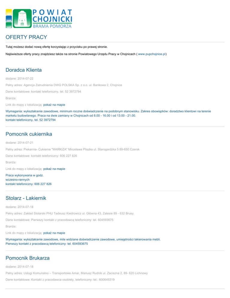 OFERTY PRACY Tutaj możesz dodać nową ofertę korzystając z przycisku po prawej stronie. Najświeższe oferty pracy znajdziesz także na stronie Powiatowego Urzędu Pracy w Chojnicach ( www.pupchojnice.pl) Doradca Klienta dodane: 2014-07-22 Pełny adres: Agencja Zatrudnienia DWG POLSKA Sp. z o.o. ul. Bankowa 2, Chojnice Dane kontaktowe: kontakt telefoniczny, tel. 52 3972794 Branża: Link do mapy z lokalizacją: pokaż na mapie Wymagania: wykształcenie zawodowe, minimum roczne doświadczenie na podobnym stanowisku. Zakres obowiązków: doradztwo klientowi na terenie marketu budowlanego. Praca na dwie zamiany w Chojnicach od 8.00 - 16.00 i od 13.00 - 21.00. kontakt telefoniczny, tel. 52 3972794 Pomocnik cukiernika dodane: 2014-07-21 Pełny adres: Piekarnia- Cukierna "MARKIZA" Mirosława Pliszka ul. Starogardzka 5 89-650 Czersk Dane kontaktowe: kontakt telefoniczny: 606 227 826 Branża: Link do mapy z lokalizacją: pokaż na mapie Praca wykonywana w godz. wczesno-rannych kontakt telefoniczny: 606 227 826 Stolarz - Lakiernik dodane: 2014-07-18 Pełny adres: Zakład Stolarski PHU Tadeusz Kiedrowicz ul. Główna 43, Zalesie 89 - 632 Brusy. Dane kontaktowe: Pierwszy kontakt z pracodawcą telefoniczny: tel. 604593675 Branża: Link do mapy z lokalizacją: pokaż na mapie Wymagania: wykształcenie zawodowe, mile widziane doświadczenie zawodowe, umiejętności lakierowania mebli. Pierwszy kontakt z pracodawcą telefoniczny: tel. 604593675 Pomocnik Brukarza dodane: 2014-07-18 Pełny adres: Usługi Komunalno – Transportowe Amar, Mariusz Rudnik ul. Zaciszna 2, 89- 620 Lichnowy Dane kontaktowe: Kontakt z pracodawca osobisty, telefoniczny: tel.: 600645319 Branża: Link do mapy z lokalizacją: pokaż na mapie Wymagania: mile widziane doświadczenie zawodowe, prawo jazdy kat. B., znajomość branży brukarskiej. Kontakt z pracodawca osobisty, telefoniczny: tel.: 600645319 Płytkarz dodane: 2014-07-18 Pełny adres: Zakład Ogólnobudowlany Józef Urbaniak Chojnice, Angowicka 52A Dane kontaktowe: Barbara Kitowska 52 3950 729 [email protected] Branża: Link do mapy z lokalizacją: pokaż na mapie Wymagania: wykształcenie zawodowe, mile widziane doświadczenie zawodowe, umiejetność układania glazury Barbara Kitowska 52 3950 729 [email protected] Pracownik magazynowy dodane: 2014-07-17 Pełny adres: Drew-Trans II Z. Wrzeszcz i Wspólnicy Sp. z o.o. ul. Składowa 12, 89-620 Chojnice Dane kontaktowe: Kontakt z pracodawcą: mailowy e-mail: [email protected] Branża: Link do mapy z lokalizacją: pokaż na mapie Wymagania: wykształcenie min. średnie, doświadczenie na podobnym stanowisku, znajomosć gospodarki magazynowej, uprawnienia na wózki widłowe, obsługa komputera, sumienność, dokładność, dyspozycyjność Kontakt z pracodawcą: mailowy e-mail: [email protected] Sprzedawca- umowa stażowa dodane: 2014-07-17 Pełny adres: Powiatowy Urząd Pracy w Chojnicach ul. Lichnowska 5 Dane kontaktowe: Referatem Pośrednictwa Pracy- hol- stanowisko nr 4 Branża: Link do mapy z lokalizacją: pokaż na mapie osoba zarejestrowana jako bezrobotna- spełniająca kryteria umowy stażowej, wiek do 25 lat Osoby zainteresowane proszone są o bezpośredni kontakt z Referatem Pośrednictwa Pracy- holstanowisko nr 4 Referatem Pośrednictwa Pracy- holstanowisko nr 4 Przedstawiciel Handlowy dodane: 2014-07-17 Pełny adres: BIZNES PARTNER s.c. Monika Kijkowska – Springer, Rafał Kopowski ul. Krzemieniecka 49, 54- 613 Wrocław Dane kontaktowe: Kontakt z pracodawcą telefoniczny: tel. 071 7900097 Branża: Link do mapy z lokalizacją: pokaż na mapie Wymagania: wykształcenie min. średnie, wiedzy na temat charakteru pracy przedstawiciela handlowego, wysokich zdolności interpersonalnych, doskonałej umiejętności samodzielnej organizacji pracy, wysokiej motywacji na cele sprzedażowe, Kontakt z pracodawcą telefoniczny: tel. 071 7900097 Technolog ds. osprzetu kablowego dodane: 2014-07-17 Pełny adres: RADPOL S.A. Człuchów ul. Stefana Batorego 14, 77 – 300 Człuchów Dane kontaktowe: Kontakt z pracodawcą telefoniczny: tel. 598342271 Branża: Link do mapy z lokalizacją: pokaż na mapie Wymagania: wykształcenie średnie technik elektryk lub wyższe o profilu elektrotechnicznym specjalność elektroenergetyka, znajomość zagadnieñ elektro – energetyki, mile widziane uprawnienia SEP – Eksploatacja Urządzeñ, Instalacji i Sieci na stanowisku eksploatacji i baz ograniczeñ napięć, b. dobra znajomość obsługi komputera w zakresie Office, Auto Cad, umiejętność pracy w grupie, komunikatywność, umiejętność efektywnej organizacji czasu pracy, znajomość języka angielskiego, prawo jazdy kat. B. Kontakt z pracodawcą telefoniczny: tel. 598342271 Pomoc Kuchenna dodane: 2014-07-17 Pełny adres: PRO – MOT Sp. z o.o. ul. Św. Jana 6, 83 – 250 Skarszewy Dane kontaktowe: Kontakt z pracodawcą telefoniczny: tel. 881288288, 506988210 lub email: [email protected] Branża: Link do mapy z lokalizacją: pokaż na mapie Wymagania: znajomość kuchni polskiej, umiejętność utrzymania czystości w miejscu pracy, Kontakt z pracodawcą telefoniczny: tel. 881288288, 506988210 lub email: [email protected] Mechanik samochodowy dodane: 2014-07-17 Pełny adres: AUTO-CENTRUM Piotr Korczak Topole 11 89-620 Chojnice Dane kontaktowe: Kontakt z pracodawcą telefoniczny lub osobisty w siedzibie firmy. Tel. 794 724 857 e-mail: [email protected] Branża: Link do mapy z lokalizacją: pokaż na mapie Wymagania: doświadczenie zawodowe Kontakt z pracodawcą telefoniczny lub osobisty w siedzibie firmy. Tel. 794 724 857 e-mail: [email protected] Robotnik gospodarczy dodane: 2014-07-17 Pełny adres: Powiatowy Urząd Pracy w Chojnicach ul. Lichnowska 5 Dane kontaktowe: 52 3950 729 [email protected] Branża: Link do mapy z lokalizacją: pokaż na mapie Oferta pracy w ramach programu dla osób bezrobotnych do 25 roku życia lub powyżej 50 roku życia. 52 3950 729 [email protected] Lakiernik dodane: 2014-07-17 Pełny adres: AUTO-CENTR