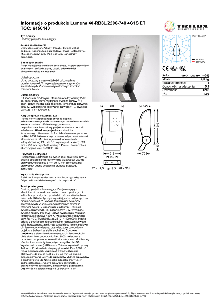 Informacje o produkcie Lumena 40-RB3L/2200-740 4G1S ET TOC: 6450440 Typ oprawy Diodowy projektor iluminacyjny. Plik TX044531 Zakres zastosowania Strefy dla pieszych, Arkady, Pasaże, Światło wokół budynku, Parkingi, Drogi zakładowe, Place kontenerowe, Miejsca magazynowe, Pola golfowe, Nartostrady, Iluminacja. c0-c180 c90-c270 Sposoby montażu Pałąk mocujący z aluminium do montażu na powierzchniach poziomych i sufitach, a przy użyciu odpowiednich akcesoriów także na masztach. Kolor srebrnoszary ( ···03) Masa 7,0 kg Klasa ochronności I Odporność na uderzenia 5J Szczelność IP66 η LB 1,00 Układ optyczny Układ optyczny z wysokiej jakości odpornych na promieniowanie UV i wysoką temperaturę systemów soczewkowych. Z obrotowo-symetrycznym szerokim rozsyłem światła. Układ diodowy Z 4 modułami diodowymi. Strumień świetlny oprawy 2200 lm, pobór mocy 19 W, wydajność świetlna oprawy 116 lm/W. Barwa światła biała neutralna, temperatura barwowa 4000 K, współczynnik oddawania barw Ra > 70. Trwałość L80 (tq 25 °C) = 100.000 h. 290 145 216 140 72 Przyłącze elektryczne Podłączenie elektryczne do dwóch kabli po 3 x 2,5 mm². Z dwoma połączeniami śrubowymi do przewodów M20 do przewodów o średnicy 6 mm do 12 mm jako odciążka przewodów. Jedno połączenie śrubowe przewodu zamknięte. 130 446 393 Korpus oprawy oświetleniowej Płaska osłona z poddanego obróbce cieplnej jednowarstwowego szkła hartowanego, zamknięta szczelnie w ramce z odlewu ciśnieniowego, otwierana, przytwierdzona do obudowy projektora śrubami ze stali szlachetnej. Obudowa projektora z aluminium formowanego ciśnieniowo, kolor białe aluminium, podobny do RAL 9006, lakierowana proszkowo, odporna na warunki atmosferyczne. Możliwe są również inne warianty kolorystyczne wg RAL lub DB. Wymiary (dł. x szer.): 523 mm x 290 mm, wysokość oprawy 145 mm. Powierzchnia ekspozycji na wiatr Fw = 0,057 m². 20 x 12,5 12,5 20 x 12,5 Wykonanie elektryczne Z elektronicznym zasilaczem, z możliwością przełączania. Odporność na działanie napięć udarowych 4 kV. Tekst przetargowy Diodowy projektor iluminacyjny. Pałąk mocujący z aluminium do montażu na powierzchniach poziomych i sufitach, a przy użyciu odpowiednich akcesoriów także na masztach. Układ optyczny z wysokiej jakości odpornych na promieniowanie UV i wysoką temperaturę systemów soczewkowych. Z obrotowo-symetrycznym szerokim rozsyłem światła. Z 4 modułami diodowymi. Strumień świetlny oprawy 2200 lm, pobór mocy 19 W, wydajność świetlna oprawy 116 lm/W. Barwa światła biała neutralna, temperatura barwowa 4000 K, współczynnik oddawania barw Ra > 70. Trwałość L80 (tq 25 °C) = 100.000 h. Płaska osłona z poddanego obróbce cieplnej jednowarstwowego szkła hartowanego, zamknięta szczelnie w ramce z odlewu ciśnieniowego, otwierana, przytwierdzona do obudowy projektora śrubami ze stali szlachetnej. Obudowa projektora z aluminium formowanego ciśnieniowo, kolor białe aluminium, podobny do RAL 9006, lakierowana proszkowo, odporna na warunki atmosferyczne. Możliwe są również inne warianty kolorystyczne wg RAL lub DB. Wymiary (dł. x szer.): 523 mm x 290 mm, wysokość oprawy 145 mm. Powierzchnia ekspozycji na wiatr Fw = 0,057 m². Klasa ochronności I, szczelność IP66. Podłączenie elektryczne do dwóch kabli po 3 x 2,5 mm². Z dwoma połączeniami śrubowymi do przewodów M20 do przewodów o średnicy 6 mm do 12 mm jako odciążka przewodów. Jedno połączenie śrubowe przewodu zamknięte. Z elektronicznym zasilaczem, z możliwością przełączania. Odporność na działanie napięć udarowych 4 kV. Wszystkie dane techniczne oraz informacje o masie i wymiarach zostały sporządzone z najwyższą starannością. Błędy zastrzeżone. Ilustracje produktów są jedynie przykładowe i mogą odbiegać od oryginału. Zastrzega się możliwość dokonywania zmian służących ro © TRILUX GmbH & Co. KG 2017/01/22 APPR