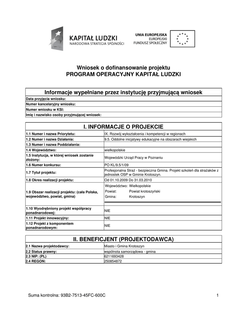 Wniosek o dofinansowanie projektu PROGRAM OPERACYJNY KAPITAŁ LUDZKI Informacje wypełniane przez instytucję przyjmującą wniosek Data przyjęcia wniosku: Numer kancelaryjny wniosku: Numer wniosku w KSI: Imię i nazwisko osoby przyjmującej wniosek: I. INFORMACJE O PROJEKCIE 1.1 Numer i nazwa Priorytetu: IX. Rozwój wykształcenia i kompetencji w regionach 1.2 Numer i nazwa Działania: 9.5. Oddolne inicjatywy edukacyjne na obszarach wiejskich 1.3 Numer i nazwa Poddziałania: 1.4 Województwo: wielkopolskie 1.5 Instytucja, w której wniosek zostanie złożony: Wojewódzki Urząd Pracy w Poznaniu 1.6 Numer konkursu: PO KL/9.5/1/09 1.7 Tytuł projektu: Profesjonalna Straż - bezpieczna Gmina. Projekt szkoleń dla strażaków z jednostek OSP w Gminie Krotoszyn. 1.8 Okres realizacji projektu: Od 01.10.2009 Do 31.03.2010 Województwo: Wielkopolskie 1.9 Obszar realizacji projektu: (cała Polska, województwo, powiat, gmina) Powiat: Powiat krotoszyński Gmina: Krotoszyn 1.10 Wyodrębniony projekt współpracy ponadnarodowej: NIE 1.11 Projekt innowacyjny: NIE 1.12 Projekt z komponentem ponadnarodowym: NIE II. BENEFICJENT (PROJEKTODAWCA) 2.1 Nazwa projektodawcy: Miasto i Gmina Krotoszyn 2.2 Status prawny: 2.3 NIP: (PL) 2.4 REGON: wspólnota samorządowa - gmina 6211693428 250854872 Suma kontrolna: 93B2-7513-45FC-600C 1 2.5 Adres siedziby: Ulica: Kołłątaja Nr domu: 7 Nr lokalu: - Miejscowość: Krotoszyn Kod pocztowy: 63-700 2.6 Osoba/y uprawniona do podejmowania decyzji wiążących w imieniu projektodawcy: 2.7 Osoba do kontaktów roboczych: 2.7.1 Numer telefonu: 2.7.2 Adres poczty elektronicznej: 2.7.3 Numer faksu: 2.7.4 Adres: 2.8 Partnerzy: Telefon: 62 722 74 01 Fax: 62 725 34 36 Julian Jokś Janusz Kalak 606 710 994 [email protected] 62 725 34 36 63-700 Krotoszyn, ul. Kołłątaja 7 NIE III. CHARAKTERYSTYKA PROJEKTU (maksymalnie 20 000 znaków) 3.1 Cel projektu 1. Uzasadnij potrzebę realizacji projektu (wskaż problem/y który/e chcesz rozwiązać) 2. Wskaż cel ogólny oraz cele szczegółowe projektu. 3. Uzasadnij zgodność celów z PO KL, Planem Działań (i innymi dokumentami strategicznymi) Projekt bezpłatnych szkoleń z zakresu prawa jazdy kat. C dla strażaków z jednostek Ochotniczej Straży Pożarnej składany przez Miasto i Gminę Krotoszyn został przygotowany w odpowiedzi na potrzeby lokalnej społeczności. Analiza potrzeb przeprowadzona z wykorzystaniem ankiet badawczych wśród członków Ochotniczych Jednostek Straży Pożarnej w gminie Krotoszyn, wskazuje na wysoką potrzebę podnoszenia przez nich specjalistycznych kwalifikacji zawodowych. Ankietowani wskazują na brak umiejętności i uprawnień niezbędnych do bezpiecznego i skutecznego wykonywania powierzonych im zadań, co z kolei przekłada się na zmniejszenie możliwości operacyjnych jednostek. Strażacy ochotnicy wskazują ponadto, iż brak odpowiednich kwalifikacji utrudnia uzyskanie stałego zatrudnienia w jednostkach Państwowej Straży Pożarnej. Charakter funkcjonowania Straży Pożarnej zmienił się na przestrzeni ostatnich lat. Jednostki są dziś zasadniczym ogniwem akcji ratowniczych nie tylko w czasie pożarów, ale również podczas coraz częstszych klęsk żywiołowych, katastrof budowlanych czy wypadków drogowych. Straż w trakcie akcji ratowniczych wykorzystuje specjalistyczny sprzęt i pojazdy ciężkie, który wymaga stosownych uprawnień od osób go obsługujących. Niesie to za sobą konieczność indywidualnej specjalizacji strażaków w ramach poszczególnych jednostek. Tymczasem często nie są oni przygotowani, nie posiadają wystarczających kwalifikacji zawodowych do pełnienia nowych ról. Powyższa sytuacja dotyka zwłaszcza jednostek Ochotniczych Straży Pożarnych z obszarów wiejskich i wiejsko-miejskich, w których dostęp do specjalistycznych szkoleń jest utrudniony. Obszary wiejskie są miejscem spiętrzenia wielu problemów rozwojowych, które na ogół są trudniejsze do rozwiązania niż na terenie miast, ze względu na mniejszy potencjał organizacyjny. Na terenie gminy Krotoszyn funkcjonują 22 jednostki Ochotniczej Straży Pożarnej (OSP), w tym 3 jednostki w ramach Krajowego Systemu Ratowniczo-Gaśniczego. Ochotniczy charakter służby, częsta rotacja kadr w połączeniu z małą liczbą strażaków posiadających prawo jazdy kat. C powoduje, iż potencjał jednostek OSP nie jest w pełni wykorzystywany, co z kolei nie pozwala na zapewnienie odpowiedniego poziomu bezpieczeństwa mieszkańcom gminy. Miasto i Gmina Krotoszyn w odpowiedzi na zdefiniowany wyżej problem wystąpiło z inicjatywą realizacji specjalistycznych szkoleń z zakresu prawa jazdy kat. C dla strażaków członków OSP z wykorzystaniem funduszy unijnych. Realizacja projektu, dzięki dofinansowaniu ze środków unijnych pozwoli na zniwelowanie wskazanych barier i zorganizowanie bezpłatnych, ogólnodostępnych kursów. W szerszym kontekście realizacja projektu przyczyni się do zwiększenia ogólnego poziomu bezpieczeństwa mieszkańców gminy Krotoszyn, oraz zwiększenia możliwości operacyjnych Straży Pożarnej. Ponadto podniesienie kwalifikacji zawodowych członków OSP zwiększa szanse na uzyskanie przez nich zatrudnienia w zawodowych jednostkach PSP. Cel główny: Głównym celem projektu jest utrzymanie odpowiedniej gotowości operacyjno-technicznej jednostek ochrony przeciwpożarowej w gminie Krotoszyn poprzez podniesienie kwalifikacji strażaków z Ochotniczych Jednostek Straży Pożarnej w zakresie prawa jazdy kat. C Cele szczegółowe: - zorganizowanie bezpłatnych kursów prawa jazdy dla 14 strażaków w okresie listopad 2009 - luty 2010 - nabycie uprawnień do prowadzenia pojazdów o masie całkowitej przekraczającej 3,5 t przez strażaków z jednostek OSP z gminy Krotoszyn - stworzenie warunków do podnoszenia kwalifikacji i doskonalenia zawodowego dla strażaków z obszarów wiejskich i Suma kontrolna: 93B2-7513-45FC-600C 2 wiejsko-miejskich Cele projektu w szerszym kontekście wp