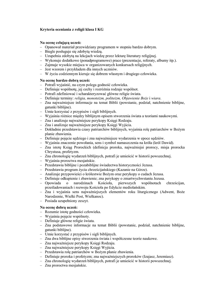 Kryteria oceniania z religii klasa I KG Na ocenę celującą uczeń