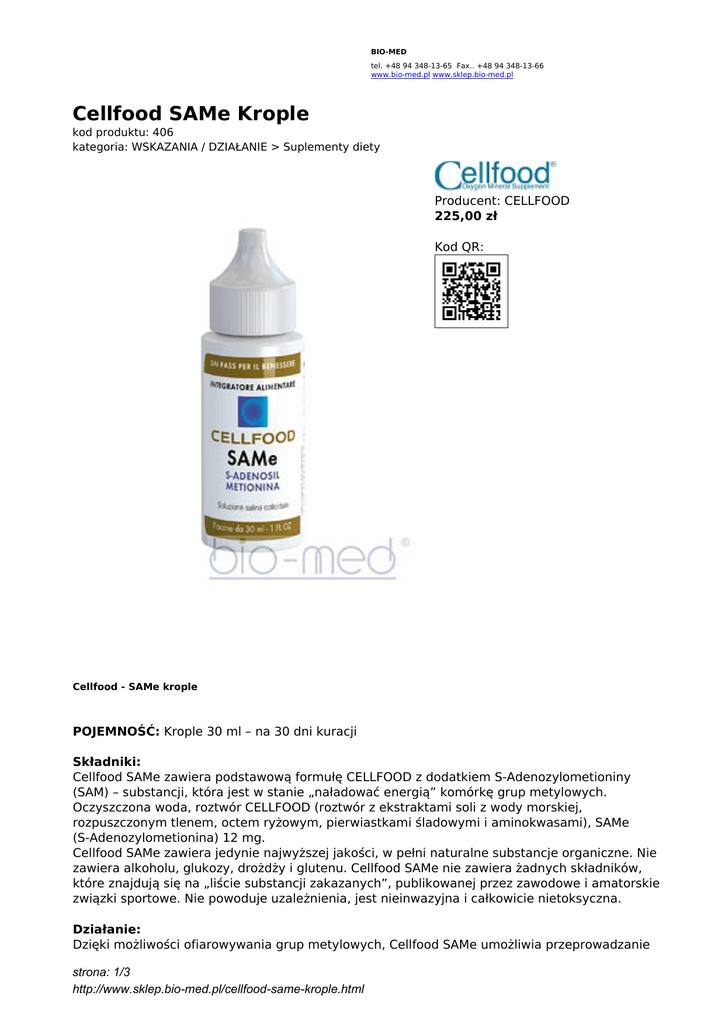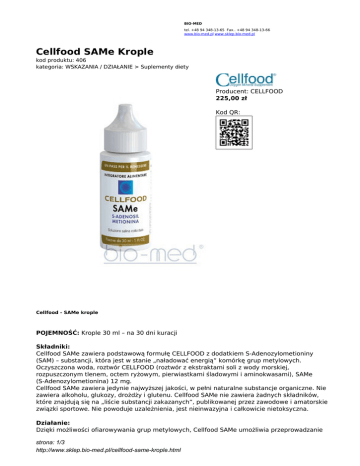 BIO-MED tel. +48 94 348-13-65 Fax.. +48 94 348-13-66 www.bio-med.pl www.sklep.bio-med.pl Cellfood SAMe Krople kod produktu: 406 kategoria: WSKAZANIA / DZIAŁANIE > Suplementy diety Producent: CELLFOOD 225,00 zł Kod QR: Cellfood - SAMe krople POJEMNOŚĆ: Krople 30 ml – na 30 dni kuracji Składniki: Cellfood SAMe zawiera podstawową formułę CELLFOOD z dodatkiem S-Adenozylometioniny (SAM) – substancji, która jest w stanie „naładować energią” komórkę grup metylowych. Oczyszczona woda, roztwór CELLFOOD (roztwór z ekstraktami soli z wody morskiej, rozpuszczonym tlenem, octem ryżowym, pierwiastkami śladowymi i aminokwasami), SAMe (S-Adenozylometionina) 12 mg. Cellfood SAMe zawiera jedynie najwyższej jakości, w pełni naturalne substancje organiczne. Nie zawiera alkoholu, glukozy, drożdży i glutenu. Cellfood SAMe nie zawiera żadnych składników, które znajdują się na „liście substancji zakazanych”, publikowanej przez zawodowe i amatorskie związki sportowe. Nie powoduje uzależnienia, jest nieinwazyjna i całkowicie nietoksyczna. Działanie: Dzięki możliwości ofiarowywania grup metylowych, Cellfood SAMe umożliwia przeprowadzanie strona: 1/3 http://www.sklep.bio-med.pl/cellfood-same-krople.html licznych funkcji powiązanych z tą grupą atomów, prowadząc do znaczącej poprawy funkcjonowania błon biologicznych, przywracając równowagę układowi neurotransmisji oraz wspierając poprawę samopoczucia (oddziałuje na centralny układ nerwowy). Dodatkowo Cellfood SAMe wzmacnia reakcje detoksykacji poprzez wpływanie na działanie wątroby. Kiedy stosować: Cellfood SAMe to bardzo przydatny produkt w trakcie leczenia symptomów depresji, migren, a także stanów zapalnych kości, stawów i mięśni oraz bólu (osteopenia, artretyzm, fibromialgia). Co więcej produkt ten bardzo skutecznie wspiera usuwanie i wydalanie substancji toksycznych z organizmu oraz spowalnia proces starzenia. Jak stosować: Potrząśnij butelką przed użyciem, a następnie zastosuj 10 kropli pod językiem, dwa razy na dobę. Przed połknięciem odczekaj około 30 sekund. Dawkowanie i wydajność preparatu: Cellfood SAMe oferowane jest w opakowaniu 30 ml, które wystarcza na 30 dobowych dawek przy przyjmowaniu 10 kropli dwa razy dziennie. Opis: Dobre samopoczucie fizyczne i psychiczne oraz optymalna detoksykacja. Przenoszenie niewielkiej grupy atomów (grupa metylowa) pomiędzy różnymi molekułami pozwala komórkom na syntezę DNA (miejsce przechowywania informacji genetycznej), umożliwia produkcję niezwykle ważnego przeciwutleniacza i substancji odtruwającej przez wątrobę, tj. glutationu, a także pozwala różnym tkankom na wytwarzanie ważnych elementów składowych błon komórkowych, czyli fosfolipidów. Dzięki takiemu działaniu wiele hormonów może korzystnie wpływać na funkcjonowanie całego organizmu, a wybrane neuroprzekaźniki (np. serotonina) poprawiają nastrój. Cellfood SAMe (wymawiane jako „sami”) to niezwykłe osiągnięcie chemii odżywczej. Firma NuScience Corporation to pierwsze i jedyne laboratorium w Ameryce, któremu udało się skroplić i utrzymać w formie stabilnej zawiesiny koloidalnej S-Adenozylometioninę – przełomową substancję potrafiącą zdziałać cuda. Co więcej, substancja ta została połączona z niedoścignionym systemem Cellfood dostarczającym składniki aktywne. Wynikiem takiej mieszanki jest ponadprzeciętny i wyjątkowy suplement diety, który stanowi wsparcie podczas zwalczania różnego rodzaju problemów. Poprawa nastroju. Cellfood SAMe przekazuje swoją grupę metylową do receptorów CNS, co z kolei prowadzi do zwiększenia aktywności i produkcji poprawiających nastrój neurotransmiterów, takich jak: serotonina, dopamina i norepinefryna (serotonina to neurotransmiter, którego poziom zwiększają takie leki jak Prozac). Zdrowe stawy. Cellfood SAMe wspiera proces absorbowania i zamiany grup siarczanowych w glikoproteiny, co pomaga utrzymać zdrową tkankę chrząstną i chroni stawy. Cysteina i glutation do produkty uboczne tego procesu, posiadające silne właściwości zwalczające stany zapalne i zmniejszające ból. Prawie 14 milionów Amerykanów, którzy cierpią na przewlekłe dolegliwości bólowe i stany zapalne, stosuje takie lekarstwa jak aspiryna, ibuprofen i acetaminofen (Tylenol). W przypadku dawek pozwalających uśmierzyć ból towarzyszący zapaleniu stawów te niesterydowe i przeciwzapalne leki (NSAID) powodują wręcz dewastujące efekty uboczne. Ponad 100 000 Ameryków każdego roku przyjmowanych jest do szpitali w związku z wrzodami wywołanymi przez leki NSAID, z czego ponad 16 000 umiera. Podczas kilkunastu badań klinicznych na ponad 22 000 pacjentach naukowcy wykazali, że formuła SAMe działa tak samo skutecznie jak farmakoterapia w przypadku dolegliwości bólowych i stanów zapalnych, jednak bez wywoływania żadnych uszkodzeń układu trawiennego, zaburzeń seksualnych, zespołu suchych ust lub nudności. Zdrowa wątroba. W wątrobie formuła Cellfood SAMe wzmacnia produkcję i absorpcję GSH, który odpowiada strona: 2/3 http://www.sklep.bio-med.pl/cellfood-same-krople.html głównie za usuwanie z organizmu niebezpiecznych toksyn. Z uwagi na nieprzerwaną walkę wątroby z toksynami odpowiednie stężenie glutationu jest kluczowe dla przeżycia. Uszkodzenia występują w momencie, gdy wątroba jest zmuszona do przetworzenia takiej ilości toksyn, że nie jest już w stanie produkować wystarczających poziomów glutationu. Część z tego obciążenia spada na formułę SAM-e, która staje się niezbędnym składnikiem procesu tworzenia glutationu. Uwaga: Osoby cierpiące na zaburzenia afektywne dwubiegunowe lub zespół serotoninowy powinny skonsultować się z lekarzem przed rozpoczęciem terapii z zastosowaniem Cellfood SAMe. strona: 3/3 http://www.sklep.bio-med.pl/cellfood-same-krople.html
