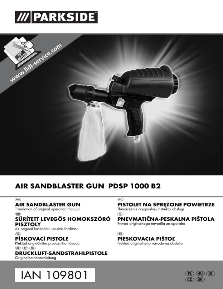 AIR SANDBLASTER GUN PDSP 1000 B2 AIR SANDBLASTER GUN PISTOLET NA SPRĘŻONE POWIETRZE SŰRÍTETT LEVEGŐS HOMOKSZÓRÓ PISZTOLY PNEVMATIČNA-PESKALNA PIŠTOLA PÍSKOVACÍ PISTOLE PIESKOVACIA PIŠTOĽ Translation of original operation manual Tłumaczenie oryginalnej instrukcji obsługi Prevod originalnega navodila za uporabo Az originál használati utasítás fordítása Překlad originálního provozního návodu DRUCKLUFT-SANDSTRAHLPISTOLE Originalbetriebsanleitung IAN 109801 Preklad originálneho návodu na obsluhu Before reading, unfold the page containing the illustrations and familiarise yourself with all functions of the device. Przed przeczytaniem proszę rozłożyć stronę z ilustracjami, a następnie proszę zapoznać się z wszystkimi funkcjami urządzenia. Olvasás előtt kattintson az ábrát tartalmazó oldalra és végezetül ismerje meg a készülék mindegyik funkcióját. Pred branjem odprite stran s slikami in se nato seznanite z vsemi funkcijami naprave. Před čtením si otevřete stranu s obrázky a potom se seznamte se všemi funkcemi přístroje. Pred čítaním si odklopte stranu s obrázkami a potom sa oboznámte so všetkými funkciami prístroja. Klappen Sie vor dem Lesen die Seite mit den Abbildungen aus und machen Sie sich anschließend mit allen Funktionen des Gerätes vertraut. GB PL HU SI CZ SK DE / AT / CH Translation of original operation manual Tłumaczenie oryginalnej instrukcji obsługi Az originál használati utasítás fordítása Prevod originalnega navodila za uporabo Překlad originálního provozního návodu Preklad originálneho návodu na obsluhu Originalbetriebsanleitung Page Strona Oldal Stran Strana Strana Seite 1 9 17 25 33 41 49 2x 23 17 16 21 22 19 24 18 29 20 14 2 15 1 2 14 30 25 26 27 13 28 12 3 10 4 9 33 32 31 11 5 6 7 8 Contents GB Introduction . . . . . . . . . . . . . . . . . . . . . . . . . . . . . . . . . . . . . . . . . . . . . . . . . . . . . . 2 Proper use . . . . . . . . . . . . . . . . . . . . . . . . . . . . . . . . . . . . . . . . . . . . . . . . . . . . . . . . . . . . . . . . . Features . . . . . . . . . . . . . . . . . . . . . . . . . . . . . . . . . . . . . . . . . . . . . . . . . . . . . . . . . . . . . . . . . . . Package contents . . . . . . . . . . . . . . . . . . . . . . . . . . . . . . . . . . . . . . . . . . . . . . . . . . . . . . . . . . . . Technical details . . . . . . . . . . . . . . . . . . . . . . . . . . . . . . . . . . . . . . . . . . . . . . . . . . . . . . . . . . . . . 2 2 2 2 General safety notices . . . . . . . . . . . . . . . . . . . . . . . . . . . . . . . . . . . . . . . . . . . . . 3 Workplace safety . . . . . . . . . . . . . . . . . . . . . . . . . . . . . . . . . . . . . . . . . . . . . . . . . . . . . . . . . . . . 3 Device-specific safety instructions for compressed air sandblasters . . . . . . . . . . . . . . . . . . . . . . 3 Operation . . . . . . . . . . . . . . . . . . . . . . . . . . . . . . . . . . . . . . . . . . . . . . . . . . . . . . . 4 Connecting the compressed air supply . . . . . . . . . . . . . . . . . . . . . . . . . . . . . . . . . . . . . . . . . . . Filling the blasting medium container . . . . . . . . . . . . . . . . . . . . . . . . . . . . . . . . . . . . . . . . . . . . . Mount the collecting bag for sandblasting material . . . . . . . . . . . . . . . . . . . . . . . . . . . . . . . . . . Select and fitting attachments . . . . . . . . . . . . . . . . . . . . . . . . . . . . . . . . . . . . . . . . . . . . . . . . . . . Using the compressed air sandblaster gun. . . . . . . . . . . . . . . . . . . . . . . . . . . . . . . . . . . . . . . . . Collecting bag for sandblasting material . . . . . . . . . . . . . . . . . . . . . . . . . . . . . . . . . . . . . . . . . . 4 4 5 5 5 5 Troubleshooting . . . . . . . . . . . . . . . . . . . . . . . . . . . . . . . . . . . . . . . . . . . . . . . . . . 6 Components . . . . . . . . . . . . . . . . . . . . . . . . . . . . . . . . . . . . . . . . . . . . . . . . . . . . . 6 Maintenance and Cleaning . . . . . . . . . . . . . . . . . . . . . . . . . . . . . . . . . . . . . . . . . 7 Disposal . . . . . . . . . . . . . . . . . . . . . . . . . . . . . . . . . . . . . . . . . . . . . . . . . . . . . . . . . 7 Warranty . . . . . . . . . . . . . . . . . . . . . . . . . . . . . . . . . . . . . . . . . . . . . . . . . . . . . . . . 7 Service . . . . . . . . . . . . . . . . . . . . . . . . . . . . . . . . . . . . . . . . . . . . . . . . . . . . . . . . . . 7 Importer . . . . . . . . . . . . . . . . . . . . . . . . . . . . . . . . . . . . . . . . . . . . . . . . . . . . . . . . 7 Translation of the original Conformity Declaration . . . . . . . . . . . . . . . . . . . . . . 8 PDSP 1000 B2 1 GB AIR SANDBLASTER GUN PDSP 1000 B2 Introduction Package contents Congratulations on the purchase of your new appliance. You have selected a highquality product. The operating instructions are part of this product. They contain important information about safety, use and disposal. Before using the product, familiarise yourself with all operating and safety instructions. Use this product only as described and only for the specified areas of application. Please also pass these operating instructions on to any future owner(s). 1 point attachment Proper use Working pressure: 6.3 bar The PDSP 1000 B2 sandblaster gun (hereinafter appliance) is suitable for: the removal of rust and paint from metal surfaces. Any other usage of or modification to the appliance is deemed to be improper usage and carries the risk of serious personal injury. The manufacturer accepts no responsibility for damage(s) resulting from improper usage. This appliance in intended only for domestic use. Air consumption: 320 l/min Container capacity: 900 ml Required air quality: cleaned and oil-free Features Noise and vibration data: WARNING! Air sandblaster gun Nipple for air connection Trigger 1 air sandblaster gun PDSP 1000 B2 1 surface attachment 1 edge attachment 1 interior corner attachment 1