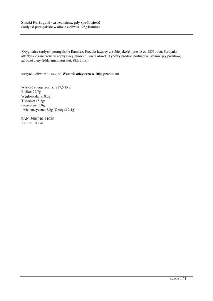 Smaki Portugalii - zrozumiesz, gdy spróbujesz! Sardynki portugalskie w oliwie z oliwek 125g Ramirez Oryginalne sardynki portugalskie Ramirez. Produkt łączący w sobie jakość i prestiż od 1853 roku. Sardynki atlantyckie zanurzone w najwyższej jakości oliwie z oliwek. Typowy produkt portugalski stanowiący podstawę zdrowej diety śródziemnomorskiej. Składniki: sardynki, oliwa z oliwek, sólWartość odżywcza w 100g produktu: Wartość energetyczna: 227,5 Kcal Białko: 22,7g Węglowodany: 0,0g Tłuszcze: 18,2g: - nasycone: 3,8g - wielonasycone: 6,2g (Omega3 2,1g) EAN: 5601010111035 Karton: 100 szt. strona 1 / 1