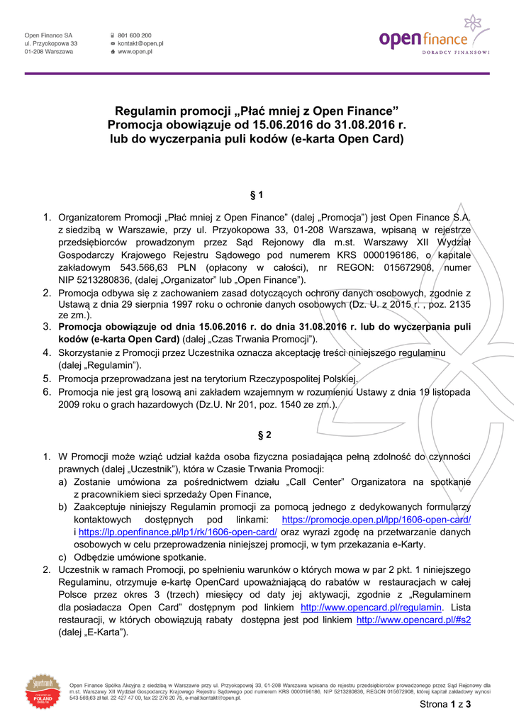 Regulamin promocji „Płać mniej z Open Finance” Promocja obowiązuje od 15.06.2016 do 31.08.2016 r. lub do wyczerpania puli kodów (e-karta Open Card) §1 1. Organizatorem Promocji „Płać mniej z Open Finance” (dalej „Promocja”) jest Open Finance S.A. 2. 3. 4. 5. 6. z siedzibą w Warszawie, przy ul. Przyokopowa 33, 01-208 Warszawa, wpisaną w rejestrze przedsiębiorców prowadzonym przez Sąd Rejonowy dla m.st. Warszawy XII Wydział Gospodarczy Krajowego Rejestru Sądowego pod numerem KRS 0000196186, o kapitale zakładowym 543.566,63 PLN (opłacony w całości), nr REGON: 015672908, numer NIP 5213280836, (dalej „Organizator” lub „Open Finance”). Promocja odbywa się z zachowaniem zasad dotyczących ochrony danych osobowych, zgodnie z Ustawą z dnia 29 sierpnia 1997 roku o ochronie danych osobowych (Dz. U. z 2015 r. , poz. 2135 ze zm.). Promocja obowiązuje od dnia 15.06.2016 r. do dnia 31.08.2016 r. lub do wyczerpania puli kodów (e-karta Open Card) (dalej „Czas Trwania Promocji”). Skorzystanie z Promocji przez Uczestnika oznacza akceptację treści niniejszego regulaminu (dalej „Regulamin”). Promocja przeprowadzana jest na terytorium Rzeczypospolitej Polskiej. Promocja nie jest grą losową ani zakładem wzajemnym w rozumieniu Ustawy z dnia 19 listopada 2009 roku o grach hazardowych (Dz.U. Nr 201, poz. 1540 ze zm.). §2 1. W Promocji może wziąć udział każda osoba fizyczna posiadająca pełną zdolność do czynności prawnych (dalej „Uczestnik”), która w Czasie Trwania Promocji: a) Zostanie umówiona za pośrednictwem działu „Call Center” Organizatora na spotkanie z pracownikiem sieci sprzedaży Open Finance, b) Zaakceptuje niniejszy Regulamin promocji za pomocą jednego z dedykowanych formularzy kontaktowych dostępnych pod linkami: https://promocje.open.pl/lpp/1606-open-card/ i https://lp.openfinance.pl/lp1/rk/1606-open-card/ oraz wyrazi zgodę na przetwarzanie danych osobowych w celu przeprowadzenia niniejszej promocji, w tym przekazania e-Karty. c) Odbędzie umówione spotkanie. 2. Uczestnik w ramach Promocji, po spełnieniu warunków o których mowa w par 2 pkt. 1 niniejszego Regulaminu, otrzymuje e-kartę OpenCard upoważniającą do rabatów w restauracjach w całej Polsce przez okres 3 (trzech) miesięcy od daty jej aktywacji, zgodnie z „Regulaminem dla posiadacza Open Card” dostępnym pod linkiem http://www.opencard.pl/regulamin. Lista restauracji, w których obowiązują rabaty dostępna jest pod linkiem http://www.opencard.pl/#s2 (dalej „E-Karta”). Strona 1 z 3 §3 1. Każdy Uczestnik Promocji, który spełni warunki opisane w par. 2 ust. 1 Regulaminu otrzyma EKartę. W ramach Promocji każdy Uczestnik Promocji może otrzymać wyłącznie 1 (jedną) E-Kartę. W przypadku odbycia przez tego Uczestnika Promocji więcej niż 1 (jednego) spotkania Uczestnik ten otrzyma E-Kartę wyłącznie za pierwsze odbyte spotkanie. 2. Aby móc korzystać z E-Karty przed pierwszym użyciem Uczestnik powinien: a) Zainstalować aplikację Open Card na swoim urządzeniu mobilnym, b) Przejść do zakładki „użyj karty”, c) Wpisać numer E-Karty wybierając przycisk „użyj kodu promocyjnego”, d) Podać swoje dane i zarejestrować E-Kart. Każda karta w formie elektronicznej przypisana jest do Aplikacji Mobilnej zainstalowanej na konkretnym urządzeniu mobilnym Uczestnika, poprzez wpisanie kodu aktywacyjnego. 3. Uczestnik powinien zarejestrować otrzymaną E-Kartę zgodnie z par. 3 pkt. 2 powyżej do 30.09.2016 r. Po upływie tego terminu Uczestnik nie będzie mógł zarejestrować E-Karty i z niej skorzystać. 4. Rabaty udzielone przez restauracje uczestniczące w programie OpenCard, otrzymane z tytułu korzystania z e-karty nie stanowią jej równowartości pieniężnej, a Uczestnik nie ma możliwości wyboru pomiędzy nagrodą rzeczową a oznaczoną równowartością pieniężną. §4 E-Karty zostaną przesłane przez Organizatora Uczestnikom za pośrednictwem poczty e-mail na adres e-mail podany przez Uczestnika pracownikowi sieci sprzedaży Open Finance w terminie 5 (pięciu) dni roboczych od dnia spełnienia przez Uczestnika warunków, o których mowa w par. 2 ust 1 Regulaminu. §5 1. Prawo do składania reklamacji dotyczących przebiegu Promocji przysługuje każdemu Uczestnikowi Promocji. Reklamacje mogą być zgłaszane w Okresie Trwania Promocji lub po jej zakończeniu. a) w formie pisemnej na adres korespondencyjny Organizatora: Open Finance S.A., ul. Przyokopowa 33, 01-208 Warszawa z dopiskiem” Promocja „Płać mniej z Open Finance” lub b) drogą elektroniczną na adres e-mail: [email protected], o temacie „Promocja Płać mniej z Open Finance”. c) telefonicznie pod numerem telefonu 801 600 200 d) osobiście w oddziałach sprzedaży Organizatora. 2. Reklamacja powinna zawierać co najmniej: a) określenie osoby wnoszącej reklamację, b) opis zdarzenia stanowiącego podstawę reklamacji, Strona 2 z 3 c) żądanie reklamacyjne Uczestnika wraz z uzasadnieniem. W razie negatywnego rozpatrzenia reklamacji Uczestnik zostanie poinformowany o decyzji pisemnie, na adres podany w reklamacji w terminie 30 (słownie: trzydziestu) dni od daty skutecznego doręczenia za pośrednictwem polskiej placówki pocztowej operatora publicznego reklamacji, lub w terminie 30 dni od dnia złożenia telefonicznie lub osobiście w oddziale sprzedaży Organizatora reklamacji. §6 1. Dane Uczestników będą przetwarzane zgodnie z postanowieniami ustawy o ochronie danych osobowych. Administratorem danych osobowych Uczestników, zbieranych na potrzeby przystąpienia do Promocji jest Organizator. 2. Podanie danych osobowych ma charakter dobrowolny, ale jest niezbędne do wzięcia udziału w Promocji. Uczestnikom udostępniającym dane przysługuje prawo do dostępu do treści swoich danych oraz prawo do ich poprawiania. §7 1. Organizator zastrzega sobie prawo do zmiany Regulaminu w trakcie trwania Promocji, jeżeli nie spowoduje to pogorszenia wa