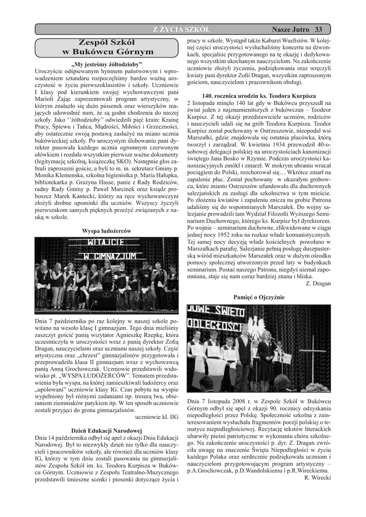 Z ŻYCIA SZKÓŁ Zespół Szkół w Bukówcu Górnym „My jesteśmy żółtodzioby” Uroczyście odśpiewanym hymnem państwowym i wprowadzeniem sztandaru rozpoczęliśmy bardzo ważną uroczystość w życiu pierwszoklasistów i szkoły. Uczniowie I klasy pod kierunkiem swojej wychowawczyni pani Marioli Zając zaprezentowali program artystyczny, w którym znalazło się dużo piosenek oraz wierszyków mających udowodnić nam, że są godni chodzenia do naszej szkoły. Jako ‘’żółtodzioby’’ odwiedzili pięć krain: Krainę Pracy, Śpiewu i Tańca, Mądrości, Miłości i Grzeczności, aby ostatecznie swoją postawą zasłużyć na miano ucznia bukówieckiej szkoły. Po uroczystym ślubowaniu pani dyrektor pasowała każdego ucznia ogromnym czerwonym ołówkiem i rozdała wszystkim pierwsze ważne dokumenty (legitymację szkolną, książeczkę SKO). Następnie głos zabrali zaproszeni goście, a byli to m. in. sekretarz Gminy p. Monika Klemenska, szkolna higienistka p. Maria Hałupka, bibliotekarka p. Grażyna Hasse, panie z Rady Rodziców, radny Rady Gminy p. Paweł Marcinek oraz ksiądz proboszcz Marek Kantecki, którzy na ręce wychowawczyni złożyli drobne upominki dla uczniów. Wszyscy życzyli pierwszakom samych pięknych przeżyć związanych z nauką w szkole. Wyspa ludożerców Nasze Jutro 33 pracy w szkole. Wystąpił także Kabaret Wuefistów. W kolejnej części uroczystości wysłuchaliśmy koncertu na dzwonkach, specjalnie przygotowanego na tę okazję i dedykowanego wszystkim ukochanym nauczycielom. Na zakończenie uczniowie złożyli życzenia, podziękowania oraz wręczyli kwiaty pani dyrektor Zofii Dragan, wszystkim zaproszonym gościom, nauczycielom i pracownikom obsługi. 140. rocznica urodzin ks. Teodora Kurpisza 2 listopada minęło 140 lat gdy w Bukówcu przyszedł na świat jeden z najznamienitszych z bukówczan – Teodeor Kurpisz. Z tej okazji przedstawiciele uczniów, rodziców i nauczycieli udali się na grób Teodora Kurpisza. Teodor Kurpisz został pochowany w Ostrzeszowie, nieopodal wsi Marszałki, gdzie znajdowała się ostatnia placówka, którą tworzył i zarządzał. W kwietniu 1934 przewodził 40-osobowej delegacji polskiej na uroczystościach kanonizacji świętego Jana Bosko w Rzymie. Podczas uroczystości kanonizacyjnych zmókł i zmarzł. W mokrym ubraniu wracał pociągiem do Polski, rozchorował się… Wkrótce zmarł na zapalenie płuc. Został pochowany w okazałym grobowcu, które miasto Ostrzeszów ufundowało dla duchownych salezjańskich za zasługi dla szkolnictwa w tym mieście. Po złożeniu kwiatów i zapaleniu znicza na grobie Patrona udaliśmy się do wspomnianych Marszałek. Do wojny salezjanie prowadzili tam Wydział Filozofii Wyższego Seminarium Duchownego, którego ks. Kurpisz był dyrektorem. Po wojnie – seminarium duchowne, zlikwidowane w ciągu jednej nocy 1952 roku na rozkaz władz komunistycznych. Tej samej nocy decyzją władz kościelnych powołano w Marszałkach parafię. Salezjanie pełnią posługę duszpasterską wśród mieszkańców Marszałek oraz w dużym ośrodku pomocy społecznej utworzonym przed laty w budynkach seminarium. Postać naszego Patrona, niegdyś niemal zapomniana, staje się nam coraz bardziej znana i bliska. Z. Dragan Pamięć o Ojczyźnie Dnia 7 października po raz kolejny w naszej szkole powitano na wesoło klasę I gimnazjum. Tego dnia mieliśmy zaszczyt gościć panią wizytator Agnieszkę Rzepkę, która uczestniczyła w uroczystości wraz z panią dyrektor Zofią Dragan, nauczycielami oraz uczniami naszej szkoły. Część artystyczna oraz „chrzest” gimnazjalistów przygotowała i przeprowadziła klasa II gimnazjum wraz z wychowawcą panią Anną Grochowczak. Uczniowie przedstawili widowisko pt. „WYSPA LUDOŻERCÓW”. Tematem przedstawienia była wyspa, na której zamieszkiwali ludożercy oraz „upolowani” uczniowie klasy IG. Czas pobytu na wyspie wypełniony był różnymi zadaniami np. tresurą lwa, obieraniem ziemniaków patykiem itp. W ten sposób uczniowie zostali przyjęci do grona gimnazjalistów. uczniowie kl. IIG Dzień Edukacji Narodowej Dnia 14 października odbył się apel z okazji Dnia Edukacji Narodowej. Był to niezwykły dzień nie tylko dla nauczycieli i pracowników szkoły, ale również dla uczniów klasy IG, którzy w tym dniu zostali pasowania na gimnazjalistów Zespołu Szkół im. ks. Teodora Kurpisza w Bukówcu Górnym. Uczniowie z Zespołu Teatralno-Muzycznego przedstawili śmieszne scenki i piosenki dotyczące życia i Dnia 7 listopada 2008 r. w Zespole Szkół w Bukówcu Górnym odbył się apel z okazji 90. rocznicy odzyskania niepodległości przez Polskę. Społeczność szkolna z zainteresowaniem wysłuchała fragmentów poezji polskiej o tematyce niepodległościowej. Recytację tekstów literackich ubarwiły pieśni patriotyczne w wykonaniu chóru szkolnego. Na zakończenie uroczystości p. dyr. Z. Dragan zwróciła uwagę na znaczenie Święta Niepodległości w życiu każdego Polaka oraz serdecznie podziękowała uczniom i nauczycielom przygotowującym program artystyczny – p.A.Grochowczak, p.D.Wandolskiemu i p.R.Wireckiemu. R. Wirecki