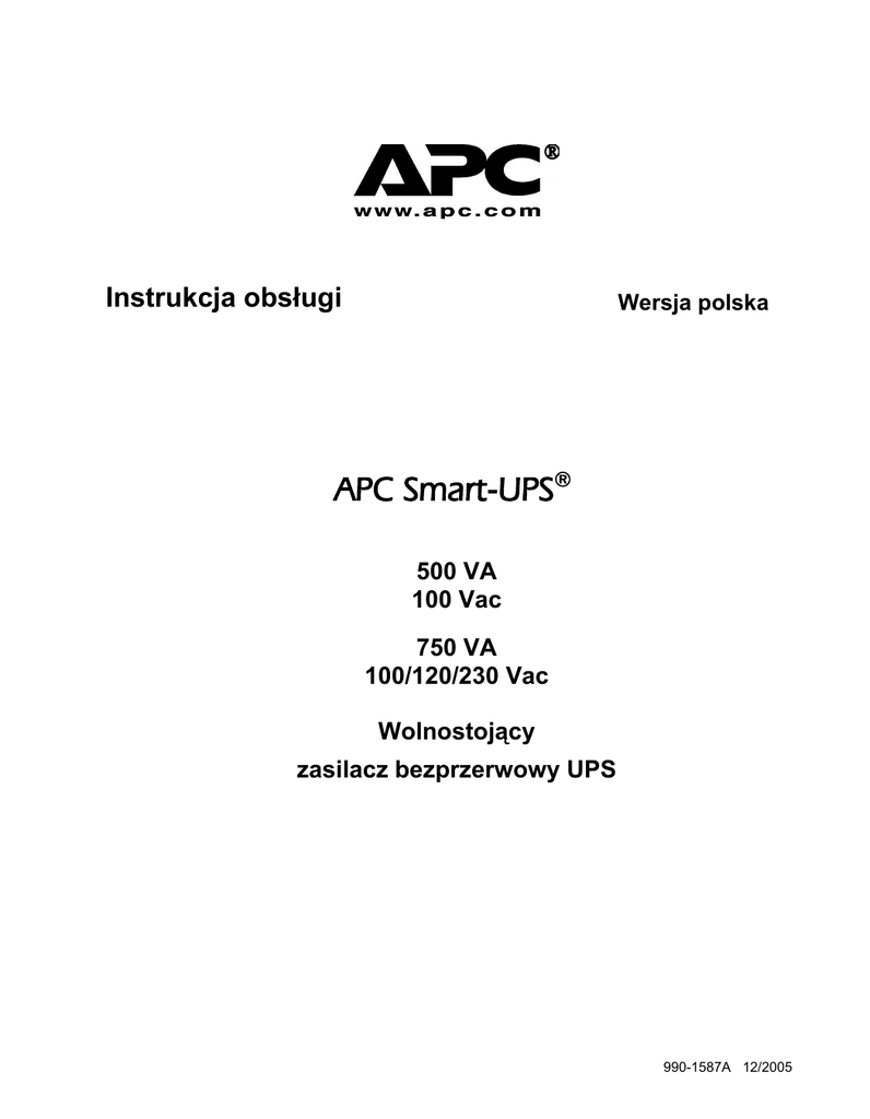 Instrukcja obsługi Wersja polska APC Smart-UPS® 500 VA 100 Vac 750 VA 100/120/230 Vac Wolnostojący zasilacz bezprzerwowy UPS 990-1587A 12/2005 Wstęp Awaryjny zasilacz bezprzerwowy (UPS) firmy APC zapewnia zabezpieczenie urządzeń przed zanikami, obniżeniami oraz skokami napięcia zasilającego. Zasilacz odfiltrowuje niewielkie wahania napięcia w sieci elektrycznej oraz separuje sprzęt od znaczniejszych zakłóceń, odłączając go w razie potrzeby od zasilania sieciowego. Zasilacz zapewnia nieprzerwane zasilanie z wbudowanego akumulatora do czasu, gdy przywrócone zostaną bezpieczne parametry dostawy prądu lub do całkowitego wyczerpania się akumulatora. 1: INSTALACJA Instrukcja obsługi oraz instrukcje dotyczące bezpieczeństwa znajdują się na dostarczonym wraz z zasilaczem dysku CD z Instrukcjami obsługi oraz na witrynie internetowej firmy APC pod adresem www.apc.com. Rozpakowanie zasilacza Uwaga: Przed instalacją urządzenia należy uważnie przeczytać instrukcje dotyczące bezpieczeństwa. Należy sprawdzić zasilacz przy odbiorze. W razie stwierdzenia uszkodzeń należy powiadomić przewoźnika oraz sprzedawcę. Opakowanie nadaje się do powtórnego wykorzystania (recyklingu); należy je zachować do ponownego użycia lub utylizować w sposób zgodny z przepisami. Należy sprawdzić zawartość opakowania, w którym powinny być: Uwaga: Zasilacz jest dostarczany z odłączonym akumulatorem. Zasilacz UPS Zestaw dokumentacji zasilacza UPS zawierający: Dokumentację produktu, informacje dotyczące gwarancji oraz bezpieczeństwa Dysk CD zawierający instrukcje obsługi zasilacza Smart-UPS® Modele 120 V i 230 V: Dysk z oprogramowaniem PowerChute® CD Modele 120 V i 230 V: Przewody komunikacji szeregowej oraz USB Model 230 V: Przewody z dwoma zworkami Ustawienie zasilacza UPS 1 cal (2,5 cm) 0-40°C 0-95% Podłączenie akumulatora Rozłącznik akumulatora umieszczone jest na panelu tylnym. Aby podłączyć akumulator, włóż wtyczkę rozłącznika do do opowiadającego jej gniazda. 1 Podłączenie urządzeń oraz zasilania do zasilacza UPS 1. Podłączenie urządzeń do zasilacza UPS. Uwaga: Drukarka laserowa pobiera znacznie więcej mocy niż inne urządzenia i może spowodować przeciążenie zasilacza. 2. Podłączanie akcesoriów do gniazda Smart-Slot (opcjonalnie). 3. Podłączenie przewodów uziemiających do zacisku TVSS (opcjonalnie). Aby wykonać połączenie, poluzuj śrubę zacisku i podłącz przewód uziemiający urządzenia przeciwprzepięciowego. Dokręć śrubę zabezpieczającą przewód. 4. Zasilacz UPS należy podłączać jedynie do dwubiegunowych, trójprzewodowych, uziemionych gniazd sieciowych. Należy unikać stosowania przedłużaczy. Modele 100 V / 120 V: Przewód zasilający jest na stałe podłączony do zasilacza. Wtyczka jest typu NEMA 5-15P. Model 230 V: Przewód zasilający jest dostarczany w pudełku z dokumentacją zasilacza. 5. umieszczony na panelu tylnym. Model 120 V: Sprawdź wskaźnik LED błędnego podłączenia Będzie się świecił, jeśli zasilacz został podłączony do niewłaściwie zainstalowanego gniazda sieciowego (zob. Rozwiązywanie problemów). 6. Włącz wszystkie podłączone urządzenia. Aby korzystać z zasilacza UPS jako głównego przełącznika zasilania, sprawdź, czy wszystkie podłączone urządzenia są włączone. 7. Naciśnij przycisk na przednim panelu, aby włączyć zasilanie. Uwaga: W czasie pierwszych 4 godzin normalnej pracy akumulator ładuje się do 90% swojej pojemności. Podczas tego początkowego okresu ładowania nie należy oczekiwać pełnego czasu zasilania z akumulatora. 8. Aby uzyskać optymalną ochronę systemu komputerowego, należy zainstalować oprogramowanie monitorujące PowerChute Smart-UPS. 2 Panele tylne 100 V / 120 V 230 V Standardowe złącza Port szeregowy Port USB Zacisk TVSS Należy stosować jedynie kable i akcesoria komunikacyjne zatwierdzone przez firmę APC. W celu wykonania połączenia z portem szeregowym należy użyć przewodu dołączonego do zestawu zasilacza. Standardowy przewód połączenia szeregowego nie jest zgodny z zasilaczem UPS. Porty szeregowy oraz USB nie mogą być używane jednocześnie. Zasilacz jest wyposażony w zacisk TVSS (transient voltage surge-suppression = ochrona przeciwprzepięciowa), która służy do uziemiania urządzeń zabezpieczających sprzęt telefoniczny oraz sieciowy. Przy podłączaniu przewodu uziemiającego należy odłączyć zasilacz UPS od źródła zasilania. 3 2: DZIAŁANIE URZĄDZENIA Panel wyświetlacza przedniego WSKAŹNIK OPIS Zasilanie z sieci Zasilacz dostarcza do podłączonych urządzeń energię z sieci zasilającej. Obniżanie napięcia (AVR) Zasilacz kompensuje wysokie napięcia zasilającego. Podwyższanie napięcia (AVR) Zasilacz kompensuje niskie napięcia zasilajacego. Zasilanie z akumulatora Zasilacz zasila podłączone urządzenia z akumulatora. Przeciążenie Pobór mocy przez podłączone obciążenia jest wyższy od mocy znamionowej zasilacza. Wymień akumulator/ Akumulator odłączony Akumulator jest odłączony lub wymaga wymiany. 4 FUNKCJA DZIAŁANIE Zasilanie włączone Naciśnięcie tego przycisku włącza zasilacz. (Informacje o dodatkowych funkcjach tego przycisku można znaleźć w dalszej części dokumentacji). Zasilanie wyłączone Naciśnięcie tego przycisku wyłącza zasilacz. Autotest Automatyczny: Standardowo zasilacz wykonuje automatycznie autotest po włączeniu, a następnie co dwa tygodnie. Podczas autotestu zasilacz przez krótki czas zasila podłączony sprzęt z akumulatora. Ręczny: Aby uruchomić autotest, należy nacisnąć i przytrzymać przez kilka sekund przycisk Zimny start . Dotyczy tylko modeli 120 V oraz 230 V: W przypadku zaniku napięcia w sieci zasilającej do zasilacza oraz podłączonych do niego urządzeń dostarczana jest energia z akumulatora (zob. Rozwiązywanie problemów). Naciśnij i przytrzymaj przez jedną sekudę, a następnie zwolnij go. Zasilacz wyda k