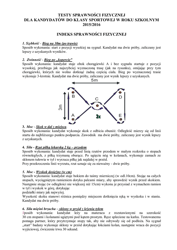TESTY SPRAWNOŚCI FIZYCZNEJ DLA KANDYDATÓW DO KLASY SPORTOWEJ W ROKU SZKOLNYM 2015/2016 INDEKS SPRAWNOŚCI FIZYCZNEJ 1. Szybkość - Bieg na 30m (po trawie) Sposób wykonania: start z pozycji wysokiej na sygnał. Kandydat ma dwie próby, zaliczany jest lepszy z uzyskanych wyników. 2. Zwinność - Bieg po „kopercie” Sposób wykonania: kandydat staje obok chorągiewki A i bez sygnału startuje z pozycji wysokiej, przebiega jak najszybciej wyznaczoną trasę (jak na rysunku), omijając przy tym chorągiewki, których nie wolno dotknąć żadną częścią ciała. Bieg po wyznaczonej trasie wykonuje 3-krotnie. Kandydat ma dwie próby, zaliczany jest wynik lepszy z uzyskanych. 5m C D 3m B A E 3. Moc - Skok w dal z miejsca. Sposób wykonania: kandydat wykonuje skok z odbicia obunóż. Odległość mierzy się od linii startu do najbliższego punktu podparcia. Zawodnik ma dwie próby, zaliczany jest wynik lepszy z uzyskanych. 4. Siła - Rzut piłką lekarską 2 kg – przodem Sposób wykonania: kandydat staje przed linią rzutów przodem w małym rozkroku o stopach równoległych, z piłką trzymaną oburącz. Po ugięciu nóg w kolanach, wykonuje zamach ze skłonem tułowia w tył i wyrzuca piłkę jak najdalej w przód. Przy przekroczeniu linii wyrzutu, rzut uznaje się za nieważny - dwie próby. 5. Moc - Wyskok dosiężny (w cm) Sposób wykonania: kandydat staje bokiem do taśmy mierniczej (w odl.10cm). Stojąc na całych stopach, wyciągniętym ramieniem dotyka palcami miary, aby sprawdzić wynik przed skokiem. Następnie stojąc (w odległości nie większej niż 15cm) wykonu je przysiad z wymachem ramion w tył i wyskok w górę, dotykając podziałki miary jak najwyżej. Wysokość skoku stanowi różnica pomiędzy miejscem dotknięcia ręką w wyskoku i w staniu. Kandydat ma dwie próby. 6. Siła mięśni brzucha – skłony w przód z leżenia tyłem Sposób wykonania: kandydat leży na materacu z rozstawionymi na szerokość 30 cm stopami i kolanami ugiętymi pod kątem prostym. Ręce splecione na karku. Testowanemu pomaga partner, który przytrzymuje stopy tak, aby nie odrywały się od podłoża. Na sygnał „start” badany wykonuje skłony w przód dotykając łokciami kolan, następnie wraca do pozycji wyjściowej, ćwiczenie trwa 30 sekund. 7. Zwinność - Bieg zwinnościowy (4x10m) Sposób wykonania: na sygnał „na miejsca” badany staje na linii startu. Na komendę „start” biegnie do drugiej linii (odległość 10 m), podnosi z niej klocek, po czym wraca na linię startu, gdzie kładzie klocek (klocek nie może być rzucony). Następnie biegnie po drugi klocek i wracając kładzie go ponownie na linii; Pomiar: próbę wykonuje się dwukrotnie. Liczy się lepszy czas mierzony z dokładnością do 1/10 sekundy. Próba zostaje zakończona z chwilą, gdy drugi klocek znajduje się na linii startu 8. Gibkość - Skłon tułowia w przód Sposób wykonania: badany staje na ławce gimnastycznej tak, aby palce stóp obejmowały jej krawędź, stopy zwarte, kolana wyprostowane. Następnie badany wykonuje skłon w przód, zaznaczając jak najniżej palcami rąk ślad na podziałce; Pomiar: próbę wykonuje się dwukrotnie, wynik lepszy odczytywany jest w cm; PUNKTACJA INDEKS SPRAWNOŚCI FIZYCZNEJ W każdej z konkurencji kandydat może uzyskać maksymalnie 5 punktów, a z całości testu 40. Szybkość – Bieg na 30m (po trawie) 4,95 i mniej – 5 pkt. 4,96 - 5,05 - 4 pkt. 5,06 - 5,15 - 3 pkt. 5,16 - 5,25 - 2 pkt. 5,26 - 5,35 - 1 pkt. 5,36 i poniżej - 0 pkt. Zwinność – Bieg po „kopercie” 22,5s i mniej – 5 pkt. 22,6s - 23,5s – 4 pkt. 23,6s - 24,5s - 3 pkt. 24,6s - 25,5s - 2 pkt. 25,6s - 26,5s - 1 pkt. 26,6s i mniej - 0 pkt. Moc - Skok w dal z miejsca powyżej 220cm – 5 pkt. 200cm - 219cm - 4 pkt. 180cm - 199cm - 3 pkt. 160cm - 179cm - 2 pkt. 140cm - 159cm - 1 pkt. poniżej 140cm - 0 pkt. Siła - Rzut piłką lekarską 2 kg – przodem 7m i więcej – 5 pkt. 6m - 7m - 4 pkt. 5m - 6m - 3 pkt. 4m – 5m - 2 pkt. 3m – 4m - 1 pkt. poniżej 3 m - 0 pkt. Moc - Wyskok dosiężny (w cm) powyżej 220cm – 5 pkt. 200cm - 219cm - 4 pkt. 180cm - 199cm - 3 pkt. 160cm - 179cm - 2 pkt. 140cm - 159cm - 1 pkt. poniżej 140cm - 0 pkt. Siła mięśni brzucha – skłony w przód z leżenia tyłem 30 i więcej – 5 pkt. 25 – 29 – 4 pkt. 23 - 28 – 3 pkt. 18 – 22 - 2 pkt. 15 – 17 – 1 pkt. Poniżej 15 – 0 pkt. Zwinność - Bieg zwinnościowy (4x10m) 10 s. i mniej – 5 pkt 11 – 14 s.- 4 pkt. 15 – 18 s. - 3 pkt. 19 – 22 s. - 2 pkt. 23 – 24 s. - 1 pkt. 25 s. i więcej - 0 pkt. Gibkość - Skłon tułowia w przód 18 cm i więcej – 5 pkt 12 – 17 cm – 4 pkt. 5 – 11 cm – 3 pkt. 0 – 4 cm – 2 pkt -5 do -1 cm – 1 pkt. -6 cm i mniej – 0 pkt