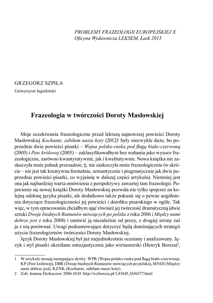 PROBLEMY FRAZEOLOGII EUROPEJSKIEJ X Oficyna Wydawnicza LEKSEM, Łask 2015 Grzegorz Szpila Uniwersytet Jagieloński Frazeologia w twórczości Doroty Masłowskiej Moje oczekiwania frazeologiczne przed lekturą najnowszej powieści Doroty Masłowskiej Kochanie, zabiłam nasze koty (2012)1 były niezwykle duże, bo poprzednie dwie powieści pisarki – Wojna polsko-ruska pod flagą biało-czerwoną (2003) i Paw królowej (2005) – zaklasyfikowałbym bez wahania jako wysoce frazeologiczne, zarówno kwantytatywnie, jak i kwalitatywnie. Nowa książka nie zaskoczyła mnie jednak przesadnie, tj. nie zaskoczyła mnie frazeologicznie (w skrócie – nie jest tak kreatywna formalnie, semantycznie i pragmatycznie jak dwie poprzednie powieści pisarki, co wyjaśnię w dalszej części artykułu). Niemniej jest ona jak najbardziej warta omówienia z perspektywy zawartej tam frazeologii. Pojawienie się nowej książki Doroty Masłowskiej pozwala nie tylko spojrzeć na kolejną odsłonę języka pisarki, ale dodatkowo także pokusić się o pewne uogólnienia dotyczące frazeologiczności jej powieści i dorobku pisarskiego w ogóle. Tak więc, w tym opracowaniu chciałbym ująć również jej twórczość dramatyczną (dwie sztuki Dwoje biednych Rumunów mówiących po polsku z roku 2006 i Między nami dobrze jest z roku 2008) i omówić ją niezależnie od prozy, z drugiej strony zaś ja z nią porównać. Uwagi podsumowujące dotyczyć będą dominujących strategii użycia frazeologizmów twórczości Doroty Masłowskiej. Język Doroty Masłowskiej był już niejednokrotnie oceniany i analizowany. Język i styl pisarki określano entuzjastycznie jako wirtuozerski (Henryk Bereza)2, 1 W artykule stosuję następujące skróty: WPR (Wojna polsko-ruska pod flagą biało-czerwoną), KP (Paw królowej), DBR (Dwoje biednych Rumunów mówiących po polsku), MNDJ (Między nami dobrze jest), KZNK (Kochanie, zabiłam nasze koty). 2 Zob. Joanna Derkaczew 2006.10.01 http://wyborcza.pl/1,81845,3656377.html 132 Grzegorz Szpila niespotykany gdzie indziej (Ruszkowski 2007: 19), nowatorski (Osadnik 2008: 165), oryginalny (Mroczek 2012: 32), i jako najdobitniejsze świadectwo jej kunsztu pisarskiego (Smyczyńska 2010: 61). Należy wymienić tutaj analizy, które odnoszą się w szczególności do frazeologii. Do użycia frazeologizmów przez pisarkę odnoszą się w swoich pracach m.in. A. Dyszak (2006), J. Miodek (2004), W. Moch (2004) oraz J. Ignatowicz-Skowrońska (2008). Wspomnieć warto uwagi na temat frazeologii w niepublikowanej pracy magisterskiej M. Teodorczyka pt. „Innowacje językowe w „Wojnie polsko-ruskiej pod flagą biało-czerwoną” oraz w artykule „Ład utracony w „Wojnie polsko-ruskiej” Doroty Masłowskiej, autorstwa M. Pilcha3. Piszący te słowa poświęcił frazeologii w powieściach pisarki dwie publikacje. Pisałem o paremiach w artykule „Przysłowia w powieściach Doroty Masłowskiej” (2007) oraz o formach i funkcjach frazeologizmów w WPR i PK (2010). W obu przypadkach zająłem się dość wyraźnie określonymi kategoriami frazeologicznymi, tj. odpowiednio przysłowiami oraz idiomami. Przykłady z tymi ostatnimi będą też stanowić materiał w niniejszej analizie. Dodam jedynie, że w dwóch dramatach Doroty Masłowskiej paremie nie występują w ogóle, a w ostatniej powieści pojawiają się jedynie dwa przysłowia, choć omówienie ich zakotwiczenia w tekście zasługuje chociażby na jeden akapit analizy frazeologicznej. W korpusie przysłów znajduje się poza tymi dwoma z KZNK 10 paremii (7 przysłów w Wojnie polsko-ruskiej pod flagą biało-czerwoną i 3 w Pawiu królowej). Tak więc, w porównaniu z dwoma wcześniejszymi powieściami ostatnia książka jest najmniej paremiczna. Frazeologicznej wirtuozerii trudno jednak odmówić dwóm aktualizacjom paremicznym, typu nieobserwowanemu wcześniej u pisarki. Tutaj ograniczę się jedynie do bardzo krótkiego ich przedstawienia. Oto cytat zawierający odniesienie do przysłowia angielskiego Don’t judge a book by its cover, You cannot tell a book by its cover (Pozory mylą). Niby mówi się, by nie sądzić książki po okładce, z drugiej strony dlaczego czasem wystarczy jedno na nią spojrzenie, no, może czasem trzeba dodać krótki rzut oka na stronę tytułową czy ISBN, ale wiecie już z całą pewnością, że nie chcecie mieć tej książki nawet na dnie piwnicy? Nawet na dnie CUDZEJ piwnicy? Nawet jako podstawki pod nogę półki? (KZNK 95) W innym miejscu tej samej powieści (KZNK 31) natrafiamy natomiast na aluzję do innej paremii angielskiej You cannot have your cake and eat it (brak paremicznego odpowiednika w polszczyźnie). Oto ten fragment: Organiczne posiłki, których opakowania przedstawiały soczyste piersi szczęśliwych kurczaków i barwne bukiety jarzyn bez azotanów, po odgrzaniu okazywały się parującą ilustracją do tego powiedzenia, że ktoś chce zjeść ciastko i mieć ciastko: wyglądały dokładnie, jakby ktoś je już zjadł i jakby mimo to ciągle leżały na talerzu, na domiar złego Farah wcale ich nie chciała. (KZNK 30-31) 3 Artykuł dostępny na stronie www.sknj.ifp.uni.wroc.pl/publikacje/b11.pdf. FRAZEOLOGIA W TWÓRCZOŚCI DOROTY MASŁOWSKIEJ133 Wspominam o tych użyciach, dlatego że przywołanie angielskich powiedzeń (już przecież nie tak dziwne w polszczyźnie, ale zabawnie wykorzystane prze pisarkę: metaforyczny komentarz i defrazeologizacja – tertium datur można by powiedzieć w drugim fragmencie powyżej) wpisuje się doskonale w strategię językową zastosowaną w tej właśnie książce, tj. kontaminację pojęciowo-językową, hybrydyzację językową, zapożyczania, kalkowanie, ilustrujące przenikanie się kulturowo-językowe. Z drugiej strony, takie użycie egzemplifikuje kolejny raz kuriozalny charakter językowych zachowań bohaterów powieści Doroty Masłowskiej. Dodatkowo, takie „skomentowane” cytacje obcych (angielskich) paremii może być sposo