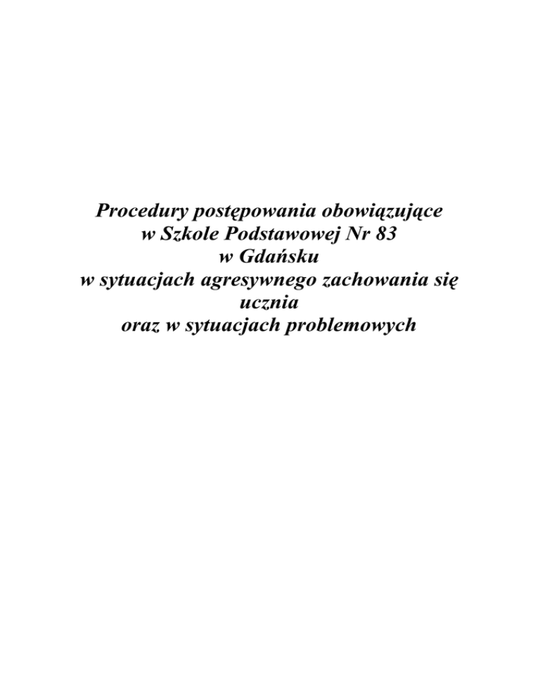 Procedury postępowania obowiązujące w Szkole Podstawowej Nr 83 w Gdańsku w sytuacjach agresywnego zachowania się ucznia oraz w sytuacjach problemowych SP 83 Procedury postępowania w sytuacjach agresywnego zachowania się ucznia oraz w sytuacjach problemowych __________________________________________________________________________ §1 Incydent Incydent – agresywne zachowanie ucznia na terenie szkoły (nie dotyczy zachowań skrajnych, zagrażających bezpieczeństwu). 1. Jeżeli osoba dorosła jest świadkiem takiego zdarzenia, następuje z jej strony natychmiastowa interwencja. Podaje komunikat, co uczeń ma zrobić w formie instrukcji: np. „uspokój się”, „przestań kopać”, „usiądź” itp. O każdym zauważonym incydencie (przez nauczyciela, pracownika obsługi, rodzica lub innych uczniów) należy zawsze niezwłocznie powiadomić wychowawcę klasy. 2. Wychowawca klasy przeprowadza rozmowę z uczniem, który uczestniczył a) b) c) d) e) f) w incydencie: bada sytuację; omawia zdarzenie; fakt ten odnotowuje w zeszycie klasowym; przypomina zasady i normy zachowania obowiązujące w szkole; zawiadamia rodziców (informacja telefoniczna lub pisemna); porusza temat zachowania uczniów w szkole na spotkaniu klasowym. 3. Jeżeli sytuacja powtarza się, to wychowawca powiadamia o sytuacji rodziców i pedagoga szkolnego i wówczas następuje: a) rozmowa uczeń + wychowawca + pedagog; b) wyjaśnienie sytuacji; c) omówienie problemu. Zawierany jest kontrakt z uczniem dotyczący poprawy zachowania ucznia oraz zapowiedzenie dalszych konsekwencji w sytuacji braku poprawy. (Załącznik nr 1) O całym tym zdarzeniu informowany jest przez wychowawcę klasy dyrektor szkoły. 4. Jeżeli zachowanie nadal nie ulega poprawie wychowawca podejmuje decyzję o dalszych konsekwencjach przewidzianych w statucie szkoły i wzywa do szkoły rodziców ucznia. Pedagog i wychowawca klasy przeprowadzają rozmowę z uczniem i rodzicami: a) przeprowadzają wywiad i poszukują przyczyn agresywnego zachowania ucznia (tylko z rodzicami); b) wypracowują metody poprawy zachowania (z uczniem i rodzicami); c) w przypadku braku poprawy informują o dalszych konsekwencjach (ucznia i rodzica). 5. Po dwóch tygodniach rodzice stawiają się ponownie w szkole w celu podsumowania efektów pracy: a) jeżeli jest poprawa w zachowaniu ucznia, wychowawca ustala z rodzicami systematyczny kontakt; 2 SP 83 Procedury postępowania w sytuacjach agresywnego zachowania się ucznia oraz w sytuacjach problemowych __________________________________________________________________________ b) jeżeli nadal nie ma poprawy w zachowaniu ucznia, wychowawca organizuje spotkanie: wychowawca klasy + dyrektor + pedagog + rodzice ucznia + uczeń. Przedstawia sytuację, dyrektor podejmuje decyzję o dalszych konsekwencjach. 6. Jeżeli nadal nie ma poprawy w zachowaniu ucznia, to szkoła realizuje działania zawarte w procedurze 5 b ponownie, dostosowując karę do wagi przewinienia ucznia. 7. Brak jakiejkolwiek poprawy w zachowaniu powoduje, że dyrektor szkoły informuje o tym fakcie Policję, Kuratora Oświaty i Wydział Edukacji. §2 Palenie/posiadanie papierosów 1. Osoba dorosła, uczeń: a) powiadamia nauczyciela 2. a) b) c) d) Nauczyciel: podejmuje interwencję powiadamia wychowawcę, pedagoga, dyrektora szkoły; wzywa rodziców do szkoły organizuje spotkanie: wychowawca + pedagog + rodzice + uczeń. Podczas tego spotkania: • rozmowa z uczniem, • wyjaśnienie sytuacji, • omówienie problemu, • podjęcie decyzji o konsekwencjach przewidzianych w statucie szkoły. e) jeżeli uczeń ponownie sięga po papierosy uruchomiona zostaje procedura b, c, d jednak w spotkaniu uczestniczy dodatkowo dyrektor szkoły; f) przy nasilającym się paleniu papierosów przez ucznia, dyrektor powiadamia o problemie Kuratorium Oświaty i Wydział Edukacji. §3 Brak reakcji na prośby nauczyciela podczas zajęć lekcyjnych 1. Jeżeli uczeń przeszkadza w prowadzeniu lekcji (rozmawia, chodzi po klasie, rzuca „liścikami”, nie respektuje poleceń nauczyciela, manifestuje gestami niezadowolenie, prowokuje innych uczniów itp. Nauczyciel podaje komunikat ustny w formie np.: „nie rozmawiaj”, „pracuj”, „usiądź” itp. 2. Jeżeli uczeń nie reaguje: a) nauczyciel uczący prosi ucznia o pozostanie po lekcji na rozmowę, przeprowadza rozmowę, wpisuje uwagę, powiadamia wychowawcę; b) wychowawca zwraca się do gospodarza, a w przypadku jego nieobecności do wybranego ucznia, by poprosił do klasy pedagoga lub dyrekcję. W zależności od rozmowy: powiadamia bądź wzywa rodziców. 3 SP 83 Procedury postępowania w sytuacjach agresywnego zachowania się ucznia oraz w sytuacjach problemowych __________________________________________________________________________ 3. Jeżeli sytuacja powtarza się, wychowawca zawiadamia o sytuacji rodziców i włącza się pedagog szkolny. Następuje: a) rozmowa z uczniem; b) wyjaśnienie sytuacji; c) omówienie problemu. Zawierany jest kontrakt z uczniem (w obecności wychowawcy klasy) dotyczący poprawy zachowania ucznia oraz zapowiedzenie dalszych konsekwencji w sytuacji braku poprawy. O całym tym zdarzeniu informowany jest, przez wychowawcę klasy, dyrektor szkoły. 4. Jeżeli zachowanie nadal nie ulega poprawie, wychowawca podejmuje decyzję o dalszych konsekwencjach przewidzianych w statucie szkoły i wzywa do szkoły rodziców ucznia. Pedagog i wychowawca klasy przeprowadzają rozmowę z rodzicami: a) przeprowadzają wywiad i szukają przyczyn agresywnego zachowania ucznia; b) wypracowują metody poprawy zachowania; c) informują ucznia i rodzica o dalszych konsekwencjach w przypadku braku poprawy. Po dwóch tygodniach rodzice stawiają się ponownie w szkole w celu podsumowania efektów pracy. 5. Jeżeli jest poprawa w zachowaniu ucznia, wychowawca ustala z rodzicami systematyczny kontakt. 6. Jeżeli nadal nie ma poprawy w zachowaniu ucznia, wychowawca organizuje spotkanie: wychowawca klasy + dy