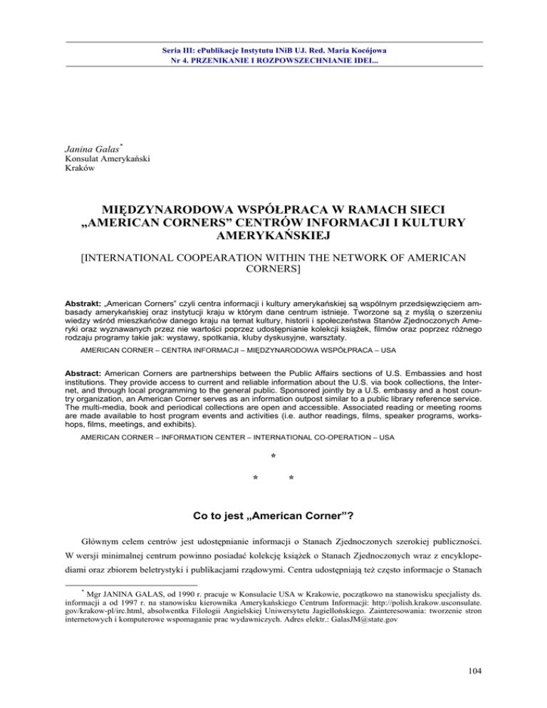 Seria III: ePublikacje Instytutu INiB UJ. Red. Maria Kocójowa Nr 4. PRZENIKANIE I ROZPOWSZECHNIANIE IDEI... Janina Galas* Konsulat Amerykański Kraków MIĘDZYNARODOWA WSPÓŁPRACA W RAMACH SIECI „AMERICAN CORNERS” CENTRÓW INFORMACJI I KULTURY AMERYKAŃSKIEJ [INTERNATIONAL COOPEARATION WITHIN THE NETWORK OF AMERICAN CORNERS] Abstrakt: „American Corners” czyli centra informacji i kultury amerykańskiej są wspólnym przedsięwzięciem ambasady amerykańskiej oraz instytucji kraju w którym dane centrum istnieje. Tworzone są z myślą o szerzeniu wiedzy wśród mieszkańców danego kraju na temat kultury, historii i społeczeństwa Stanów Zjednoczonych Ameryki oraz wyznawanych przez nie wartości poprzez udostępnianie kolekcji książek, filmów oraz poprzez różnego rodzaju programy takie jak: wystawy, spotkania, kluby dyskusyjne, warsztaty. AMERICAN CORNER – CENTRA INFORMACJI – MIĘDZYNARODOWA WSPÓŁPRACA – USA Abstract: American Corners are partnerships between the Public Affairs sections of U.S. Embassies and host institutions. They provide access to current and reliable information about the U.S. via book collections, the Internet, and through local programming to the general public. Sponsored jointly by a U.S. embassy and a host country organization, an American Corner serves as an information outpost similar to a public library reference service. The multi-media, book and periodical collections are open and accessible. Associated reading or meeting rooms are made available to host program events and activities (i.e. author readings, films, speaker programs, workshops, films, meetings, and exhibits). AMERICAN CORNER – INFORMATION CENTER – INTERNATIONAL CO-OPERATION – USA * * * Co to jest „American Corner”? Głównym celem centrów jest udostępnianie informacji o Stanach Zjednoczonych szerokiej publiczności. W wersji minimalnej centrum powinno posiadać kolekcję książek o Stanach Zjednoczonych wraz z encyklopediami oraz zbiorem beletrystyki i publikacjami rządowymi. Centra udostępniają też często informacje o Stanach * Mgr JANINA GALAS, od 1990 r. pracuje w Konsulacie USA w Krakowie, początkowo na stanowisku specjalisty ds. informacji a od 1997 r. na stanowisku kierownika Amerykańskiego Centrum Informacji: http://polish.krakow.usconsulate. gov/krakow-pl/irc.html, absolwentka Filologii Angielskiej Uniwersytetu Jagiellońskiego. Zainteresowania: tworzenie stron internetowych i komputerowe wspomaganie prac wydawniczych. Adres elektr.: [email protected] 104 Seria III: ePublikacje Instytutu INiB UJ. Red. Maria Kocójowa Nr 4. PRZENIKANIE I ROZPOWSZECHNIANIE IDEI... Zjednoczonych poprzez dostęp do internetowych baz danych, nagrania audio i wideo. Organizują spotkania z Amerykanami, wystawy sztuki amerykańskiej, prowadzą kluby filmowe oraz dyskusyjne. Pracownicy centrów należą do personelu instytucji partnerskiej, warunkiem podstawowym jest ich znajomość języka angielskiego oraz umiejętność organizacji różnorodnych wydarzeń kulturalnych. Dostęp do materiałów w centrum jest otwarty i bezpłatny [http://pl.wikipedia.org/wiki/American_Corner]. Pierwsze centra zostały otwarte z inspiracji amerykańskiej ambasady w Moskwie z zamiarem dotarcia do osób mieszkających poza stolicą. Centra otwierane są we współpracy z różnego rodzaju organizacjami lokalnymi, głównie są to biblioteki publiczne, ale nie tylko. Obecnie działają 302 takie instytucje na całym świecie, z czego 119 mieści się w Europie [http://www.amcorners.ru//site.php?ID=301&lang=eng]. Dużo nowych placówek otwiera się teraz w Afryce oraz Ameryce Południowej, a liczba ich wzrasta niemal w każdym miesiącu. Każde centrum, jest trochę inne i wpływa na to wiele czynników takich jak: kraj, w którym dane centrum działa, instytucja, z którą jest związane, może być to biblioteka publiczna, biblioteka uniwersytecka, centrum biznesu, instytucja pozarządowa. Centra mogą też świadomie kształtować swoją kolekcję i działalność kierując ją głównie do określonej grupy na przykład: dzieci w wieku 5–14 lat lub studentów. Bez względu jednak na tę różnorodność wszystkie centra współpracują ze sobą poprzez wspólną stronę internetową, listy dyskusyjne oraz konferencje. Współpraca ta może obejmować całą sieć centrów, być na poziomie regionalnym lub ograniczać się do jednego państwa. Różne poziomy współpracy kształtują też jej różny rodzaj np. na poziomie globalnym centra dzielą się poprzez listę dyskusyjną informacjami o swojej działalności i konkretnych programach, które mogą stać się inspiracją dla pozostałych centrów. Jest to również forum, poprzez które prowadzone są dyskusje o wspólnych problemach lub sposobach ich rozwiązania. Omawiane są różne oprogramowania przydatne w centrach. Współpraca oraz wymiana informacji dokonuje się także poprzez różne portale. Dwa z nich są przeznaczone dla globalnej sieci centrów, istnieją również strony lub portale stworzone specjalnie dla danego regionu lub kraju np. polska Wiki. Jeden z dwóch globalnych portali przeznaczony jest na raporty z działalności centrów oraz informacje przydatne przy tworzeniu nowych centrów takie jak: przykładowe umowy współpracy, przykłady miesięcznych raportów, przykładowy budżet, listy warunków, jakie trzeba spełnić otwierając nowe centrum oraz porady, na co zwrócić szczególną uwagę. Ze względu na różną specyfikę centrów, są to bardziej wskazówki, niż konkretne wymagania, ponieważ trudno porównać centra, które znajdują się na różnych kontynentach i których publiczność, różni się często kulturą, religią, dostępem do Internetu lub jego brakiem. Na drugim portalu znajdują się informacje oraz linki do poszczególnych centrów, propozycje specjalistycznych zbiorów z podziałem na tematy i grupy wiekowe, raporty ze szkoleń oraz prezentacje, jakie na nich były przeds