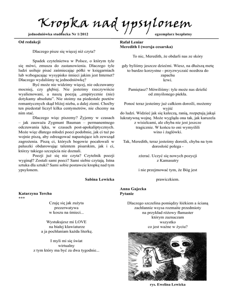 Kropka nad ypsylonem jednodniówka studencka Nr 1/2012 Od redakcji Dlaczego pisze się więcej niż czyta? Spadek czytelnictwa w Polsce, o którym tyle się mówi, zmusza do zastanowienia. Dlaczego tyle ludzi usiłuje pisać zaśmiecając półki w księgarniach lub wzbogacając wysypisko śmieci jakim jest Internet? Dlaczego wydaliśmy tę jednodniówkę? Być może nie widzimy więcej, nie odczuwamy mocniej, czy głębiej. Nie jesteśmy rzeczywiście wyalienowani, a naszą poezją „empirycznie (nie) dotykamy absolutu”. Nie stoimy na piedestale poetów romantycznych skąd bliżej nieba, a dalej ziemi. Choćby ten piedestał liczył kilka centymetrów, nie chcemy na nim stać. Dlaczego więc piszemy? Żyjemy w czasach – jak zauważa Zygmunt Bauman – permanentnego odczuwania lęku, w czasach post-apokaliptycznych. Może więc dlatego młodzi poeci podobnie, jak ci tuż po wojnie piszą, aby odreagować napastujące ich zewsząd zagrożenia. Piszą ci, których bogowie pocałowali w paluszki obdarowując talentem pisarskim, jak i ci, którzy takiego szczęścia nie doznali. Poezji już się nie czyta? Czytelnik poezji wyginął? Zostali sami poeci? Sami siebie czytają. Istna sztuka dla sztuki? Sami sobie postawcie kropkę nad tym ypsylonem. Rafał Leniar Meredith I (wersja cesarska) To nic, Meredith, że obdarli nas ze skóry gdy byliśmy jeszcze dziećmi. Wiesz, na dłuższą metę to bardzo korzystne - przyzwyczaić nozdrza do zapachu krwi. Pamiętasz? Mówiliśmy: tyle może nas dzielić od zmyślonego piekła. Ponoć teraz jesteśmy już całkiem dorośli, możemy wyjść do ludzi. Widzieć jak się kaleczą, ranią, rozpętują jakąś lukratywną wojnę. Może wygląda ona tak, jak karuzela z wisielcami, ale chyba nie jest jeszcze tragicznie. W końcu to oni wymyślili wino i żaglówki. Tak, Meredith, teraz jesteśmy dorośli, chyba na tym dorosłość polega zżerać. Uczyć się nowych pozycji z Kamasutry i nie przejmować tym, że Bóg jest Sabina Lewicka Katarzyna Tercha *** Czuję się jak zużyta prezerwatywa w koszu na śmieci... Wystukujesz mi LOVE na białej klawiaturze a ja pochłaniam każda literkę. egzemplarz bezpłatny prawiczkiem. Anna Gajecka Pytanie Dlaczego szczelina pomiędzy łóżkiem a ścianą zachłannie wsysa rozmaite przedmioty na przykład różowy flamaster którym zaznaczam wszystko co jest ważne w życiu? I myli mi się świat wirtualny z tym który ma być za dwa tygodnie... rys. Ewelina Lewicka Paweł Szczyrek List do przyjaciela Drogi przyjacielu Znasz te chwile, kiedy tęsknota przeplata się ze słonecznymi promieniami uderzając o rozgrzaną do czerwoności głowę, przynosząc najbardziej zwariowane marzenia? Gdy pragniemy uciec tam, gdzie nikt jeszcze nie był, a powietrze ma wspaniały, cierpki smak bliskiej osoby. Świat przyjacielu jest wtedy, gdy sny mają lepki zapach jej rudych włosów, gorące dni toczą się ze wschodu na zachód, a duszne noce przywołują tysiące kolorowych wspomnień nie pozwalając na spokojny sen. Kiedy chcesz otworzyć oczy wiedząc, że tam poza ciężką granicą powiek tłoczą się słodkie światła marzeń, wiruje ziemia, toczy się ruch międzyplanetarny. Lubię te ciepłe, letnie wieczory, gdy niebo jednoczy się z ziemią, a gwiazdy szepcą wesołe pół-słówka rozpuszczając swój warkocz. Wtedy wszystko jest prawdziwe. Powieki wędrują ku górze, źrenice niebezpiecznie się rozszerzają, przestrzeń jest głupstwem, a Ty wiesz, że wszystko na co czekałeś jest tutaj. Że nie musisz już szukać, biegać, ścierać stóp o twardą rzeczywistość. Wiesz, że wszystko jest tutaj i jest w mocy zrozumienia dziecka. Na tym polega świętość. Na zrozumieniu, że wszystko jest bezwzględnie proste. Pamiętam nasze ostatnie spotkanie. Leżeliśmy na łące. Na nieznanym nam kawałku wszechświata, otoczeni wielką przestrzenią, uwikłani w ruch gwiazd, fizykę, otoczeni Wszechmocą i Wszechbyciem. Gwiżdżący na czas. Zlewał się na nas jak błogosławieństwo tajemniczy blask gwiazd - strażników czasu. Otaczał nasze ciała, przenikał jego pory, po czym delikatnie łaskocząc spływał po tułowiu na rozgrzaną ziemię, chłonącą go każdą szczeliną. Okolice parowały, oddawały tchnienia białej skroplonej wody, wydawały się unosić w powietrzu i nieruchomo wzywać imienia chmur, które bezwładnie płynęły, głuche na nawoływania. Świat rozmył się, rozszczepił na drobnych kroplach życiodajnej wody, kolory zamazały i tkwiły nieruchomo, jakby znalazły odwiecznie przeznaczone im miejsce. Cisze mąciły jedynie wieczorne rozmowy i szepty koników polnych, składających przysięgę wierności wobec świata. Był to ten fragment ziemi, to miejsce, gdzie czas nie istniał, uciekł przestraszony stężeniem Absolutu. Nie liczyły się minuty, sekundy, godziny. Było to miejsce oderwane od świata, jakby dusza wszędobylskiej materii. Czułem lekki wiatr na skroniach i czułem, że zbliża się coś arcyważnego, potężnego i równie podniecającego jak pierwszy wybity ząb. Wtedy zapytałeś mnie kim jestem, nie odpowiedziałem. Jeśli pytasz w jaki sposób zarabiam na życie to jestem stolarzem. Ale jeżeli chodzi Ci o to, o czym myślę podczas nieprzespanych nocy, co nieustannie gonie, co targa mną ze wschodu na zachód po tym dziewiczym kraju, to jest to Poezja. Jestem 2 poetą. Wiele czasu zajmowało mi poszukiwanie piękna. Widziałem zadziwiające i zapierające dech w piersiach obrazy, ale nie znajdowałem w nich ukojenia. Dopiero gdy zamknąłem oczy na to co ludzkie i zacząłem patrzeć sercem jakby z mgły wyłonił mi się jego obraz. Początkowo nieostry z każdym następnym spotkaniem i wymienionym gestem stawał się coraz bardziej wyrazisty. Teraz już wiem, poszukiwanie piękna, polega na oślepnięciu dla tego świata i odwadze nazwania wszystkiego na nowo. Miłość to odwaga nazwania świata na nowo, jej imieniem. Katarzyna Pietryszko Oskórowani ły