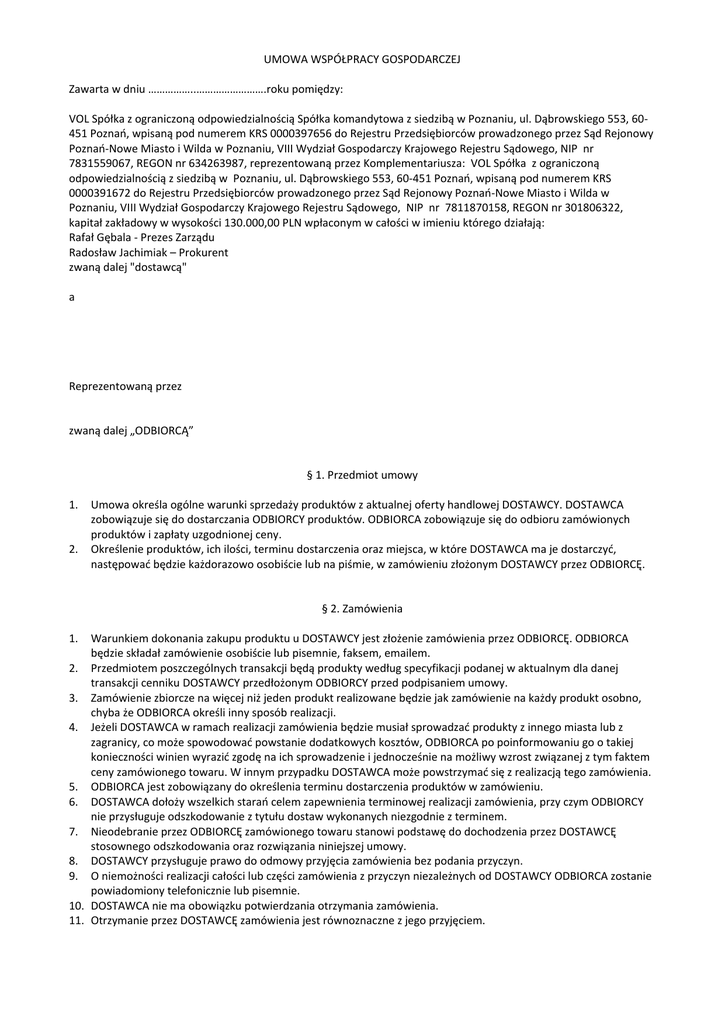 UMOWA WSPÓŁPRACY GOSPODARCZEJ Zawarta w dniu ……………..…………………….roku pomiędzy: VOL Spółka z ograniczoną odpowiedzialnością Spółka komandytowa z siedzibą w Poznaniu, ul. Dąbrowskiego 553, 60451 Poznań, wpisaną pod numerem KRS 0000397656 do Rejestru Przedsiębiorców prowadzonego przez Sąd Rejonowy Poznań-Nowe Miasto i Wilda w Poznaniu, VIII Wydział Gospodarczy Krajowego Rejestru Sądowego, NIP nr 7831559067, REGON nr 634263987, reprezentowaną przez Komplementariusza: VOL Spółka z ograniczoną odpowiedzialnością z siedzibą w Poznaniu, ul. Dąbrowskiego 553, 60-451 Poznań, wpisaną pod numerem KRS 0000391672 do Rejestru Przedsiębiorców prowadzonego przez Sąd Rejonowy Poznań-Nowe Miasto i Wilda w Poznaniu, VIII Wydział Gospodarczy Krajowego Rejestru Sądowego, NIP nr 7811870158, REGON nr 301806322, kapitał zakładowy w wysokości 130.000,00 PLN wpłaconym w całości w imieniu którego działają: Rafał Gębala - Prezes Zarządu Radosław Jachimiak – Prokurent zwaną dalej "dostawcą" a Reprezentowaną przez zwaną dalej „ODBIORCĄ” § 1. Przedmiot umowy 1. 2. Umowa określa ogólne warunki sprzedaży produktów z aktualnej oferty handlowej DOSTAWCY. DOSTAWCA zobowiązuje się do dostarczania ODBIORCY produktów. ODBIORCA zobowiązuje się do odbioru zamówionych produktów i zapłaty uzgodnionej ceny. Określenie produktów, ich ilości, terminu dostarczenia oraz miejsca, w które DOSTAWCA ma je dostarczyć, następować będzie każdorazowo osobiście lub na piśmie, w zamówieniu złożonym DOSTAWCY przez ODBIORCĘ. § 2. Zamówienia 1. Warunkiem dokonania zakupu produktu u DOSTAWCY jest złożenie zamówienia przez ODBIORCĘ. ODBIORCA będzie składał zamówienie osobiście lub pisemnie, faksem, emailem. 2. Przedmiotem poszczególnych transakcji będą produkty według specyfikacji podanej w aktualnym dla danej transakcji cenniku DOSTAWCY przedłożonym ODBIORCY przed podpisaniem umowy. 3. Zamówienie zbiorcze na więcej niż jeden produkt realizowane będzie jak zamówienie na każdy produkt osobno, chyba że ODBIORCA określi inny sposób realizacji. 4. Jeżeli DOSTAWCA w ramach realizacji zamówienia będzie musiał sprowadzać produkty z innego miasta lub z zagranicy, co może spowodować powstanie dodatkowych kosztów, ODBIORCA po poinformowaniu go o takiej konieczności winien wyrazić zgodę na ich sprowadzenie i jednocześnie na możliwy wzrost związanej z tym faktem ceny zamówionego towaru. W innym przypadku DOSTAWCA może powstrzymać się z realizacją tego zamówienia. 5. ODBIORCA jest zobowiązany do określenia terminu dostarczenia produktów w zamówieniu. 6. DOSTAWCA dołoży wszelkich starań celem zapewnienia terminowej realizacji zamówienia, przy czym ODBIORCY nie przysługuje odszkodowanie z tytułu dostaw wykonanych niezgodnie z terminem. 7. Nieodebranie przez ODBIORCĘ zamówionego towaru stanowi podstawę do dochodzenia przez DOSTAWCĘ stosownego odszkodowania oraz rozwiązania niniejszej umowy. 8. DOSTAWCY przysługuje prawo do odmowy przyjęcia zamówienia bez podania przyczyn. 9. O niemożności realizacji całości lub części zamówienia z przyczyn niezależnych od DOSTAWCY ODBIORCA zostanie powiadomiony telefonicznie lub pisemnie. 10. DOSTAWCA nie ma obowiązku potwierdzania otrzymania zamówienia. 11. Otrzymanie przez DOSTAWCĘ zamówienia jest równoznaczne z jego przyjęciem. § 3. Ceny 1. 2. 3. Cena produktu ustalana jest ceną umowną. Ceny mogą być zmienione na podstawie dwustronnych uzgodnień miedzy DOSTAWCĄ a ODBIORCĄ. Do cen jest doliczany podatek VAT zgodnie z obowiązującymi przepisami. § 4. Płatności 1. 2. 3. Jeżeli nie uzgodniono inaczej, płatność następuje przed odbiorem lub wysyłką zamówionego towaru, a w przypadku płatności przelewem towar może być odebrany lub wysłany wyłącznie po potwierdzeniu wpłaty na rachunek DOSTAWCY. Przez datę zapłaty dokonywanej w drodze przelewu bankowego Strony rozumieją uznanie rachunku bankowego DOSTAWCY. ODBIORCA zobowiązany jest do zapłaty ustawowych odsetek w przypadku opóźnień w zapłacie ceny. Jakakolwiek zmiana warunków płatności regulowana jest odrębną umową. § 5. Dostawa i zwroty 1. 2. 3. Sposób odbioru produktów (loco magazyn dostawcy; wysyłka przez dostawcę) określa ODBIORCA w zamówieniu. DOSTAWCA dostarcza towar za pośrednictwem firm spedycyjnych, kurierskich lub własnym transportem. Dostawa zostaje zrealizowana, gdy DOSTAWCA dostarczy produkty pod adres wskazany w zamówieniu. Własność oraz ryzyko przypadkowej utraty lub uszkodzenia produktów przechodzi na ODBIORCĘ z chwilą zrealizowania dostawy. 4. Uznaje się, że ODBIORCA odebrał produkty w chwili ich dostarczenia przez DOSTAWCĘ pod wskazany adres przez ODBIORCĘ. 5. Potwierdzeniem odbioru jest pokwitowanie na fakturze upoważnionego przedstawiciela ODBIORCY (loco magazyn) bądź dowód dostarczenia towaru przez DOSTAWCĘ przewoźnikowi. 6. W przypadku, gdy dostarczony do ODBIORCY towar nie odpowiada specyfikacji zamówienia, bądź zamówienie nie zostało w ogóle złożone lub złożone przez osobę nieuprawnioną, wówczas ODBIORCA jest zobowiązany odesłać towar do DOSTAWCY nie później niż w następnym dniu roboczym. 7. Odbiór towaru z magazynu DOSTAWCY wymaga posiadania przez osobę odbierającą towar ważnego, imiennego upoważnienia podpisanego przez osobę upoważnioną do działania w imieniu ODBIORCY. ODBIORCA ponosi odpowiedzialność za osobę, która legitymuje się wystawionym przez niego upoważnieniem do czasu otrzymania pisemnego odwołania przez DOSTAWCĘ tego upoważnienia. 8. ODBIORCA lub osoba przez niego upoważniona ponosi pełną odpowiedzialność za sprawdzenie zgodności dostawy z dołączoną fakturą i zamówieniem w momencie odbioru produktów. 9. Warunkiem dochodzenia ewentualnych roszczeń z tytułu braków, uszkodzenia przesyłki oraz niezgodności faktury z zamówieniem jest sporządzenie 