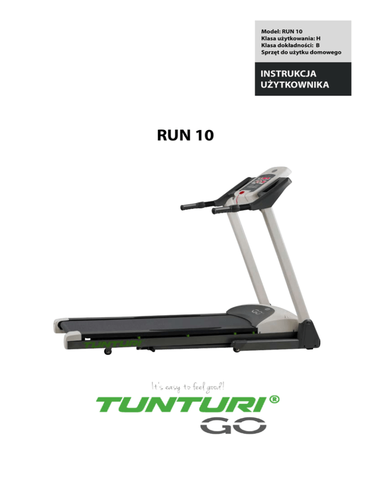 Model: RUN 10 Klasa użytkowania: H Klasa dokładności: B Sprzęt do użytku domowego INSTRUKCJA UŻYTKOWNIKA RUN 10 SPIS TREŚCI MONTAŻ .................................................................................. 3 KONSOLA ................................................................................ 4 PODSTAWY ĆWICZEŃ ......................................................... 5 OBSŁUGA I PROGRAMY ...................................................... 6 KONSERWACJA ...................................................................... 6 PRZESTAWIANIE I PRZECHOWYWANIE ......................... 8 DANE TECHNICZNE .............................................................. 8 WAŻNE WSKAZÓWKI BEZPIECZEŃSTWA Instrukcja obsługi stanowi ważny element sprzętu treningowego: przed rozpoczęciem użytkowania sprzętu prosimy dokładnie ją przeczytać. Prosimy zawsze postępować zgodnie z niniejszymi wskazówkami: OSTRZEŻENIE Nie używaj przedłużacza pomiędzy bieżnią a gniazdkiem elektrycznym znajdującym się w ścianie. Maksymalne natężenie prądu dla urządzenia wynosi 10 A. Prąd wyjściowy w gniazdku z natężeniem większym o 10% może być przyczyną nieprawidłowego funkcjonowania bieżni lub przyczynić się do uszkodzenia jej elektroniki. Używając innego natężenia mocy niż to, które jest określone w niniejszej instrukcji ostatecznie doprowadzi do unieważnienia gwarancji oraz roszczeń z tytułu rękojmi. OSTRZEŻENIE O ZAPOBIEGANIU ZAGROŻENIOM • Trzymaj ręce z daleka od jakichkolwiek ruchomych części. Nie umieszczaj rąk, stóp lub innych przedmiotów na lub pod bieżnią. INSTRUKCJA UŻYTKOWNIKA - RUN 10 • Nie pozostawiaj bieżni bez nadzoru kiedy jest włączona. Usuń z gniazdka przewód elektryczny kiedy bieżnia nie jest używana a także przed rozłożeniem lub złożeniem bieżni. Aby odłączyć bieżnię od zasilania, najpierw wyłącz ją wyłącznikiem a następnie usuń wtyczkę z gniazdka. • Wymagany jest szczególny nadzór przez osoby dorosłe podczas użytkowania bieżni przez dzieci, inwalidów lub osoby niepełnosprawne. • Użytkuj bieżnię tylko w przeznaczonym dla niej celu, opisanym w instrukcji obsługi. Nie używaj przyborów i części nie rekomendowanych przez TUNTURI. • Przed rozpoczęciem użytkowania bieżni upewnij się czy funkcjonuje ona prawidłowo. Nie używaj wadliwego sprzętu. • Trzymaj przewód z daleka od gorących powierzchni. • Bieżnia RUN 10 nie może być użytkowana na zewnątrz. Bieżnia powinna być przechowywana w zakresie temperatur od +10C do +35C. Wilgotność powietrza nie może przekraczać 90%. • Nie wykonuj obsługi lub konserwacji innej niż tej opisanej w instrukcji obsługi. Podane instrukcje muszą być przestrzegane. • Nigdy nie używaj bieżni jeśli przewód zasilający, gniazdo elektryczne lub urządzenie jest uszkodzone, wilgotne lub zmoczone przez wodę. Zwrócić bieżnię do serwisu w celu dokonania naprawy. • Nie używaj urządzenia na zewnątrz pomieszczeń. Utrzymuj pomieszczenie w czystości. Zwróć szczególną uwagę na okruchy, włosy itp., które mogą przedostać się do wnętrza bieżni. • Nie użytkuj urządzenia w pomieszczeniu gdzie była rozpylana substancja w aerozolu lub jeśli to pomieszczenie nie jest wentylowane. • Sprzęt nie jest przeznaczony dla osób o wadze powyżej 135 kg (298 Ibs). • Sprzęt został zaprojektowany do użytku domowego. Gwarancja TUNTURI ma zastosowanie tylko przy usterkach i awariach powstałych podczas użytku domowego. Dalsze informacje na temat okresów gwarancji można otrzymać od krajowego dystrybutora TUNTURI. Prosimy zwrócić uwagę, że okresy gwarancji obowiązujące w poszczególnych krajach mogą się różnić od siebie. PROSIMY ZACHOWAĆ INSTRUKCJĘ OBSŁUGI dami (D) w górnych otworach ramion kolumny. Do zmontowania sprzętu potrzebne będą dwie dorosłe osoby. Nie wyjmuj bieżni z opakowania; możesz wykorzystać materiał z opakowania do przykrycia podłogi podczas montażu. Przed zmontowaniem sprzętu należy upewnij się, czy są wszystkie części: 1. Rama 2. Przewód zasilający 3. Narzędzia do montażu (oznakowane są * na liście części zapasowych)- zatrzymaj dołączone narzędzia montażowe, ponieważ mogą one być potrzebne np. do regulacji sprzętu. W przypadku problemów prosimy o kontakt ze sprzedawcą PLIANT. Kierunki w lewo, prawo, z przodu, z tyłu zostały zdefiniowane jako widziane z pozycji ćwiczącego. Aby uniknąć uszkodzeń usuń materiały ochraniające bieżnię przed jej wyjęciem z pudła. Rozłóż części bieżni wraz z wyposażeniem tak, aby były one ułożone zgodnie z poniższą listą: Części Opis Ilość A Rama główna i konsola 1 B Osłona boczna 2 C Śruba 6 D Podkładka 4 E Podkładka 2 F Śruba 6 G Klucz imbusowy 1 H Wkrętak 1 I Klucz bezpieczeństwa 1 Podnieś kolumnę wspornika konsoli do góry a następnie umieść śruby (C) i podkładki (D,E) w dolnych otworach ramion kolumny. Dobrze je dokręć. Przymocuj osłony boczne (B) śrubami (F) z przodu bieżni i dobrze dokręć. PRZEWODY ELEKTRYCZNE I UZIEMIENIE INSTRUKCJE Podłącz końcówkę przewodu zasilania do gniazda bieżni znajdującego się w lewym przednim rogu. Przed podłączeniem sprzętu do zasilania upewnij się, że lokalne napięcie odpowiada rodzajowi wtyczki: bieżnia działa pod napięciem 110 V lub 230 V. Bieżnia musi być uziemiona. Jeśli gniazdko elektryczne będzie wadliwe lub uszkodzone, uziemienie nie zabezpieczy Cię przed ryzykiem porażenia prądem. Produkt jest wyposażony w przewód z żyłą ochronną i uziemioną wtyczkę. Wtyczka musi być podłączona do gniazda elektrycznego, które jest prawidłowo zainstalowane i uziemione zgodnie z lokalnymi przepisami. Nie używaj przedłużacza. Wspornik konsoli umieść na ramionach kolumny w prawidłowej pozycji. Dokręć śruby (C) wraz z podkła- ZAGROŻENIE! Niewłaściwe podłączenie przewodu z żyłą ochronną moż