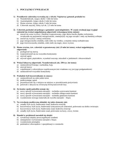 1. POCZĄTKI CYWILIZACJI 1) Przodkowie człowieka wywodzą się z Afryki. Najstarszy gatunek praludzi to: a) Neandertalczyk, żyjący około 1 mln lat temu b) Australopiteki, żyjące około 4 mln lat temu c) Homo erectus, żyjący około 2 mln lat temu d) Człowiek zręczny, który żył ok. 2,5 mln lat temu 2) Człowiek pochodzi od jednego z gatunków australopiteków. W czasie ewolucji jego wygląd zmieniał się (wskaż najpełniejszą odpowiedź wskazującą istotę zmian): a) stawał się coraz wyższy i bardziej wyprostowany, jego skóra traciła zbędne owłosienie, zwiększała się pojemność mózgoczaszki, zmniejszyły się jego szczęki i stały się bardziej cofnięte b) stawał się wyższy i mniej owłosiony c) jego mózgoczaszka zmalała, ciało stało się wiotkie, a mięśnie mniej rozbudowane d) jego trzewioczaszka zmalała, ciało stało się nagie, nieco wyższe 3) Homo erectus, tzw. człowiek wyprostowany (ok.1,9 mln lat temu), wskaż najpełniejszą odpowiedź: a) posługiwał się mową b) rozprzestrzenił się na wszystkie kontynenty c) używał ogień d) używał ogień, pięściaków, wynalazł oszczep, mieszkał w jaskiniach i obozowiskach 4) Wskaż fałszywą odpowiedź. Neandertalczyk (ok. 250 tys. lat temu): a) zamieszkiwał Europę i zachodnią Azję b) używał mowy c) współistniał z człowiekiem współczesnym (nie wiadomo czy jest jego podgatunkiem) d) zamieszkiwał wszystkie kontynenty 5) Praludzie byli koczownikami, to znaczy: a) zamieszkiwali na stale jeden teren b) podtrzymując ogień c) przemieszczali się z miejsca na miejsce w poszukiwaniu pożywienia d) polowali z ukrycia na zwierzynę łowną karczowali lasy 6) Za koniec epoki paleolitu uznaje się: a) nowy sposób wytwarzania narzędzi – technika szorowania kamieni b) nowy sposób wytwarzania narzędzi – technika obłupywania kamieni c) nowy sposób wytwarzania narzędzi – technika gładzenia kamieni d) wynalezienie nowego materiału do wyrobu narzędzi – brązu 7) Na rewolucję neolityczną składały się takie elementy jak: a) osiadły tryb życia, budowanie osad, hodowla zwierząt b) koczowniczy tryb życia, budowanie tymczasowych schronień, polowanie na dzikie zwierzęta c) koczowniczy tryb życia, budowanie osad, hodowla zwierząt d) osiadły tryb życia, budowanie osad, polowanie na kozy, owce, świnie 8) Handel w prehistorii narodził się dzięki: a) rywalizacji między poszczególnymi osadami b) umiejętności wytwarzania narzędzi z brązu c) wynalezieniu pieniądza d) podziałowi obowiązków i specjalizacji w rzemiośle 9) Wykopaliska archeologiczne wykazały niezbite dowody, iż ludzie pierwotni wierzyli w życie po śmierci. Te dowody to: a) odnalezione przedmioty używane w rytuałach pochówkowych b) wybudowane grobowce i przedmioty codziennego użytku znajdowane przy szczątkach ludzi c) groby budowane na podobieństwo współczesnych cmentarzy d) resztki palonych ciał zmarłych z przedmiotami codziennego użytku 10) Żyzny Półksiężyc to: a) obszar od Egiptu do Zatoki Perskiej, pas urodzajnej ziemi b) faza księżyca, kiedy plony lepiej wzrastają c) obszar od Jordanii do Morza Martwego, pas urodzajnej ziemi d) obszar od Morza Martwego do Egiptu, pas urodzajnej ziemi 11) Systemy irygacyjne służyły do: a) nawadniania terenów położonych z dala od rzeki i ochrony przed powodziami b) odprowadzania ścieków z miast c) budowania fos obronnych przed potencjalnymi najeźdźcami d) odwadniania bagiennych terenów położonych z dala od rzek 12) Sumerowie pojawili się w dorzeczach Tygrysu i Eufratu: a) pod koniec IV tysiąclecia p.n.e. b) na początku IV tysiąclecia p.n.e. c) na początku VI tysiąclecia p.n.e. d) pod koniec VI tysiąclecia p.n.e. 13) Do najważniejszych osiągnięć Sumerów zaliczyć trzeba: a) stworzenie alfabetu, wynalezienie koła, wyroby z żelaza, dwunastkowy system liczenia i badania astrologiczne b) stworzenie pisma, wynalezienie koła, wyroby z brązu, dwunastkowy system liczenia i badania astronomiczne c) stworzenie alfabetu, wynalezienie koła, wyroby z żelaza, dziesiątkow system liczenia i badania astronomiczne d) stworzenie pisma, wynalezienie koła, wyroby z brązu, dziesiątkowy system liczenia i badania astrologiczne 14) Najważniejszym dokonaniem Hammurabiego było: a) wprowadzenie Kodeksu Hammurabiego przekazywanego droga ustną b) wprowadzenie Kodeksu Nabuchodonozora II spisanego na glinianych tabliczkach c) wprowadzenie Kodeksu Hammurabiego spisanego na steli d) wprowadzenie Kodeksu Hammurabiego spisanego na papirusie 15) Jednym z siedmiu cudów starożytnego świata stworzonym w Babilonii były: a) wiszące tarasy Semiramidy b) wiszące ogrody Semiramidy c) złote ogrody Semiramidy d) wiszące tarasy Amytis 16) Państwo asyryjskie, które w ciągu kilku stuleci opanowało Bliski Wschód, powstało w: a) III tysiącleciu p.n.e. na południu Mezopotamii b) II tysiącleciu p.n.e. na północy Mezopotamii c) I tysiącleciu p.n.e. na północy Mezopotamii d) I tysiącleciu n.e. na południu Mezopotamii 17) Który z wymienionych elementów nie przyczynił się do rozwoju rolnictwa w Dolinie Nilu? a) całoroczne wylewy Nilu b) żyzny muł nanoszony przez rzekę c) nadzorowanie pracy przy systemach irygacyjnych przez urzędników d) budowa kanałów irygacyjnych 18) W starożytnym Egipcie faraon: a) sprawował władzę absolutną, gdyż był uznawany za syna boga Słońca – Re b) sprawował władzę sądowniczą, gdyż był uznawany za syna Ozyrysa c) sprawował tylko władzę wykonawczą, gdyż kapłani nie dopuszczali do centralizacji władzy d) sprawował tylko władzę prawodawczą, gdyż byli oni uznawani za potomków Ozyrysa 19) Wskaż prawidłowe zestawienie wskazujące porządek społeczny obowiązujący w starożytnym Egipcie (od szczebla najwyższego do najniższego): a) kapłani > faraon > najwyższy urzędnik > urzędnicy > rzemieślnicy, żołnierze, chłopi > niewolnicy b) faraon > kapłani, najwyższy urzędn