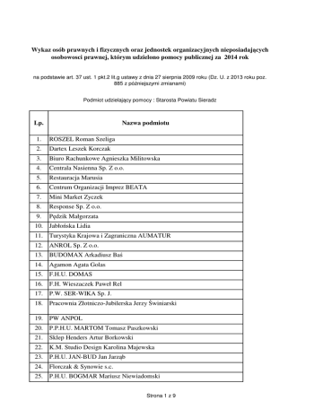 Wykaz osób prawnych i fizycznych oraz jednostek organizacyjnych nieposiadających osobowosci prawnej, którym udzielono pomocy publicznej za 2014 rok na podstawie art. 37 ust. 1 pkt.2 lit.g ustawy z dnia 27 sierpnia 2009 roku (Dz. U. z 2013 roku poz. 885 z późniejszymi zmianami) Podmiot udzielający pomocy : Starosta Powiatu Sieradz Lp. Nazwa podmiotu 1. ROSZEL Roman Szeliga 2. Dartex Leszek Korczak 3. Biuro Rachunkowe Agnieszka Militowska 4. Centrala Nasienna Sp. Z o.o. 5. Restauracja Marusia 6. Centrum Organizacji Imprez BEATA 7. Mini Market Zyczek 8. Response Sp. Z o.o. 9. Pędzik Małgorzata 10. Jabłońska Lidia 11. Turystyka Krajowa i Zagraniczna AUMATUR 12. ANROL Sp. Z o.o. 13. BUDOMAX Arkadiusz Baś 14. Agamon Agata Golas 15. F.H.U. DOMAS 16. F.H. Wieszaczek Paweł Rel 17. P.W. SER-WIKA Sp. J. 18. Pracownia Złotniczo-Jubilerska Jerzy Świniarski 19. PW ANPOL 20. P.P.H.U. MARTOM Tomasz Paszkowski 21. Sklep Henders Artur Borkowski 22. K.M. Studio Design Karolina Majewska 23. P.H.U. JAN-BUD Jan Jarząb 24. Florczak & Synowie s.c. 25. P.H.U. BOGMAR Mariusz Niewiadomski Strona 1 z 9 26. Serwis Ppoż Dawid Janeczek 27. Adamczewski Arkadiusz 28. 3B sp. Z o.o. 29. TRES-MED. Sp. Z o.o. 30. Pietrzak Ewa 31. Pędziwiatr Mirosław 32. Owczarek Alicja 33. Grzelak Tadeusz 34. Angerman Linda 35. Świniarski Krzysztof 36. Tryka Katarzyna 37. Auto-Trade-Service Szymon Pokrakowski 38. Strachora Dariusz 39. Petrosyan Armen 40. Sikora Bogdan 41. Dąbrowska Joanna 42. Oracz Krzysztof 43. Piekielny Przemysław 44. Paszkowska Katarzyna 45. GT Kopacki Grzegorz KaźmierczakTomasz 46. Przedsiębiorstwo Komunalne Sp. Z o.o. 47. F.H.U. ZYK Barbara Noweta 48. Sieradzka TV Media Czesław Zasiński 49. Szkudlarek Roman 50. Wąsowska Aleksandra 51. Długosz Małgorzata 52. AZOTAS Mariusz Pryk 53. Skrok-Wawrzyniak Hanna 54. Łuczak Anna 55. Górniak Ewa 56. SZAR-POL Józef Szarzała 57. MOTOMARK PLUS Tomasz Szumicki 58. Salamon Magdalena 59. Makowska Małgorzata 60. Wysocka Katarzyna Strona 2 z 9 61. MANREK Roman Owczarek 62. Andrysiak Przemysław 63. Gotkowicz Danuta 64. Stępień Katarzyna 65. Matusiak Grażyna 66. Szczepaniak Tomasz 67. Zakład Wulkanizacyjny Arkadiusz Wawrzyniak 68. Restauracja Kasztelanka 69. Tomczyk Grzegorz 70. Nogala Sławomir 71. Urbaniak Róża 72. Żurawski Tomasz 73. Socjal Work 74. Przybylak Sebastian 75. Kaczmarek Darian 76. GRAFIT Sp. Z o.o. 77. Jaworski Zygmunt 78. Leszczyk Małgorzata 79. Błońska-Pleban Katarzyna 80. Barczyńska Agnieszka 81. Zarębski Paweł 82. Maj Olga 83. Bartosik Rafał 84. Kowalczyk Maciej 85. Tusz Wiesław 86. Mańka Danuta 87. P.W. KRIS Krzysztof Szmytka 88. Asclepios S.A. 89. Bartela Jacek 90. Grzybowski Zbigniew 91. Jakubczak Andrzej 92. Bartczak Justyna 93. Rakowski Karol 94. Maczuga Marcin 95. Świątek Marek Strona 3 z 9 96. Obrzud Tomasz 97. Kartagina Elżbieta Bobrowska 98. Kosecki Tomasz 99. Wawrzyniak Adrian 100. Stradomska Urszula 101. Szumiela Radosław 102. Skrzypiński Piotr 103. Firas Ewelina 104. Misiak Piotr 105. Grzelak Dorota 106. Dondziłło Monika 107. Kaźmierczak Jacek 108. Rzepnicki Paweł 109. Klucha Hubert 110. Klimczak Marcin 111. Rakowska Agnieszka 112. Perdek Błażej 113. Smus Marta 114. Płócienniczak Michał 115. Brzeziecki Damian 116. Ślipek Elżbieta 117. Florek Tomasz 118. Mikulec Karol 119. Kupis Jacek 120. Misiak Michał 121. Chrzanowska Magdalena 122. Borkowski Kamil 123. Bednarkiewicz Sylwia 124. Stępień Wiesław 125. Nowak Michał 126. Owczarek Paulina 127. Caffe Italia Marina Jaworska 128. OKNOPOLPiotr Stasiak 129. Urbaniak Justyna 130. Hillebrand Wojciech Strona 4 z 9 131. MIRWAL S.J. 132. Tartak Stanisław Mucha 133. Łyczkowski Dominik 134. Janczar Daniel 135. Wróblewski Jan 136. Rachwalski Paweł 137. Szczepaniak Roman 138. Haas Łukasz 139. Szymański Michał 140. Łacina Bartosz 141. Przyk Emilia 142. Domański Mariusz 143. Kwiatkowski Konrad 144. Wróż Michał 145. Macuga Daniel 146. Kołoszczyk Olga 147. Kaczmarek Anna 148. Kowalczyk Adrian 149. Aura Maja Ryl 150. Gołąbek Hubert 151. Produkcja Biomasy 152. Inter-Auto Przymuszała 153. Zakład Fryzjerski Matusiak 154. ZDROWIE Sp. Z o.o. 155. Ciach Paweł 156. P.H.U. Skorpion 157. NZOZ Krysta-Med. 158. Sieradzka TV Media Czesław Zasiński 159. Gułaj Piotr 160. Gaz-Projekt Banach 161. Kardecki Damian 162. Krzymińska Monika 163. Dominiak Piotr 164. Anpol 165. F.H.U. ZYK Barbara Noweta Strona 5 z 9 166. Florczak Bożena 167. Mini Market Zyczek 168. HYDRO-Masz Sęcerscy 169. Więdłocha Anna 170. Kancelaria Radcy Prawnego Athena 171. F.H.U. ZYK Barbara Noweta 172. Mini Market Zyczek 173. Stępiński Tomasz 174. P.P.H.U. LEWEX Wiesław Leoniak 175. Sulikowska Agnieszka 176. P.P.H.U. Stamet Bogdan Stasiak 177. Makówka Sebastian 178. MIRWAL S.J. 179. Bar Smakosz 180. GLASS CAR Konrad Grabia 181. Chiron Dariusz Majer 182. Sieradzka Spółdzielnia Mieszkaniowa 183. Sklep Spożywczo Przemysłowy Ryszard Wawrzyniak 184. Z.P.iH.M. ZŁOTEX 185. Sklep Spożywczy Agnieszka Jonczyk 186. F.H.P. PAULA Małgorzata Musiała 187. Don Vito Joanna Raj 188. Bank Spółdzielczy w Błaszkach 189. Kopka Bartosz 190. Miklas Łukasz 191. Polak Adroan 192. Kamiński Marcin 193. Słupiński Mateusz 194. Trzcińska Katarzyna 195. Z.P.iH.M. ZŁOTEX 196. Lewandowski Tomasz 197. Kokoszka mateusz 198. Potapski Michał 199. Frasunkiewicz Marcin 200. FOTO-DENT Strona 6 z 9 201. Jeziorska Justyna 202. Pesta Wojciech 203. Witkowski Piotr 204. Piotrowski Tomasz 205. Witaszczyk Rafał 206. Strumiński Daniel 207. Ugorny Michał 208. Przedsiębiorstwo Komunalne Sp. Z o.o. 209. NORMA Nina Obałka 210. Smus Przemysław 211. Gabrysiak Agata 212. Pluskwa Janusz 213. Dominiak Dawid 214. Jankowski Zbigniew 215. Kokoszka Tomasz 216. Kowalska Dominika 217. Werner Joanna 218. Bank Spółdzielczy w Błaszkach 219. Przedsiębiorstwo Robót drogowych i Mostowych 220. MIRWAL S.J. 221. Przedsiębiorstwo Drobiarskie Grzegorz Wyrębski 222. MIRWAL S.J. 223. Spółdzielnia Socjalna Color Trip 224. Su