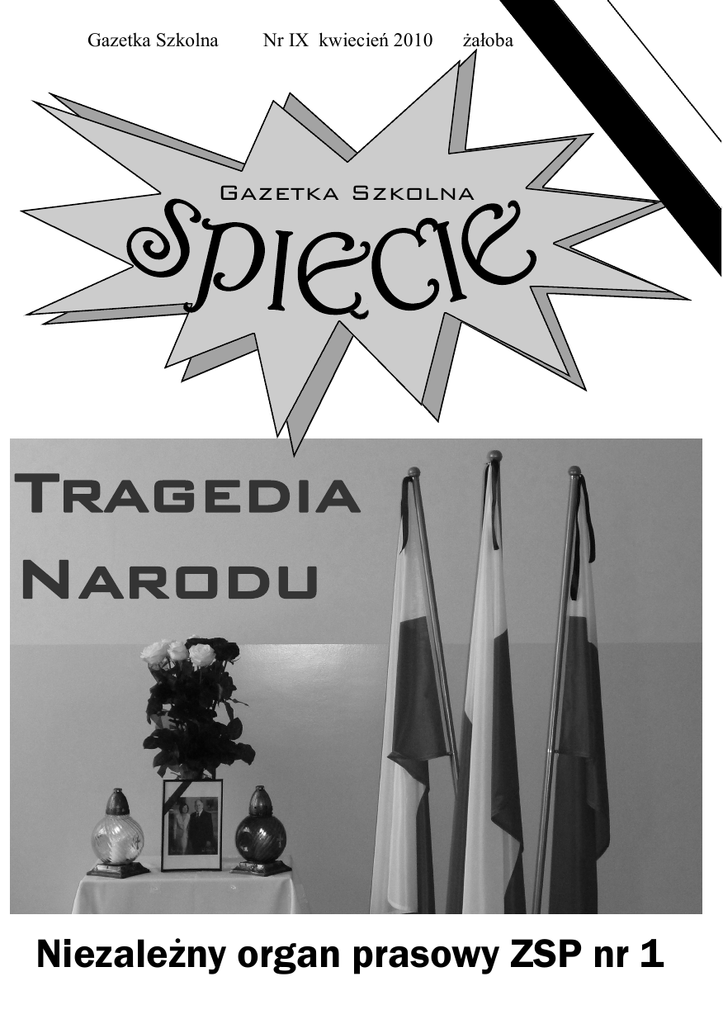 Gazetka Szkolna Nr IX kwiecień 2010 żałoba Gazetka Szkolna Tragedia Narodu Niezależny organ prasowy ZSP nr 1 Wspomnienie... Jeśli zapomnę o nich, ty Boże na niebie zapomnij o mnie... Podobnie jak setki polskich szkół po tragicznej katastrofie w Smoleńsku ,Elektryk też wysłał swoją reprezentację pod pałac prezydencki. W piątek,16 kwietnia uczniowie klasy 1dlo wraz z nauczycielami pojechali do Warszawy aby złożyć hołd zmarłemu prezydentowi Lechowi Kaczyńskiemu i jego żonie Marii. Nasi koledzy zapalili znicz, a następnie udali się do archikatedry Św. Jana. W kościele trwały przygotowania do sobotniej mszy żałobnej, młodzież miała okazję wysłuchać kilku pieśni chóru, zwiedziła też podziemne krypty katedry. Miejscem, którego nie można było pominąć stał się w piątek Plac Piłsudskiego, za kilkanaście godzin miały się tam odbyć uroczystości żałobne ofiar smoleńskiej tragedii. Str. 2 Wspomnienie... „i cisza jest na wysokościach i dymi mgłą smoleński las” 10 kwietnia o godzinie 8.56 cała Polska zamarła. Telewizja i radio przerwały swoje programy i audycje, aby podać wiadomości z ostatniej chwili. Tragiczna wieść rozeszła się po całym kraju. Samolot, którym polska delegacja udała się na obchody związane z 70. rocznicą mordu katyńskiego, jak wielki, żelazny ptak runął na ziemię. Prezydent Lech Kaczyński, jego małżonka Maria, przedstawiciele sejmu i senatu, duchownych i wojskowych, szefowie ważnych instytucji państwowych, reprezentanci rodzin katyńskich, prawdziwa elita naszego kraju- nikt z 96 osób, będących na pokładzie Tu-154 nie przeżył. O tragedii pod Smoleńskiem dowiedział się cały świat. I cały świat pogrążył się w smutku i żalu. Polska z każdego zakątka na ziemi mogła liczyć na słowa i gesty współczucia oraz wsparcia. Cierpienie zjednoczyło cały naród, ludzi, którzy do tej pory nie mogą uwierzyć w to, co się stało… Żałobę i przygnębienie mogliśmy dostrzec także w naszym najbliższym otoczeniu. Już w sobotę całe Siedlce przybrały biało czerwone barwy. Na głównych ulicach miasta wywieszone zostały flagi z kirem. Siedleckie media na bieżąco przedstawiały najświeższe wiadomości, najbar- dziej bolesne fakty dotyczące katastrofy. Miasto zwolniło swoje codzienne tempo. W powietrzu czuć było przygnębiającą aurę. Siedlczanie w tych trudnych momentach zjednoczyli się ze sobą i ze ws z ys t k i mi r od a k a mi . W kościołach odprawiano msze za dusze ofiar. Miejsce pod pomnikiem Kościuszki siedlczanie i okoliczni mieszkańcy regularnie zapełniali płonącymi zniczami i kwiata- prezydenckiej przy którym płonęły znicze, zdobiły go piękne bukiety róż. Każdy z nas miał okazję zatrzymać się w tym miejscu i pochylić czoła przed fotografią tragicznie zmarłej pierwszej pary. Każda klasa lekcje rozpoczęła symboliczną chwilą ciszy. Zamilkło także nasze szkolne radio. Jedynym głosem, który z niego rozbrzmiewał był apel uczniów, którzy pomogli każdemu poczuć w sercach smutek i zadumę. Nauczyciele również ułatwili nam zrozumienie ogromu tragedii i odpowiednie przeżywanie tego smutnego czasu. Podczas lekcji wiele klas udało się pod pomnik Kościuszki aby złożyć hołd ofiarom smoleńskim. Niektórzy z nas pojechali do Warszawy, żeby być bliżej oraz poczuć atmosferę zjednoczenia w bólu, mi, składanymi ze zwykłej po to, aby osobiście złożyć hołd potrzeby serca. Na placu zmarłym. miały miejce uroczyste ob„Zginęli służąc Ojczyźnie. chody żałobne, w których Nigdy o nich nie zapomnimy. udział wzięły kompanie ho- Cześć pamięci ofiar katastrofy norowe policji i straży pożar- w Smoleńsku”. Te słowa, zamiesznej. Siedlce uczciły pamięć czone przez delegację „Elektryka” ofiar katastrofy w należyty w księdze kondolencyjnej, wystasposób. wionej w Urzędzie Miasta Siedlce „Elektryk” również nie są najdoskonalszym dowodem na zapomniał o tragicznie zmar- to, że wszyscy łączymy się łych, wielkich Polakach. w smutku, rozumiemy co stało się Z naszej strony padło wiele pod Smoleńskiem i jak cała Polska ciepłych gestów współczucia potrafimy wykazać się prawdzii jedności. Na korytarzu zo- wym, szczerym patriotyzmem. stał wystawiony portret pary Monika Sobiczewska Str. 3 „Guziki” Tylko guziki nieugięte przetrwały śmierć świadkowie zbrodni z głębin wychodzą na powierzchnię jedyny pomnik na ich grobie są aby świadczyć Bóg policzy i ulituje się nad nimi lecz jak zmartwychwstać mają ciałem kiedy są lepką cząstką ziemi przeleciał ptak przepływa obłok upada liść kiełkuje ślaz i cisza jest na wysokościach i dymi mgłą smoleński las tylko guziki nieugięte potężny głos zamilkłych chórów tylko guziki nieugięte guziki z płaszczy i mundurów Zbigniew Herbert Str. 4 Wspomnienie... Katyń 70 lat temu "Kula w tył głowy i b e zi mi e n n a m o g i ł a w brzozowym lasku. Czaszki z przestrzeloną potylicą, chciwe ręce przeszukujące kieszenie płaszczy i mundurów. Mordercy jedzący w stołówce NKWD łyżkami wódkę z talerza zamiast zupy." Katyńmiejscowość w Rosji koło Smoleńska, niedaleko której znajduje się miejsce zbrodni sowieckiej. W kwietniu i maju 1940, w lesie koło Katynia, NKWD (na podstawie decyzji Stalina i Biura Politycznego KC WKP) zamordowało około 4200 polskich oficerów i podchorążych, wziętych do niewoli po agresji radzieckiej na Polskę 17 września 1939. Wcześniej byli oni więzieni w Kozielsku, gdzie znajdował się jeden z trzech obozów internowania polskich jeńców. Łącznie przetrzymywano w nich 15 tys. oficerów i żołnierzy Korpusu Ochrony Pogranicza, policjantów i podchorążych. 13 kwietnia 1943 Niemcy ogłosili, iż odkryli groby polskich oficerów zamordowanych przez NKWD. Władze sowieckie zaprzeczyły, oskarżając o zbrodnię nazistów. Rząd Rzeczpospolitej Polskiej na Uchodźstwie zwr