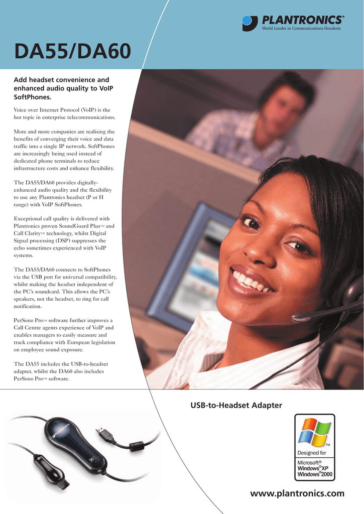 DA55/DA60 Add headset convenience and enhanced audio quality to VoIP SoftPhones. Voice over Internet Protocol (VoIP) is the hot topic in enterprise telecommunications. More and more companies are realising the benefits of converging their voice and data traffic into a single IP network. SoftPhones are increasingly being used instead of dedicated phone terminals to reduce infrastructure costs and enhance flexibility. The DA55/DA60 provides digitallyenhanced audio quality and the flexibility to use any Plantronics headset (P or H range) with VoIP SoftPhones. Exceptional call quality is delivered with Plantronics proven SoundGuard PlusTM and Call ClarityTM technology, whilst Digital Signal processing (DSP) suppresses the echo sometimes experienced with VoIP systems. The DA55/DA60 connects to SoftPhones via the USB port for universal compatibility, whilst making the headset independent of the PC’s soundcard. This allows the PC’s speakers, not the headset, to ring for call notification. PerSono ProTM software further improves a Call Centre agents experience of VoIP and enables managers to easily measure and track compliance with European legislation on employee sound exposure. The DA55 includes the USB-to-headset adapter, whilst the DA60 also includes PerSono ProTM software. USB-to-Headset Adapter www.plantronics.com DA55/DA60 Key Features System Requirements USB-to-Headset Adapter • SoundGuard Plus & Call Clarity for exceptional sound quality. • DSP Echo suppression improves VoIP quality • Inline volume and mute controls for convenient sound adjustment. • Compatible with all Plantronics headsets (P or H range) for a choice of headset wearing styles and investment protection. • USB connection provides universal compatibility & allows PC speakers to ring for incoming calls. Persono Pro 2™ Persono Pro 2™ Agent & Supervisor Database Service Microsoft® Windows® XP or Windows® 2000 Pentium II 300MHz Pentium III 1GHz 128MB (*256MB) 256MB (*512MB) 20MB 10MB N/A Max 2GB USB & CD or Network Network Operating System CPU Memory (*recommended) Install space required Database size Connectivity Specification subject to change Persono Pro Agent/Supervisor Software • Sound customisation via ‘equaliser’ & volume settings. • Server-storage of agent-settings allows preferences to be maintained when logging in at another PC or when multiple agents share the same PC. • Supervisor can optionally override agent settings for consistency. • Sound dosage reports (Time Weighted Average measurement) help supervisors track compliance with European sound exposure legislation. Software language support - English, German, French, Dutch, Italian, Spanish, Finnish, Swedish, Danish, Norwegian, Korean, Simplified Chinese and Japanese. PerSono ProTM Software Ordering Information Part No. EAN 13 Bar Code DA55/A with inline control DA60/A with Persono Pro Software & inline controls DA60/A with Persono Pro Software but no inline controls Persono Pro Software Spare: Adaptor to QD lead with inline controls Spare: Adaptor to QD lead without inline controls 36818-03 36818-01 36818-02 65284-01 65581-02 65582-01 5033588016427 5033588015215 5033588015222 Not Applicable Not Applicable Not Applicable Regional Telephone Numbers: Plantronics B.V. Hoofddorp, Nederland (0)0800 PLANTRONICS 0800 7526876 (NL) 00800 75268766 (BE/LUX) Plantronics Sarl Noisy-le-Grand, France No Indigo: 0825 0825 99 0 , 15 € TTC / mn +33 (0)1 41 67 41 41 Plantronics Acoustics Italia Srl Milano, Italia Numero Verde: 800 950934 +39 039 685971 Plantronics GmbH Hürth, Deutschland Service: 0800 9323 400 Technik: 0180 5007996 Österreich: 0800 242 500 Schweiz: 0800 932 340 Plantronics Iberia, S.L. Madrid, España 902 41 51 91 +34 91 640 47 44 © 2004 Plantronics Inc. All rights reserved. Plantronics, the logo design, Plantronics and the logo design combined, Call Clarity, PerSono Pro 2, SoundGuard Plus are trademarks or registered trademarks of Plantronics, Inc. Microsoft and Windows are either registered trademarks or trademarks of Microsoft Corporation in the United States and/or other countries. AW0063RV08DL Plantronics Middle East Eastern Europe, Africa and India +44 (0)1793 842443 Nordic Region Finland: 0201 550 550 Sverige: 031 28 95 00 Danmark: 44 35 05 35 Norge: 23 17 37 70 DA60/UK/0204 Plantronics Ltd Wootton Bassett, UK 0800 410014 +44 (0)1793 842200