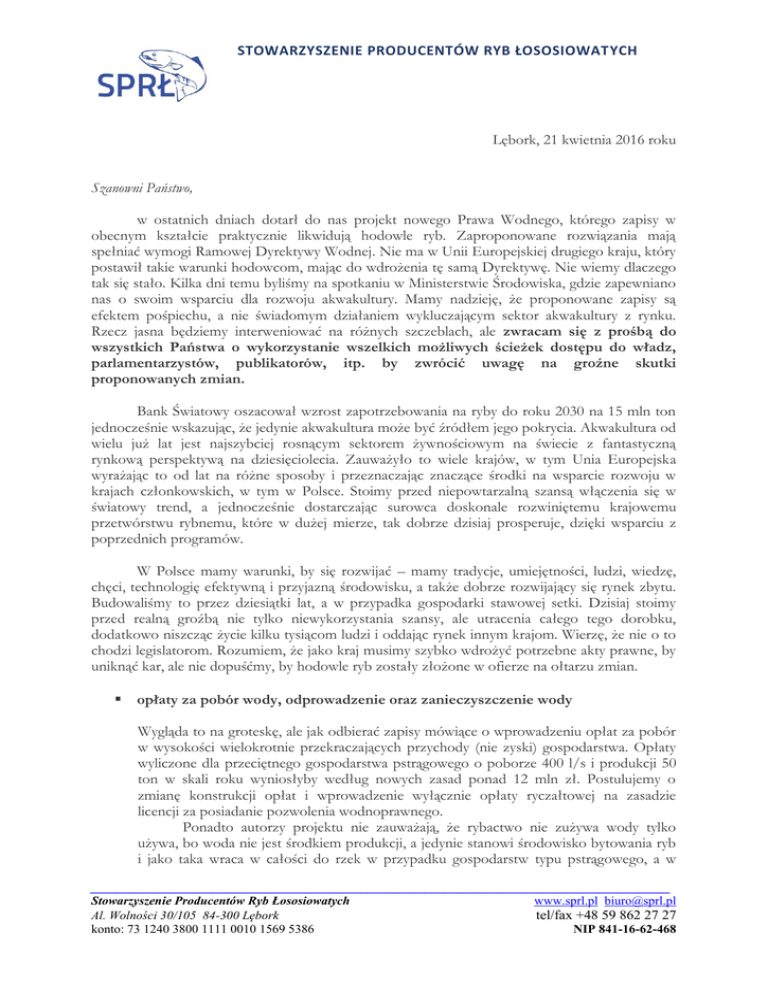 STOWARZYSZENIE PRODUCENTÓW RYB ŁOSOSIOWATYCH Lębork, 21 kwietnia 2016 roku Szanowni Państwo, w ostatnich dniach dotarł do nas projekt nowego Prawa Wodnego, którego zapisy w obecnym kształcie praktycznie likwidują hodowle ryb. Zaproponowane rozwiązania mają spełniać wymogi Ramowej Dyrektywy Wodnej. Nie ma w Unii Europejskiej drugiego kraju, który postawił takie warunki hodowcom, mając do wdrożenia tę samą Dyrektywę. Nie wiemy dlaczego tak się stało. Kilka dni temu byliśmy na spotkaniu w Ministerstwie Środowiska, gdzie zapewniano nas o swoim wsparciu dla rozwoju akwakultury. Mamy nadzieję, że proponowane zapisy są efektem pośpiechu, a nie świadomym działaniem wykluczającym sektor akwakultury z rynku. Rzecz jasna będziemy interweniować na różnych szczeblach, ale zwracam się z prośbą do wszystkich Państwa o wykorzystanie wszelkich możliwych ścieżek dostępu do władz, parlamentarzystów, publikatorów, itp. by zwrócić uwagę na groźne skutki proponowanych zmian. Bank Światowy oszacował wzrost zapotrzebowania na ryby do roku 2030 na 15 mln ton jednocześnie wskazując, że jedynie akwakultura może być źródłem jego pokrycia. Akwakultura od wielu już lat jest najszybciej rosnącym sektorem żywnościowym na świecie z fantastyczną rynkową perspektywą na dziesięciolecia. Zauważyło to wiele krajów, w tym Unia Europejska wyrażając to od lat na różne sposoby i przeznaczając znaczące środki na wsparcie rozwoju w krajach członkowskich, w tym w Polsce. Stoimy przed niepowtarzalną szansą włączenia się w światowy trend, a jednocześnie dostarczając surowca doskonale rozwiniętemu krajowemu przetwórstwu rybnemu, które w dużej mierze, tak dobrze dzisiaj prosperuje, dzięki wsparciu z poprzednich programów. W Polsce mamy warunki, by się rozwijać – mamy tradycje, umiejętności, ludzi, wiedzę, chęci, technologię efektywną i przyjazną środowisku, a także dobrze rozwijający się rynek zbytu. Budowaliśmy to przez dziesiątki lat, a w przypadka gospodarki stawowej setki. Dzisiaj stoimy przed realną groźbą nie tylko niewykorzystania szansy, ale utracenia całego tego dorobku, dodatkowo niszcząc życie kilku tysiącom ludzi i oddając rynek innym krajom. Wierzę, że nie o to chodzi legislatorom. Rozumiem, że jako kraj musimy szybko wdrożyć potrzebne akty prawne, by uniknąć kar, ale nie dopuśćmy, by hodowle ryb zostały złożone w ofierze na ołtarzu zmian. opłaty za pobór wody, odprowadzenie oraz zanieczyszczenie wody Wygląda to na groteskę, ale jak odbierać zapisy mówiące o wprowadzeniu opłat za pobór w wysokości wielokrotnie przekraczających przychody (nie zyski) gospodarstwa. Opłaty wyliczone dla przeciętnego gospodarstwa pstrągowego o poborze 400 l/s i produkcji 50 ton w skali roku wyniosłyby według nowych zasad ponad 12 mln zł. Postulujemy o zmianę konstrukcji opłat i wprowadzenie wyłącznie opłaty ryczałtowej na zasadzie licencji za posiadanie pozwolenia wodnoprawnego. Ponadto autorzy projektu nie zauważają, że rybactwo nie zużywa wody tylko używa, bo woda nie jest środkiem produkcji, a jedynie stanowi środowisko bytowania ryb i jako taka wraca w całości do rzek w przypadku gospodarstw typu pstrągowego, a w __________________________________________________________________________________________ Stowarzyszenie Producentów Ryb Łososiowatych www.sprl.pl [email protected] Al. Wolności 30/105 84-300 Lębork tel/fax +48 59 862 27 27 konto: 73 1240 3800 1111 0010 1569 5386 NIP 841-16-62-468 STOWARZYSZENIE PRODUCENTÓW RYB ŁOSOSIOWATYCH przypadku gospodarstw stawowych pełni wiele innych ważnych środowiskowo funkcji, które zupełnie zostały pominięte. Proponowane opłaty za przekroczenia, czy to poboru wody, czy limitu zanieczyszczeń powodują natychmiastową likwidację hodowli, nie dając szansy na poprawę. Restrykcyjność proponowanych rozwiązań sprawia, że hodowla będzie przypominać rosyjską ruletkę, bo kto udźwignie milionowe kary w wypadku przekroczeń, które mogą się zdarzyć z takiej, czy innej, mniej lub bardziej zawinionej przyczyny, czy też z powodów środowiskowych, błędów diagnostycznych, technicznych itp. opomiarowanie ilości wody pobieranej i odprowadzanej oraz ciągły monitoring substancji w wodzie odprowadzanej Projekt Prawa Wodnego wprowadza obowiązek instalacji certyfikowanych urządzeń do stałego monitorowania ilości pobieranej i odprowadzanej wody w celu wyliczenia różnicy (wychwycenia ilości wody utraconej). Mija się to z celem, jest bardzo kosztowne przy takich przepływach i technicznie problematyczne. Dodatkowo są sytuacje, w których dla bezpieczeństwa trzeba przepuścić wodę przez stawy, nie mówiąc o tym, że są gospodarstwa z wieloma miejscami poboru. W przypadku stawów karpiowych punktów poboru i zrzutu jest wiele, instalowanie na każdym urządzenia jest niemożliwe, a rozliczanie za utratę wody, w przypadku wystąpienia suszy, powodzi, opadów, przesiąków to absurd. Hodowcy zachęcani w minionych latach polityką unijną i krajową inwestowali przy udziale środków unijnych. Państwo polskie w 2014 roku przyjęło załącznik nr 6 do Wieloletniego Krajowego Planu Strategicznego dla Akwakultury „AKWAKULTURA 2020 – PLAN STRATEGICZNY ROZWOJU CHOWU I HODOWLI RYB W POLSCE 2014-2020” i dzisiaj to samo państwo zmienia warunki gry w sposób, który uniemożliwia działalność? A co z trwałością gospodarczą projektów realizowanych przy udziale funduszy wsparcia – trzeba będzie zwracać? Gospodarstwa rybackie są specyficznym użytkownikiem wód i fakt ten powinien znaleźć odzwierciedlanie w regulacjach prawnych ich dotyczących. Ze swojej strony deklarujemy pełną, kompetentną i konstruktywną współpracę z legislatorami w tworzeniu korzystnych dla wszystkich rozwiązań. W imieniu Zarządu SPRŁ __________________________________________________________________________________________ 
