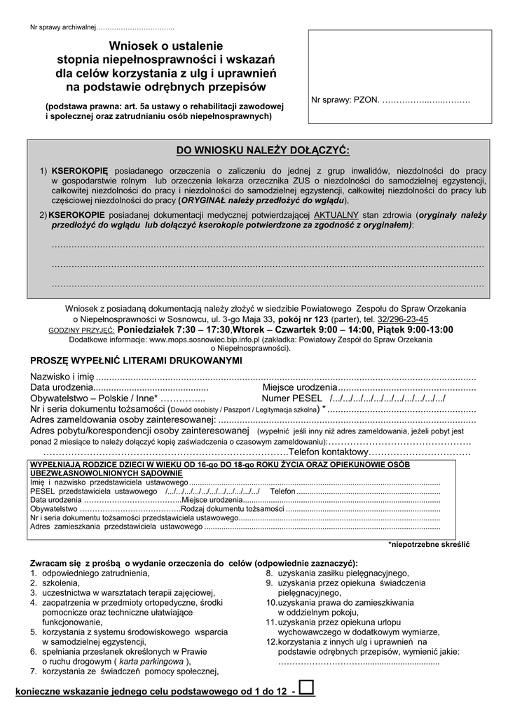Nr sprawy archiwalnej…………………………….. Wniosek o ustalenie stopnia niepełnosprawności i wskazań dla celów korzystania z ulg i uprawnień na podstawie odrębnych przepisów (podstawa prawna: art. 5a ustawy o rehabilitacji zawodowej i społecznej oraz zatrudnianiu osób niepełnosprawnych) Nr sprawy: PZON. ……………..…..………. DO WNIOSKU NALEŻY DOŁĄCZYĆ: 1) KSEROKOPIĘ posiadanego orzeczenia o zaliczeniu do jednej z grup inwalidów, niezdolności do pracy w gospodarstwie rolnym lub orzeczenia lekarza orzecznika ZUS o niezdolności do samodzielnej egzystencji, całkowitej niezdolności do pracy i niezdolności do samodzielnej egzystencji, całkowitej niezdolności do pracy lub częściowej niezdolności do pracy (ORYGINAŁ należy przedłożyć do wglądu), 2) KSEROKOPIE posiadanej dokumentacji medycznej potwierdzającej AKTUALNY stan zdrowia (oryginały należy przedłożyć do wglądu lub dołączyć kserokopie potwierdzone za zgodność z oryginałem): ……………………………………………………………………………………………………………………………………… ……………………………………………………………………………………………………………………………………… ……………………………………………………………………………………………………………………………………… Wniosek z posiadaną dokumentacją należy złożyć w siedzibie Powiatowego Zespołu do Spraw Orzekania o Niepełnosprawności w Sosnowcu, ul. 3-go Maja 33, pokój nr 123 (parter), tel. 32/296-23-45 GODZINY PRZYJĘĆ: Poniedziałek 7:30 – 17:30,Wtorek – Czwartek 9:00 – 14:00, Piątek 9:00-13:00 Dodatkowe informacje: www.mops.sosnowiec.bip.info.pl (zakładka: Powiatowy Zespół do Spraw Orzekania o Niepełnosprawności). PROSZĘ WYPEŁNIĆ LITERAMI DRUKOWANYMI Nazwisko i imię ............................................................................................................................................... Data urodzenia............................................. Miejsce urodzenia .................................................... Obywatelstwo – Polskie / Inne* …………... Numer PESEL /.../.../.../.../.../.../.../.../.../.../.../ Nr i seria dokumentu tożsamości (Dowód osobisty / Paszport / Legitymacja szkolna) * ........................................................ Adres zameldowania osoby zainteresowanej: ................................................................................................. Adres pobytu/korespondencji osoby zainteresowanej (wypełnić jeśli inny niż adres zameldowania, jeżeli pobyt jest ponad 2 miesiące to należy dołączyć kopię zaświadczenia o czasowym zameldowaniu): ………………………………………. …………………………………………………………………….Telefon kontaktowy…………………………… WYPEŁNIAJĄ RODZICE DZIECI W WIEKU OD 16-go DO 18-go ROKU ŻYCIA ORAZ OPIEKUNOWIE OSÓB UBEZWŁASNOWOLNIONYCH SĄDOWNIE Imię i nazwisko przedstawiciela ustawowego ..................................................................................................................... PESEL przedstawiciela ustawowego /.../.../.../.../.../.../.../.../.../.../.../ Telefon ................................................................... Data urodzenia ……………………….………..Miejsce urodzenia............................................................................................ Obywatelstwo ………………………………….Rodzaj dokumentu tożsamości ........................................................................ Nr i seria dokumentu tożsamości przedstawiciela ustawowego.............................................................................................. Adres zamieszkania przedstawiciela ustawowego .............................................................................................................. *niepotrzebne skreślić Zwracam się z prośbą o wydanie orzeczenia do celów (odpowiednie zaznaczyć): 1. odpowiedniego zatrudnienia, 8. uzyskania zasiłku pielęgnacyjnego, 2. szkolenia, 9. uzyskania przez opiekuna świadczenia 3. uczestnictwa w warsztatach terapii zajęciowej, pielęgnacyjnego, 4. zaopatrzenia w przedmioty ortopedyczne, środki 10. uzyskania prawa do zamieszkiwania pomocnicze oraz techniczne ułatwiające w oddzielnym pokoju, funkcjonowanie, 11. uzyskania przez opiekuna urlopu 5. korzystania z systemu środowiskowego wsparcia wychowawczego w dodatkowym wymiarze, w samodzielnej egzystencji, 12. korzystania z innych ulg i uprawnień na 6. spełniania przesłanek określonych w Prawie podstawie odrębnych przepisów, wymienić jakie: o ruchu drogowym ( karta parkingowa ), …………………………................................. 7. korzystania ze świadczeń pomocy społecznej, konieczne wskazanie jednego celu podstawowego od 1 do 12 - Oświadczam, że: (odpowiednie zaznaczyć) 1) Stan cywilny: - żonaty/mężatka - rozwiedziony/a - w separacji - wdowiec/wdowa - kawaler/panna 2) Wykształcenie: - mniej niż podstawowe - podstawowe - zasadnicze - średnie - wyższe 3) Zawód wyuczony ...................................................... Zawód obecnie wykonywany……..………………………………… 4) Miejsce pracy (nazwa zakładu)………………..……………………………………..Staż pracy…..………………………….. 5) Wykonywanie czynności samoobsługowych (dot. np. higieny osobistej, załatwiania potrzeb fizjologicznych, spożywania posiłków, ubierania się, przyjmowania leków) - z opieką - z pomocą - samodzielnie 6) Poruszanie się (dot. np. w obrębie mieszkania, w środowisku, korzystanie z środków lokomocji) - z opieką - z pomocą - samodzielnie 7) Prowadzenie gospodarstwa domowego (dot. np. robienia zakupów, gotowa