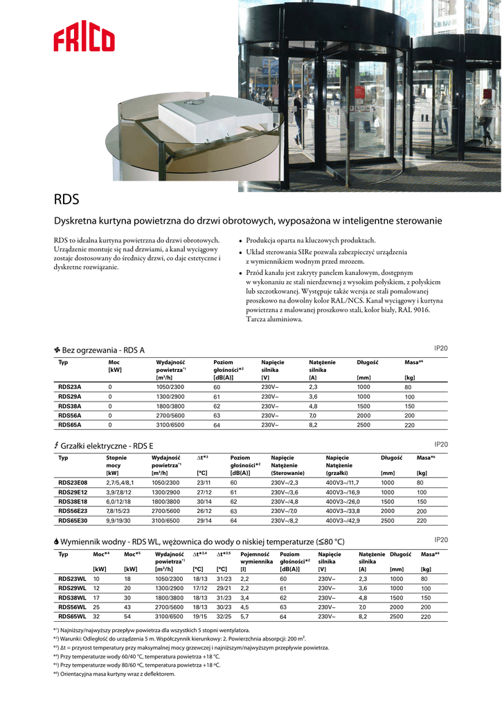 Kurtyny powietrzne RDS Dyskretna kurtyna powietrzna do drzwi obrotowych, wyposażona w inteligentne sterowanie RDS to idealna kurtyna powietrzna do drzwi obrotowych. Urządzenie montuje się nad drzwiami, a kanał wyciągowy zostaje dostosowany do średnicy drzwi, co daje estetyczne i dyskretne rozwiązanie. • Produkcja oparta na kluczowych produktach. • Układ sterowania SIRe pozwala zabezpieczyć urządzenia z wymiennikiem wodnym przed mrozem. • Przód kanału jest zakryty panelem kanałowym, dostępnym w wykonaniu ze stali nierdzewnej z wysokim połyskiem, z połyskiem lub szczotkowanej. Występuje także wersja ze stali pomalowanej proszkowo na dowolny kolor RAL/NCS. Kanał wyciągowy i kurtyna powietrzna z malowanej proszkowo stali, kolor biały, RAL 9016. Tarcza aluminiowa. IP20 1 Bez ogrzewania - RDS A Typ Moc [kW] Wydajność powietrza*1 [m3/h] Poziom głośności*2 [dB(A)] Napięcie silnika [V] Natężenie silnika [A] Długość Masa* [mm] [kg] RDS23A 0 1050/2300 60 230V~ 2,3 1000 80 RDS29A 0 1300/2900 61 230V~ 3,6 1000 100 RDS38A 0 1800/3800 62 230V~ 4,8 1500 150 RDS56A 0 2700/5600 63 230V~ 7,0 2000 200 RDS65A 0 3100/6500 64 230V~ 8,2 2500 220 6 IP20 3 Grzałki elektryczne - RDS E Typ Stopnie mocy [kW] Wydajność powietrza*1 [m3/h] ∆t* RDS23E08 2,7/5,4/8,1 1050/2300 RDS29E12 3,9/7,8/12 RDS38E18 6,0/12/18 RDS56E23 RDS65E30 Napięcie Natężenie (Sterowanie) Napięcie Natężenie (grzałki) Długość [°C] Poziom głośności*2 [dB(A)] [mm] [kg] 23/11 60 230V~/2,3 400V3~/11,7 1000 80 1300/2900 27/12 61 230V~/3,6 400V3~/16,9 1000 100 1800/3800 30/14 62 230V~/4,8 400V3~/26,0 1500 150 7,8/15/23 2700/5600 26/12 63 230V~/7,0 400V3~/33,8 2000 200 9,9/19/30 3100/6500 29/14 64 230V~/8,2 400V3~/42,9 2500 220 3 Masa* 6 IP20 2 Wymiennik wodny - RDS WL, wężownica do wody o niskiej temperaturze (480 °C) Typ Moc*4 [kW] RDS23WL 10 Moc*5 ∆t*3,4 [kW] Wydajność powietrza*1 [m3/h] [°C] 18 1050/2300 18/13 ∆t*3,5 Poziom głośności*2 [dB(A)] Napięcie silnika [V] Natężenie Długość silnika [A] [mm] Masa*6 [°C] Pojemność wymiennika [l] 31/23 2,2 60 230V~ 2,3 80 1000 [kg] RDS29WL 12 20 1300/2900 17/12 29/21 2,2 61 230V~ 3,6 1000 100 RDS38WL 17 30 1800/3800 18/13 31/23 3,4 62 230V~ 4,8 1500 150 RDS56WL 25 43 2700/5600 18/13 30/23 4,5 63 230V~ 7,0 2000 200 RDS65WL 32 54 3100/6500 19/15 32/25 5,7 64 230V~ 8,2 2500 220 *1) Najniższy/najwyższy przepływ powietrza dla wszystkich 5 stopni wentylatora. *2) Warunki: Odległość do urządzenia 5 m. Współczynnik kierunkowy: 2. Powierzchnia absorpcji: 200 m². *3) ∆t = przyrost temperatury przy maksymalnej mocy grzewczej i najniższym/najwyższym przepływie powietrza. *4) Przy temperaturze wody 60/40 °C, temperatura powietrza +18 °C. *5) Przy temperaturze wody 80/60 ºC, temperatura powietrza +18 ºC. *6) Orientacyjna masa kurtyny wraz z deflektorem. Wybierz kurtynę powietrzną Aby zamówić kurtynę powietrzną, należy pomnożyć szerokość i wysokość otworu drzwi obrotowych w celu otrzymania powierzchni otworu. Do zapewnienia komfortu w przejściu wymagana jest moc grzewcza od 3,5 do 5 kW na metr kwadratowy otworu, w zależności od najniższej temperatury zewnętrznej. Sterowanie SIRe Basic Przed złożeniem zamówienia należy skontaktować się z firmą Frico, aby uzyskać dodatkowe informacje o produkcie i specjalnym przystosowaniu. SIRe Competent SIRe Advanced Ta kurtyna powietrzna jest przystosowana fabrycznie do układu sterowania SIRe, który oferuje wiele inteligentnych i oszczędzających energię funkcji. Dostępne są trzy wersje o różnej funkcjonalności: Basic, Competent i Advanced. Zestaw zaworów VOS(P), VOT, VMO(P) lub VMT służy do regulacji przepływu wody. Dodatkowe informacje i opcje zawiera sekcja „Sterowanie”. Wymiary Rzut z boku 520 L W 115 220 270 125 Min. 800 Rzut z góry L [mm] R RDS23 1000 RDS29 1000 RDS38 1500 RDS56 2000 RDS65 2500 70 W: Szwerokość przejścia w drzwiach obrotowych R: Zewnętrzny promień cylindra drzwi Akcesoria RDSB, belka Jeśli dach drzwi obrotowych nie wytrzyma ciężaru kurtyny RDS, można ją zamontować na stelażu. Wymiary 40x80 mm, podać długość przy zamawianiu. FH1025, wąż elastyczny Wąż elastyczny (DN25, 1" gwint wewnętrzny/zewnętrzny) do łatwego podłączenia do instalacji rurowej. FH1025 RDSB Typ Opis RDSB Belka 40x80 mm FH1025 Wąż elastyczny DN25, 1" gwint wewnętrzny/zewnętrzny, długość 1 m Kurtyny powietrzne Drzwi obrotowe
