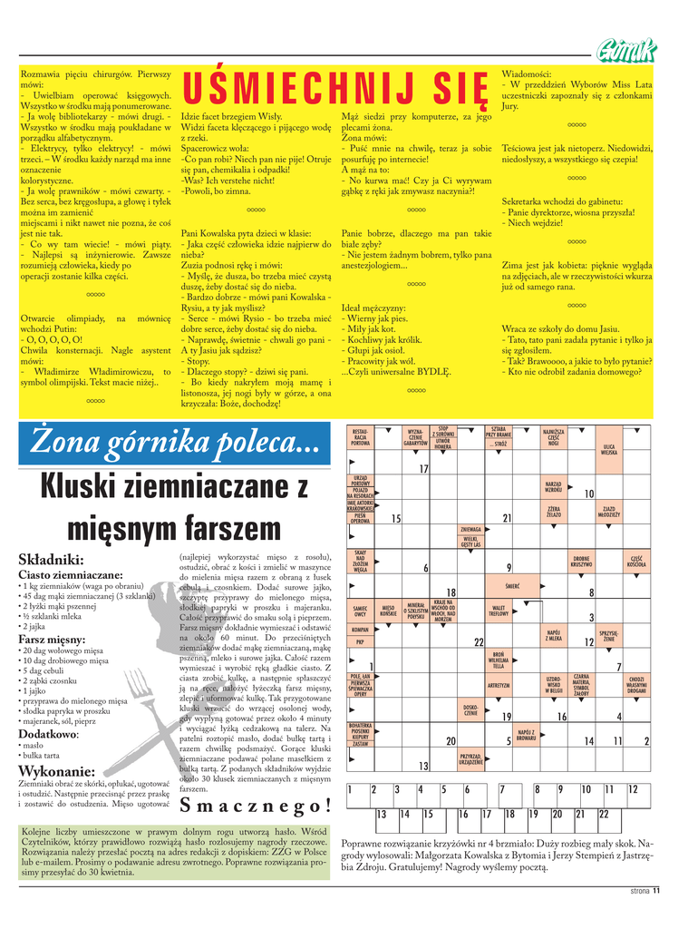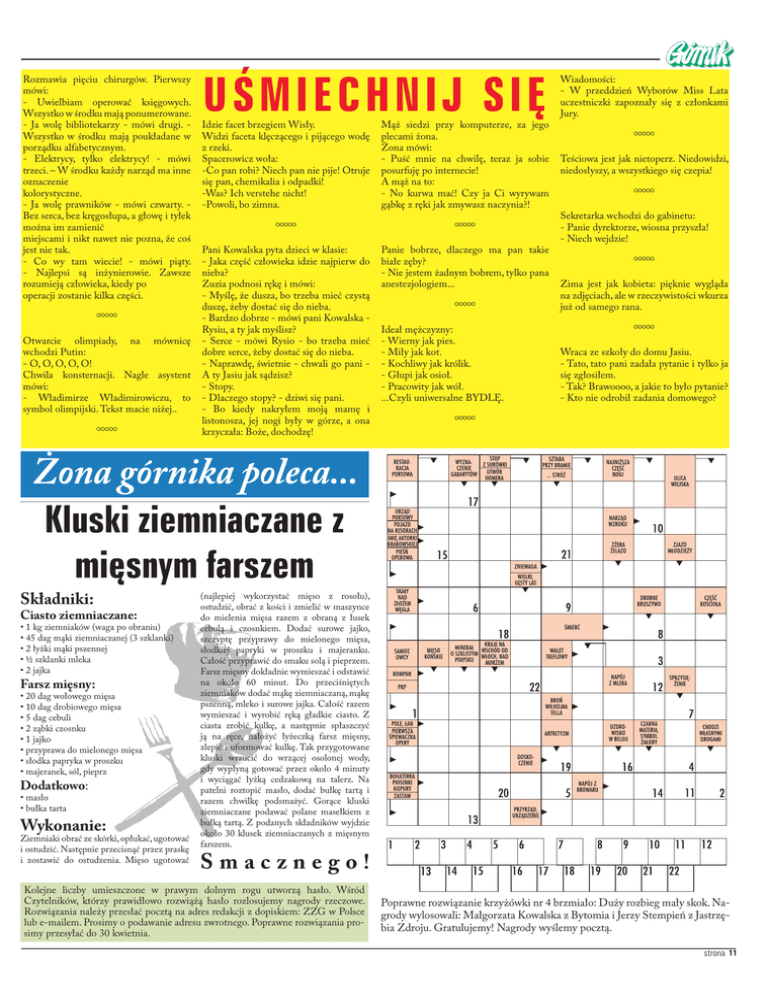 Rozmawia pięciu chirurgów. Pierwszy mówi: - Uwielbiam operować księgowych. Wszystko w środku mają ponumerowane. - Ja wolę bibliotekarzy - mówi drugi. Wszystko w środku mają poukładane w porządku alfabetycznym. - Elektrycy, tylko elektrycy! - mówi trzeci. – W środku każdy narząd ma inne oznaczenie kolorystyczne. - Ja wolę prawników - mówi czwarty. Bez serca, bez kręgosłupa, a głowę i tyłek można im zamienić miejscami i nikt nawet nie pozna, że coś jest nie tak. - Co wy tam wiecie! - mówi piąty. - Najlepsi są inżynierowie. Zawsze rozumieją człowieka, kiedy po operacji zostanie kilka części. • Otwarcie olimpiady, na mównicę wchodzi Putin: - O, O, O, O, O! Chwila konsternacji. Nagle asystent mówi: - Władimirze Władimirowiczu, to symbol olimpijski. Tekst macie niżej.. • UŚMI ECHNI J SIĘ Idzie facet brzegiem Wisły. Widzi faceta klęczącego i pijącego wodę z rzeki. Spacerowicz woła: -Co pan robi? Niech pan nie pije! Otruje się pan, chemikalia i odpadki! -Was? Ich verstehe nicht! -Powoli, bo zimna. Mąż siedzi przy komputerze, za jego plecami żona. Żona mówi: - Puść mnie na chwilę, teraz ja sobie posurfuję po internecie! A mąż na to: - No kurwa mać! Czy ja Ci wyrywam gąbkę z ręki jak zmywasz naczynia?! Pani Kowalska pyta dzieci w klasie: - Jaka część człowieka idzie najpierw do nieba? Zuzia podnosi rękę i mówi: - Myślę, że dusza, bo trzeba mieć czystą duszę, żeby dostać się do nieba. - Bardzo dobrze - mówi pani Kowalska Rysiu, a ty jak myślisz? - Serce - mówi Rysio - bo trzeba mieć dobre serce, żeby dostać się do nieba. - Naprawdę, świetnie - chwali go pani A ty Jasiu jak sądzisz? - Stopy. - Dlaczego stopy? - dziwi się pani. - Bo kiedy nakryłem moją mamę i listonosza, jej nogi były w górze, a ona krzyczała: Boże, dochodzę! Panie bobrze, dlaczego ma pan takie białe zęby? - Nie jestem żadnym bobrem, tylko pana anestezjologiem... • • • Ideał mężczyzny: - Wierny jak pies. - Miły jak kot. - Kochliwy jak królik. - Głupi jak osioł. - Pracowity jak wół. ...Czyli uniwersalne BYDLĘ. • Wiadomości: - W przeddzień Wyborów Miss Lata uczestniczki zapoznały się z członkami Jury. • Teściowa jest jak nietoperz. Niedowidzi, niedosłyszy, a wszystkiego się czepia! • Sekretarka wchodzi do gabinetu: - Panie dyrektorze, wiosna przyszła! - Niech wejdzie! • Zima jest jak kobieta: pięknie wygląda na zdjęciach, ale w rzeczywistości wkurza już od samego rana. • Wraca ze szkoły do domu Jasiu. - Tato, tato pani zadała pytanie i tylko ja się zgłosiłem. - Tak? Brawoooo, a jakie to było pytanie? - Kto nie odrobił zadania domowego? Kluski ziemniaczane z mięsnym farszem Składniki: Ciasto ziemniaczane: • 1 kg ziemniaków (waga po obraniu) • 45 dag mąki ziemniaczanej (3 szklanki) • 2 łyżki mąki pszennej • ½ szklanki mleka • 2 jajka Farsz mięsny: • 20 dag wołowego mięsa • 10 dag drobiowego mięsa • 5 dag cebuli • 2 ząbki czosnku • 1 jajko • przyprawa do mielonego mięsa • słodka papryka w proszku • majeranek, sól, pieprz Dodatkowo: • masło • bułka tarta Wykonanie: Ziemniaki obrać ze skórki, opłukać, ugotować i ostudzić. Następnie przecisnąć przez praskę i zostawić do ostudzenia. Mięso ugotować (najlepiej wykorzystać mięso z rosołu), ostudzić, obrać z kości i zmielić w maszynce do mielenia mięsa razem z obraną z łusek cebulą i czosnkiem. Dodać surowe jajko, szczyptę przyprawy do mielonego mięsa, słodkiej papryki w proszku i majeranku. Całość przyprawić do smaku solą i pieprzem. Farsz mięsny dokładnie wymieszać i odstawić na około 60 minut. Do przeciśniętych ziemniaków dodać mąkę ziemniaczaną, mąkę pszenną, mleko i surowe jajka. Całość razem wymieszać i wyrobić ręką gładkie ciasto. Z ciasta zrobić kulkę, a następnie spłaszczyć ją na ręce, nałożyć łyżeczką farsz mięsny, zlepić i uformować kulkę. Tak przygotowane kluski wrzucić do wrzącej osolonej wody, gdy wypłyną gotować przez około 4 minuty i wyciągać łyżką cedzakową na talerz. Na patelni roztopić masło, dodać bułkę tartą i razem chwilkę podsmażyć. Gorące kluski ziemniaczane podawać polane masełkiem z bułką tartą. Z podanych składników wyjdzie około 30 klusek ziemniaczanych z mięsnym farszem. Smacznego! Kolejne liczby umieszczone w prawym dolnym rogu utworzą hasło. Wśród Czytelników, którzy prawidłowo rozwiążą hasło rozlosujemy nagrody rzeczowe. Rozwiązania należy przesłać pocztą na adres redakcji z dopiskiem: ZZG w Polsce lub e-mailem. Prosimy o podawanie adresu zwrotnego. Poprawne rozwiązania prosimy przesyłać do 30 kwietnia. Poprawne rozwiązanie krzyżówki nr 4 brzmiało: Duży rozbieg mały skok. Nagrody wylosowali: Małgorzata Kowalska z Bytomia i Jerzy Stempień z Jastrzębia Zdroju. Gratulujemy! Nagrody wyślemy pocztą. strona 11