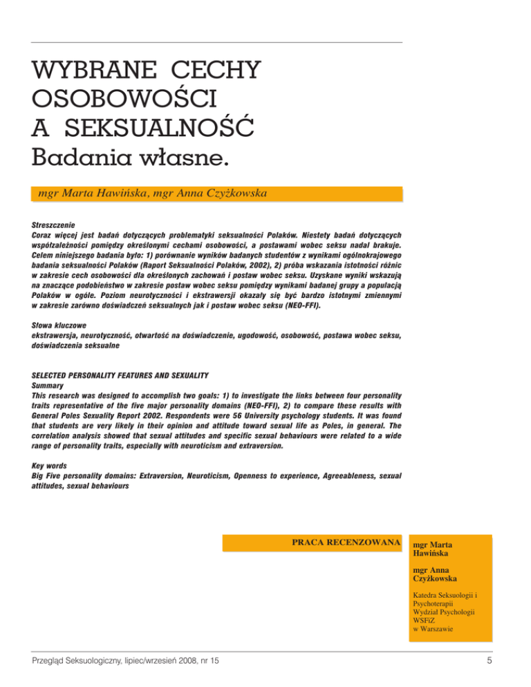 WYBRANE CECHY OSOBOWOÂCI A SEKSUALNOÂå Badania w∏asne. mgr Marta Hawiƒska, mgr Anna Czy˝kowska Streszczenie Coraz wi´cej jest badaƒ dotyczàcych problematyki seksualnoÊci Polaków. Niestety badaƒ dotyczàcych wspó∏zale˝noÊci pomi´dzy okreÊlonymi cechami osobowoÊci, a postawami wobec seksu nadal brakuje. Celem niniejszego badania by∏o: 1) porównanie wyników badanych studentów z wynikami ogólnokrajowego badania seksualnoÊci Polaków (Raport SeksualnoÊci Polaków, 2002), 2) próba wskazania istotnoÊci ró˝nic w zakresie cech osobowoÊci dla okreÊlonych zachowaƒ i postaw wobec seksu. Uzyskane wyniki wskazujà na znaczàce podobieƒstwo w zakresie postaw wobec seksu pomi´dzy wynikami badanej grupy a populacjà Polaków w ogóle. Poziom neurotycznoÊci i ekstrawersji okaza∏y si´ byç bardzo istotnymi zmiennymi w zakresie zarówno doÊwiadczeƒ seksualnych jak i postaw wobec seksu (NEO-FFI). S∏owa kluczowe ekstrawersja, neurotycznoÊç, otwartoÊç na doÊwiadczenie, ugodowoÊç, osobowoÊç, postawa wobec seksu, doÊwiadczenia seksualne SELECTED PERSONALITY FEATURES AND SEXUALITY Summary This research was designed to accomplish two goals: 1) to investigate the links between four personality traits representative of the five major personality domains (NEO-FFI), 2) to compare these results with General Poles Sexuality Report 2002. Respondents were 56 University psychology students. It was found that students are very likely in their opinion and attitude toward sexual life as Poles, in general. The correlation analysis showed that sexual attitudes and specific sexual behaviours were related to a wide range of personality traits, especially with neuroticism and extraversion. Key words Big Five personality domains: Extraversion, Neuroticism, Openness to experience, Agreeableness, sexual attitudes, sexual behaviours PRACA RECENZOWANA mgr Marta Hawiƒska mgr Anna Czy˝kowska Katedra Seksuologii i Psychoterapii Wydzia∏ Psychologii WSFiZ w Warszawie Przeglàd Seksuologiczny, lipiec/wrzesieƒ 2008, nr 15 5 SeksualnoÊç Polaków W sferze seksualnoÊci mieszczà si´ wszelkie aspekty p∏ciowoÊci cz∏owieka, jego potrzeby seksualne, emocje zwiàzane z ˝yciem nie tylko cielesnym, ale i duchowym, postawy wobec seksu, oraz relacje z innymi ludêmi, a tak˝e resztà otaczajàcego Êwiata. Zajmujàc si´ ˝yciem seksualnym nale˝y pami´taç, ˝e uwzgl´dnia si´ nie tylko aspekty medyczne i socjologiczne, ale równie˝, jeÊli nie przede wszystkim psychologiczne. Wnioski generalne p∏ynàce z Raportu SeksualnoÊci Polaków (Lew-Starowicz 2002) dotyczà nast´pujàcych obszarów zmian, które zasz∏y na przestrzeni 10 lat. Polacy mniejszà wag´ przywiàzujà do znaczenia dziewictwa kobiety oraz nie wià˝à seksu z instytucjà ma∏˝eƒskà. Zaobserwowano wzrost seksualnej aktywnoÊci przedma∏˝eƒskiej, wzrost roli ciekawoÊci jako g∏ównego motywu rozpocz´cia wspó∏˝ycia, a tak˝e wy˝szà akceptacj´ seksu przedma∏˝eƒskiego przez osoby m∏ode. Polacy wy˝ej oceniajà bliskoÊç kontaktów z rówieÊnikami w dzieciƒstwie. Zmniejszy∏ si´ odsetek osób przekonanych o grzesznoÊci cia∏a i seksu, bardziej pozytywne uczucia towarzyszà masturbacji. Polacy ch´tniej si´gajà po Êrodki antykoncepcyjne i cz´Êciej uprawiajà seks. Ponadto lepiej oceniamy przebieg pierwszego stosunku seksualnego oraz wzajemnoÊç uczuciowà w sta∏ych zwiàzkach. Równie ciekawych danych dostarczajà komparatywne badania Izdebskiego (2003). Porówna∏ on wyniki badaƒ w∏asnych dotyczàcych seksualnoÊci i postaw dotyczàcych seksu Polaków na przestrzeni 4 lat. Okazuje si´, ˝e dla 67% osób badanych, które prowadzà ˝ycie seksualne seks odgrywa zdecydowanie istotnà bàdê istotnà rol´, a dla 23% Êrednio istotnà. Wiek inicjacji seksualnej jest nieco ni˝szy w badaniach z 2001 i wynosi 19,1 dla Polek i 18,3 dla Polaków. Natomiast Êrednia liczba partnerów seksualnych wynosi 4 i wi´cej dla populacji do 49 roku ˝ycia. Nale˝y zwróciç uwag´ na spadek o 5 punktów odsetka badanych, którzy aktualnie nie posiadajà partnera – z 12% na 17%. Jednak˝e a˝ 60% badanych pozostajàcych w zwiàzku uwa˝a, ˝e pozostanie ze swoim partnerem na zawsze. Najpopularniejszymi Êrodkam antykoncepcyjnymi wÊród osób m∏odych sà prezerwatywy i hormonalne tabletki antykoncepcyjne. 6 W badaniu z 1997 roku kiedykolwiek prezerwatywy u˝y∏o 56% respondentów, w 2002 r. ju˝ 64%. Wed∏ug badanych wadami stosowania prezerwatywy sà mniej przyjemne wspó∏˝ycie – 62% oraz poczucie dyskomfortu – 45%. JeÊli chodzi o postawy Polaków wobec edukacji seksualnej, w 1997 roku 88% badanych uwa˝a∏o, ˝e w szko∏ach powinno prowadziç si´ zaj´cia wychowania seksualnego, 4 lata póêniej ju˝ 91%. OsobowoÊç W wi´kszoÊci badaƒ dotyczàcych zmiennych osobowoÊciowych pojawiajà si´ poj´cia neurotycznoÊci oraz ekstrawersji. Poj´cie neurotycznoÊci i ekstrawersji wprowadzi∏ Eysenck, nazywajàc je czynnikami nadrz´dnymi bàdê te˝ superczynnikami (1970). NeurotycznoÊç rozumia∏ on jako cech´ osobowoÊci, którà tworzy uk∏ad nast´pujàcych czynników: l´k, przygn´bienie, poczucie winy, niska samoocena i napi´cie. Ekstrawersja, równie˝ jako cecha osobowoÊci obejmuje takie czynniki jak: towarzyskoÊç, ˝ywoÊç, aktywnoÊç, asertywnoÊç i poszukiwanie doznaƒ. Tak rozumiane poj´cia neurotycznoÊci i ekstrawersji sà tak˝e zbli˝one definicyjnie do dwubiegunowych czynników Cattela: nerwicowoÊci i ekspansywnoÊci (Cattel, 1957) Syntez´ powy˝szych podejÊç w rozumieniu poj´cia osobowoÊci podj´li Costa i McCrae (1993, za: Zawadzki, Strelau, Szczepaniak, Âliwiƒska 1998), poczàtkowo tworzàc trzyczynnikowy model cech osobowoÊci, by w efekcie stworzyç pi´cioczynnikowy model, nazwany „Wielkà Piàtkà” (ang. Big Five). Obejmuje on neurotycznoÊç, ekstrawersj´, ugodowoÊç, otwartoÊç na doÊwiadczenie i sumiennoÊç. Neurotyczno