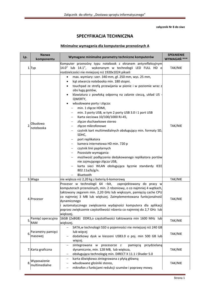 Załącznik do oferty: „Dostawa sprzętu informatycznego” załącznik Nr 8 do siwz SPECYFIKACJA TECHNICZNA Minimalne wymagania dla komputerów przenośnych A Lp. Nazwa komponentu Wymagane minimalne parametry techniczne komputerów Komputer przenośny typu notebook z ekranem antyrefleksyjnym 14.0” lub 14.1”, wykonanym w technologii LED FULL HD o rozdzielczości nie mniejszej niż 1920x1024 pikseli max. wymiary: szer. 340 mm, gł. 250 mm, wys. 25 mm, kąt otwarcia notebooka min. 180 stopni. touchpad ze strefą przewijania w pionie i w poziomie wraz z obs ługą gestów, klawiatura z powłoką odporną na zalanie cieczą, układ US QWERTY, wbudowane porty i złącza: min. 1 złącze HDMI, min. 3 porty USB, w tym 2 porty USB 3.0 i 1 port USB Karta sieciowa 10/100/1000 RJ-45, złącze słuchawkowe stereo Obudowa 2. złącze mikrofonowe notebooka czytnik kart multimedialnych obsługujący min. formaty SD, SDHC, port replikatora kamera internetowa HD min. 720 p czytnik linii papilarnych Pozostałe wymagania: możliwość podłączenia dedykowanego replikatora portów nie zajmującego złącza USB, karta sieci WLAN obsługująca łącznie standardy IEEE 802.11a/b/g/n. Bluetooth 3. Waga nie większa niż 2,20 kg z baterią 6-komorową Procesor w technologii 64 –bit, zaprojektowany do pracy w komputerach przenośnych, min. 2 rdzeniowy, o co najmniej 4 wątkach, taktowany zegarem min. 2,20 GHz lub większym, pamięcią cache CPU co najmniej 3 MB lub większej. Zaimplementowana funkcjonalność 4. Procesor dynamicznego i automatycznego zwiększenia wydajności komputera dla aplikacji poprzez zwiększenie częstotliwości rdzenia co najmniej do 2,7 GHz lub większej. Pamięć operacyjna 16GB (2x8GB) DDR3,o częstotliwości taktowania min 1600 MHz lub 5. RAM większej. SATA,w technologii SSD o pojemności nie mniejszej niż 240 GB Parametry pamięci lub więcej 6. masowej dodatkowy dysk w kieszeni USB3.0 o poj. min 500 GB lub więcej. zintegrowana w procesorze z pamięcią przydzielaną 7. Karta graficzna dynamicznie, min. 128 MB, lub większa, obsługująca technologię min. DIRECT X 11.1 i Shader 5.0 karta dźwiękowa zintegrowana z płytą główną Wyposażenie 8. wbudowane głośniki stereo, multimedialne mikrofon z funkcjami redukcji szumów i poprawy mowy. 1. Typ SPEŁNIENIE WYMAGAŃ *** TAK/NIE TAK/NIE TAK/NIE TAK/NIE TAK/NIE TAK/NIE TAK/NIE TAK/NIE Strona 1 Załącznik do oferty: „Dostawa sprzętu informatycznego” Nazwa komponentu Lp. Wymagane minimalne parametry techniczne komputerów Wymagania 9. dotyczące baterii i zasilania 10. Oprogramowanie systemowe 11. Oprogramowanie użytkowe Wymagania 12. dotyczące bezpieczeństwa 13. inne wymagania 14. Warunki gwarancji SPEŁNIENIE WYMAGAŃ *** min. 6 komorowa, lub więcej, umożliwiająca pracę co najmniej przez 3 godz. bez podłączania zew. źródła zasilania Li-Ion zasilany z sieci 230 V Microsoft Windows 8.1 Pro lub równoważny system operacyjny o wymaganych następujących cechach: licencja: jednostanowiskowa. możliwość pracy z aplikacjami 32 i 64 bitowymi możliwość pracy z aplikacjami wykorzystującymi technologię DirectX 11 obsługa przyłączania do domen wbudowana technologia szyfrowania dysków oraz pamięci wymiennych możliwość dokonywania bezpłatnej aktualizacji i poprawek systemu instalator dostarczony na nośniku penDRIVE Pakiet biurowy Microsoft OFFICE 2013 min. Edytor tekstu Arkusz kalkulacyjny Program do obsługi poczty elektronicznej Program do przygotowania prezentacji Program do sporządzania szybkich notatek Licencja na pakiet MS OFFICE 2013 MOLP GOV Zintegrowany z płytą główną dedykowany układ sprzętowy służący do tworzenia i zarządzania wygenerowanymi przez komputer kluczami szyfrowania. Złącze typu Kensington Lock. Laptop musi być fabrycznie nowy, tj. nie używany przed dniem dostawy, Nie może być typu remarked, Na obudowie musi posiadać symbol CE. Do laptopa dołączony pokrowiec lub torba transportowa, Do laptopa dołączona bezprzewodowa mysz w technologii laserowej Do laptopa dołączony replikator portów, umożliwiający podłączanie przewodem zasilającym do portu replikatora w laptopie, wyposażony w następujące porty: min. 2x USB 2.0 lub więcej, min. 2x USB 3.0 lub więcej, 1x mikrofon/słuchawki, min. 1 x HDMI lub więcej, 1 x RJ 45 door to door TAK/NIE TAK/NIE TAK/NIE TAK/NIE TAK/NIE TAK/NIE Wymagania odnośnie parametrów należy rozumieć jako minimalne *** niewłaściwe skreślić Strona 2 Załącznik do oferty: „Dostawa sprzętu informatycznego” Minimalne wymagania dla komputera przenośnego B Lp. Nazwa komponentu Wymagane minimalne parametry techniczne komputerów Komputer przenośny typu notebook z ekranem błyszczącym o przekątnej 13,3”, o rozdzielczości 1280x800 pixeli podświetlany diodami LED Procesor w technologii 64 –bit, zaprojektowany do pracy w komputerach przenośnych, min. 2 rdzeniowy, o co najmniej 4 wątkach, taktowany zegarem min. 2,50 GHz lub większym, pamięcią cache CPU 2. Procesor co najmniej 3 MB lub większej. Zaimplementowana funkcjonalność dynamicznego i automatycznego zwiększenia wydajności komputera dla aplikacji poprzez zwiększenie częstotliwości rdzenia . Zainstalowań pamięć RAM 4GB DDR3,o częstotliwości taktowania min Pamięć operacyjna 3. 1600 MHz lub większej. RAM Płyta główna musi umożliwiać rozbudowę do 8GB RAM Parametry pamięci SATA, o pojemności nie mniejszej niż 500 GB 4. masowej 5400 obr./min. Karta graficzna zintegrowana, obsługująca technologię min. 5. Karta graficzna DIRECT X 11.1 i Shader 5.0 karta dźwiękowa zintegrowana z płytą główną Wyposażenie wbudowane głośniki stereo, 6. multimedialne wbudowany mikrofon. Kamera HD 720p Interfejs sieci bezprzewodowej Wi-Fi 802.11ac; zgodny z IEEE 802.11a/b/g/n Interfejs bezprzewodowy Bluetooth 4.0 Port Gigabit Ethernet Port FireWire 800 (do 800 Mb/s) Dwa porty USB 3 (do 5 Gb/s) Port Thunderbolt (do 10 Gb/s) Wejście/wyjście liniowe