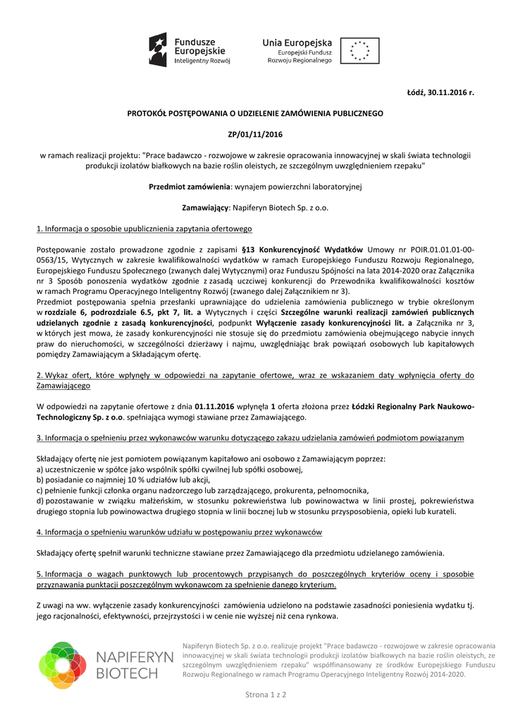 Łódź, 30.11.2016 r. PROTOKÓŁ POSTĘPOWANIA O UDZIELENIE ZAMÓWIENIA PUBLICZNEGO ZP/01/11/2016 w ramach realizacji projektu: "Prace badawczo - rozwojowe w zakresie opracowania innowacyjnej w skali świata technologii produkcji izolatów białkowych na bazie roślin oleistych, ze szczególnym uwzględnieniem rzepaku" Przedmiot zamówienia: wynajem powierzchni laboratoryjnej Zamawiający: Napiferyn Biotech Sp. z o.o. 1. Informacja o sposobie upublicznienia zapytania ofertowego Postępowanie zostało prowadzone zgodnie z zapisami §13 Konkurencyjność Wydatków Umowy nr POIR.01.01.01-000563/15, Wytycznych w zakresie kwalifikowalności wydatków w ramach Europejskiego Funduszu Rozwoju Regionalnego, Europejskiego Funduszu Społecznego (zwanych dalej Wytycznymi) oraz Funduszu Spójności na lata 2014-2020 oraz Załącznika nr 3 Sposób ponoszenia wydatków zgodnie z zasadą uczciwej konkurencji do Przewodnika kwalifikowalności kosztów w ramach Programu Operacyjnego Inteligentny Rozwój (zwanego dalej Załącznikiem nr 3). Przedmiot postępowania spełnia przesłanki uprawniające do udzielenia zamówienia publicznego w trybie określonym w rozdziale 6, podrozdziale 6.5, pkt 7, lit. a Wytycznych i części Szczególne warunki realizacji zamówień publicznych udzielanych zgodnie z zasadą konkurencyjności, podpunkt Wyłączenie zasady konkurencyjności lit. a Załącznika nr 3, w których jest mowa, że zasady konkurencyjności nie stosuje się do przedmiotu zamówienia obejmującego nabycie innych praw do nieruchomości, w szczególności dzierżawy i najmu, uwzględniając brak powiązań osobowych lub kapitałowych pomiędzy Zamawiającym a Składającym ofertę. 2. Wykaz ofert, które wpłynęły w odpowiedzi na zapytanie ofertowe, wraz ze wskazaniem daty wpłynięcia oferty do Zamawiającego W odpowiedzi na zapytanie ofertowe z dnia 01.11.2016 wpłynęła 1 oferta złożona przez Łódzki Regionalny Park NaukowoTechnologiczny Sp. z o.o. spełniająca wymogi stawiane przez Zamawiającego. 3. Informacja o spełnieniu przez wykonawców warunku dotyczącego zakazu udzielania zamówień podmiotom powiązanym Składający ofertę nie jest pomiotem powiązanym kapitałowo ani osobowo z Zamawiającym poprzez: a) uczestniczenie w spółce jako wspólnik spółki cywilnej lub spółki osobowej, b) posiadanie co najmniej 10 % udziałów lub akcji, c) pełnienie funkcji członka organu nadzorczego lub zarządzającego, prokurenta, pełnomocnika, d) pozostawanie w związku małżeńskim, w stosunku pokrewieństwa lub powinowactwa w linii prostej, pokrewieństwa drugiego stopnia lub powinowactwa drugiego stopnia w linii bocznej lub w stosunku przysposobienia, opieki lub kurateli. 4. Informacja o spełnieniu warunków udziału w postępowaniu przez wykonawców Składający ofertę spełnił warunki techniczne stawiane przez Zamawiającego dla przedmiotu udzielanego zamówienia. 5. Informacja o wagach punktowych lub procentowych przypisanych do poszczególnych kryteriów oceny i sposobie przyznawania punktacji poszczególnym wykonawcom za spełnienie danego kryterium. Z uwagi na ww. wyłączenie zasady konkurencyjności zamówienia udzielono na podstawie zasadności poniesienia wydatku tj. jego racjonalności, efektywności, przejrzystości i w cenie nie wyższej niż cena rynkowa. Napiferyn Biotech Sp. z o.o. realizuje projekt "Prace badawczo - rozwojowe w zakresie opracowania innowacyjnej w skali świata technologii produkcji izolatów białkowych na bazie roślin oleistych, ze szczególnym uwzględnieniem rzepaku" współfinansowany ze środków Europejskiego Funduszu Rozwoju Regionalnego w ramach Programu Operacyjnego Inteligentny Rozwój 2014-2020. Strona 1 z 2 6. Wskazanie wybranej oferty wraz z uzasadnieniem wyboru Postępowanie ZP/01/11/2016 o udzielenie zamówienia publicznego zostało zakończone dn. 30.11.2016 wynikiem pozytywnym. Wybrano ofertę i zamówienie zostało udzielone: ŁÓDZKIEMU REGIONALNEMU PARKOWI NAUKOWOTECHNOLOGICZNEMU SP. Z O.O., który składając ofertę zaproponował wykonanie zamówienia na następujących warunkach: 2 stawka 54,00 zł netto / 1 m najmu i eksploatacji powierzchni laboratoryjno-biurowej, Składającej się z pomieszczeń nr 2 2.73/2.74/2.76/2.77 o powierzchni użytkowej 128,60 m . Oferta spełnia warunki Zamawiającego, aby wydatek był: 1) racjonalny - dostęp do powierzchni laboratoryjnej znajduje się w miejscu siedziby spółki (Łódź), co zapewnia najlepszy możliwy dostęp do infrastruktury i stały nadzór nad prowadzonym procesem badawczym przez pracowników, 2) efektywny – zaproponowana cena odzwierciedla jakość powierzchni laboratoryjnej, 3) przejrzysty – procedurę wyboru udokumentowano ogłoszeniem i protokołem wyboru podanymi do publicznej wiadomości, 4) po cenie nie wyższej niż cena rynkowa – cena z oferty nie odbiega znacząco od średniej cen wynikających z przeprowadzonego rozeznania rynku. 7. Data sporządzenia protokołu i podpis Zamawiającego Łódź, 30.11.2016 r. 8. Załączniki a. złożona oferta, b. oświadczenia o braku powiązań Zamawiającego i Składającego ofertę, podpisane przez osoby upoważnione. Napiferyn Biotech Sp. z o.o. realizuje projekt "Prace badawczo - rozwojowe w zakresie opracowania innowacyjnej w skali świata technologii produkcji izolatów białkowych na bazie roślin oleistych, ze szczególnym uwzględnieniem rzepaku" współfinansowany ze środków Europejskiego Funduszu Rozwoju Regionalnego w ramach Programu Operacyjnego Inteligentny Rozwój 2014-2020. Strona 2 z 2