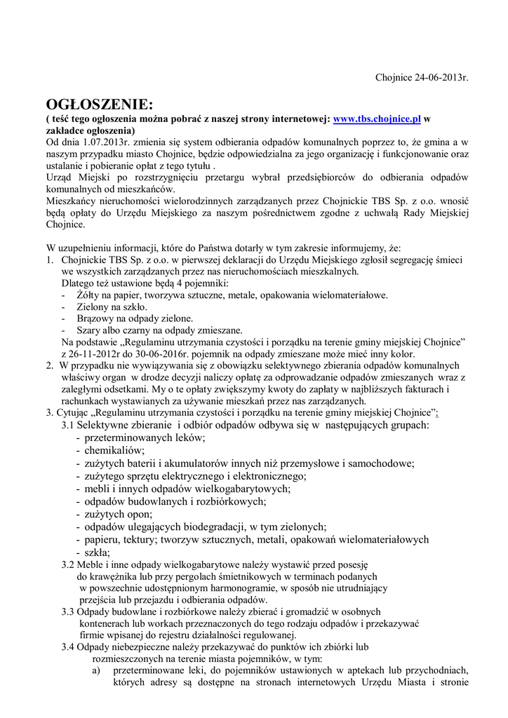 Chojnice 24-06-2013r. OGŁOSZENIE: ( teść tego ogłoszenia można pobrać z naszej strony internetowej: www.tbs.chojnice.pl w zakładce ogłoszenia) Od dnia 1.07.2013r. zmienia się system odbierania odpadów komunalnych poprzez to, że gmina a w naszym przypadku miasto Chojnice, będzie odpowiedzialna za jego organizację i funkcjonowanie oraz ustalanie i pobieranie opłat z tego tytułu . Urząd Miejski po rozstrzygnięciu przetargu wybrał przedsiębiorców do odbierania odpadów komunalnych od mieszkańców. Mieszkańcy nieruchomości wielorodzinnych zarządzanych przez Chojnickie TBS Sp. z o.o. wnosić będą opłaty do Urzędu Miejskiego za naszym pośrednictwem zgodne z uchwałą Rady Miejskiej Chojnice. W uzupełnieniu informacji, które do Państwa dotarły w tym zakresie informujemy, że: 1. Chojnickie TBS Sp. z o.o. w pierwszej deklaracji do Urzędu Miejskiego zgłosił segregację śmieci we wszystkich zarządzanych przez nas nieruchomościach mieszkalnych. Dlatego też ustawione będą 4 pojemniki: - Żółty na papier, tworzywa sztuczne, metale, opakowania wielomateriałowe. - Zielony na szkło. - Brązowy na odpady zielone. - Szary albo czarny na odpady zmieszane. Na podstawie „Regulaminu utrzymania czystości i porządku na terenie gminy miejskiej Chojnice” z 26-11-2012r do 30-06-2016r. pojemnik na odpady zmieszane może mieć inny kolor. 2. W przypadku nie wywiązywania się z obowiązku selektywnego zbierania odpadów komunalnych właściwy organ w drodze decyzji naliczy opłatę za odprowadzanie odpadów zmieszanych wraz z zaległymi odsetkami. My o te opłaty zwiększymy kwoty do zapłaty w najbliższych fakturach i rachunkach wystawianych za używanie mieszkań przez nas zarządzanych. 3. Cytując „Regulaminu utrzymania czystości i porządku na terenie gminy miejskiej Chojnice”: 3.1 Selektywne zbieranie i odbiór odpadów odbywa się w następujących grupach: - przeterminowanych leków; chemikaliów; zużytych baterii i akumulatorów innych niż przemysłowe i samochodowe; zużytego sprzętu elektrycznego i elektronicznego; mebli i innych odpadów wielkogabarytowych; odpadów budowlanych i rozbiórkowych; zużytych opon; odpadów ulegających biodegradacji, w tym zielonych; papieru, tektury; tworzyw sztucznych, metali, opakowań wielomateriałowych szkła; 3.2 Meble i inne odpady wielkogabarytowe należy wystawić przed posesję do krawężnika lub przy pergolach śmietnikowych w terminach podanych w powszechnie udostępnionym harmonogramie, w sposób nie utrudniający przejścia lub przejazdu i odbierania odpadów. 3.3 Odpady budowlane i rozbiórkowe należy zbierać i gromadzić w osobnych kontenerach lub workach przeznaczonych do tego rodzaju odpadów i przekazywać firmie wpisanej do rejestru działalności regulowanej. 3.4 Odpady niebezpieczne należy przekazywać do punktów ich zbiórki lub rozmieszczonych na terenie miasta pojemników, w tym: a) przeterminowane leki, do pojemników ustawionych w aptekach lub przychodniach, których adresy są dostępne na stronach internetowych Urzędu Miasta i stronie Regionalnej Instalacji Przetwarzania Odpadów Komunalnych (RIPOK) w Nowym Dworze, b) zużyte baterie, do pojemników ustawionych w sklepach ze sprzętem oświetleniowym, elektrycznym, urzędach, placówkach oświatowych, biurach zarządców nieruchomości mieszkaniowych itp., c) pozostałe odpady niebezpieczne, tj. opakowania po farbach, kleje, rozpuszczalniki, aerozole, środki czyszczące, wywabiacze plam, środki do konserwacji drewna oraz opakowania po tych substancjach, sprzęt elektroniczny i elektryczny, a także lampy fluorescencyjne i akumulatory, do Punktów Zbiórki Odpadów Niebezpiecznych (PZON), których adresy są dostępne na stronach internetowych Urzędu Miejskiego i stronie RIPOK Nowy Dwór; 3.5 Zużyty sprzęt elektryczny i elektroniczny pochodzący z gospodarstw domowych należy przekazywać: a) do PZON lub RIPOK w Nowym Dworze, b) podmiotom zbierającym zużyty sprzęt elektryczny i elektroniczny, c) w sklepach w wymianie stary produkt za nowy. 3.6 Odpady zielone ulegające biodegradacji powinno się w pierwszej kolejności poddać kompostowaniu na terenie nieruchomości na której powstały, przy czym nie może to powodować uciążliwości dla użytkowników sąsiednich nieruchomości lub jeżeli kompostowanie jest niemożliwe należy gromadzić w workach lub innych pojemnikach i przekazać przedsiębiorcy świadczącemu usługi odbioru odpadów komunalnych na terenie miasta lub do RIPOK Nowy Dwór na warunkach określonych przez prowadzącego instalację. 3.7 Opony należy wystawić przed posesję do krawężnika lub przy pergolach śmietnikowych w terminach podanych w powszechnie udostępnionym harmonogramie, w sposób nie utrudniający przejścia lub przejazdu i odbierania odpadów. 4. Punkt Zbierania Odpadów Niebezpiecznych znajduje się w Nowym Dworze i działa pod nazwą Punkt Selektywnego Zbierania Odpadów Komunalnych. Czynny jest w dni robocze od 7.00 do 16.00. W punkcie tym przyjmowane są odpady wytworzone przez osoby fizyczne zameldowane na terenie gminy Chojnice. REGULAMIN FUNKCJONOWANIA GMINNEGO PUNKTU SELEKTYWNEGO ZBIERANIA ODPADÓW KOMUNALNYCH NA TERENIE ZAKŁADU ZAGOSPODAROWANIA ODPADÓW NOWY DWÓR Sp. z o.o. DLA MIESZKAŃCÓW GMINY CHOJNICE zamieszczony jest pod adresem internetowym: www.zzonowydwór.pl - zakładka : Regulaminy - plik: Regulamin SZOK 5. Co gdzie wrzucać podajemy na kolejnej stronie ? Informacje tam zawarte pochodzą z informatorów jakie otrzymali Państwo od Pana Burmistrza uzupełnione o wiedzę jaką uzyskaliśmy z odpowiedzi na nasze pytania do Urzędu Miasta Chojnice. Żółty pojemnik PAPIER, TWORZYWA SZTUCZNE, METALE, OPAKOWANIA WIELOMATERIAŁOWE Zielony pojemnik Brązowy pojemnik Szary albo czarny pojemnik SZKŁO ODPADY ZIELONE ODPADY ZMIESZANE TU WRZUCAMY: gazety i czasopisma kartony po mleku soku itp. papier szkolny i biurowy tekturę plastikowe butelki plastikowe torebki, reklam